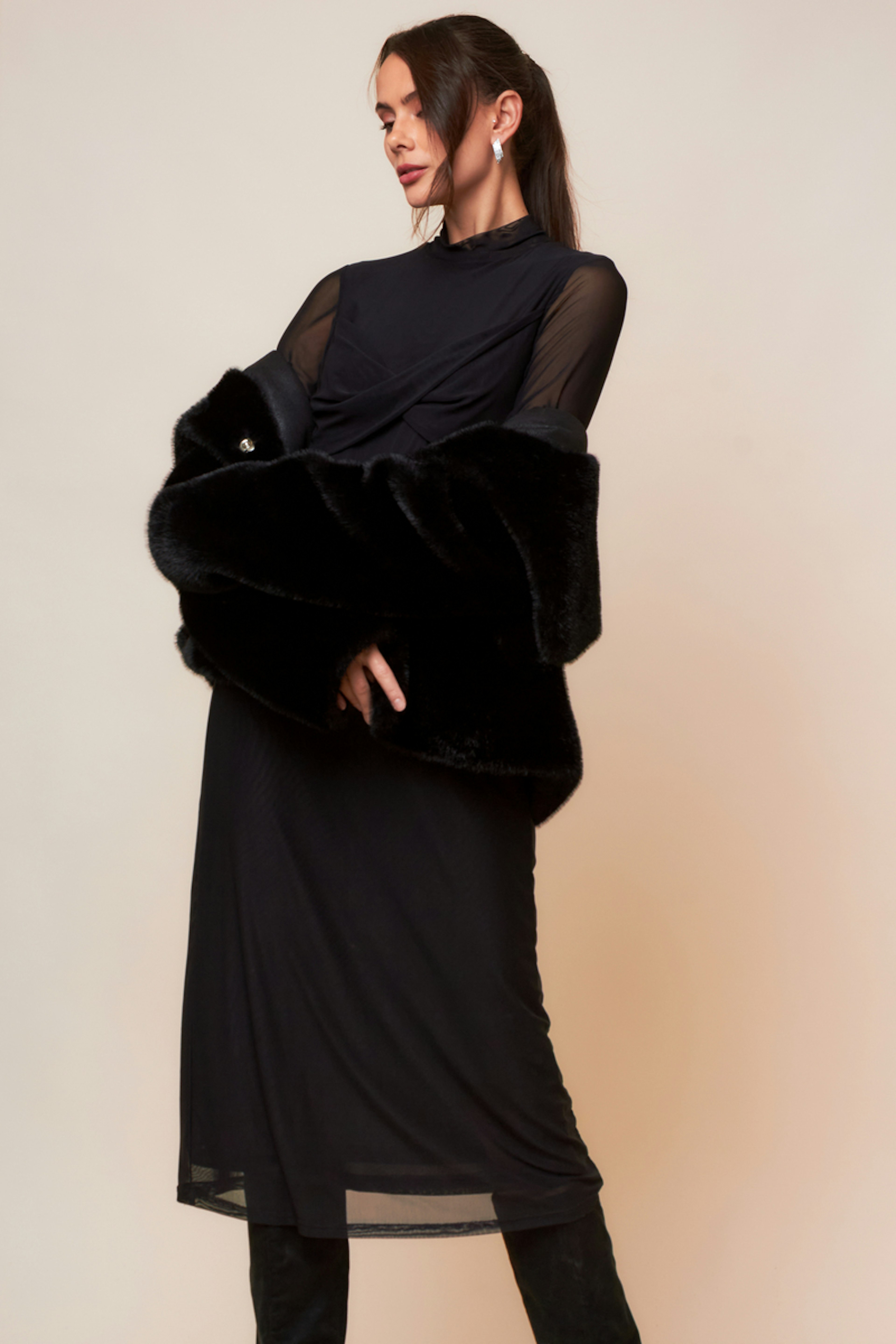 Associez cette robe avec des bottines et un manteau en fausse fourrure pour une allure chic hivernale. • Robe longue • Manches longues transparentes • Col montant élégant • Détail croisé original • Texture noire intemporelle