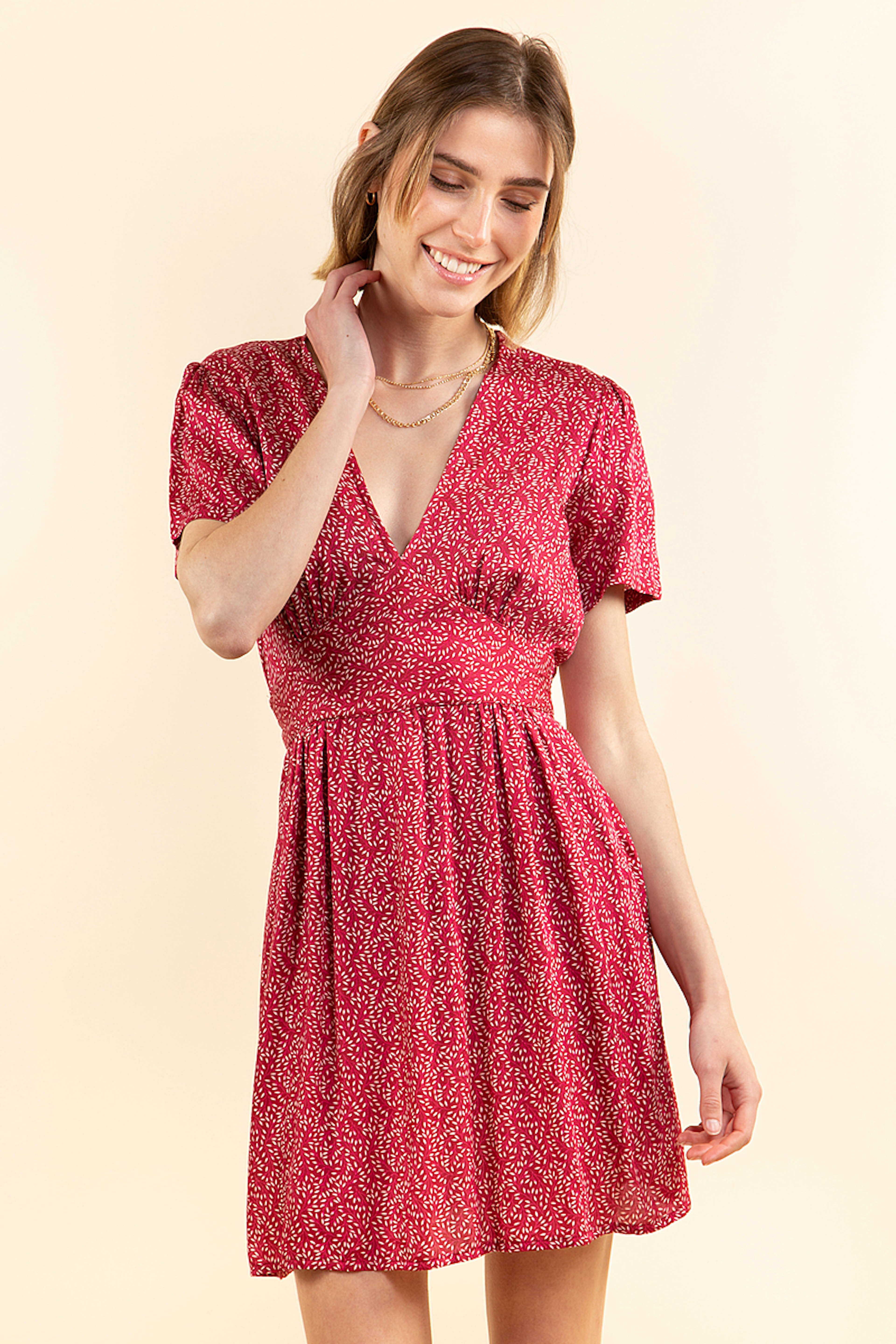 Craquez pour Eila, cette robe rouge en viscose fluide. On aime son micro-imprimรฉ et sa coupe trรจs fรฉminine.