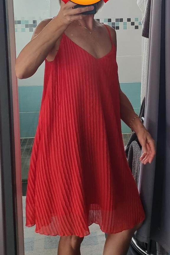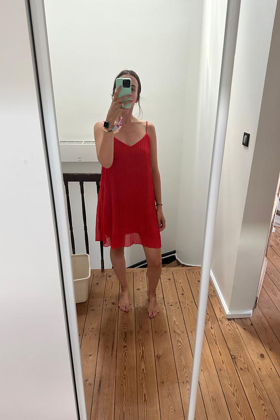 Ajoutez une touche estivale ร votre garde-robe avec cette robe plissรฉe rouge. Associez-la ร des sandales dorรฉes et un sac ร main assorti pour une tenue parfaite pour les journรฉes ensoleillรฉes. Idรฉale pour les soirรฉes d'รฉtรฉ. โข Robe courte rouge plissรฉe โข Bretelles rรฉglables โข Longueur au-dessus du genou โข Doublรฉe pour plus de confort