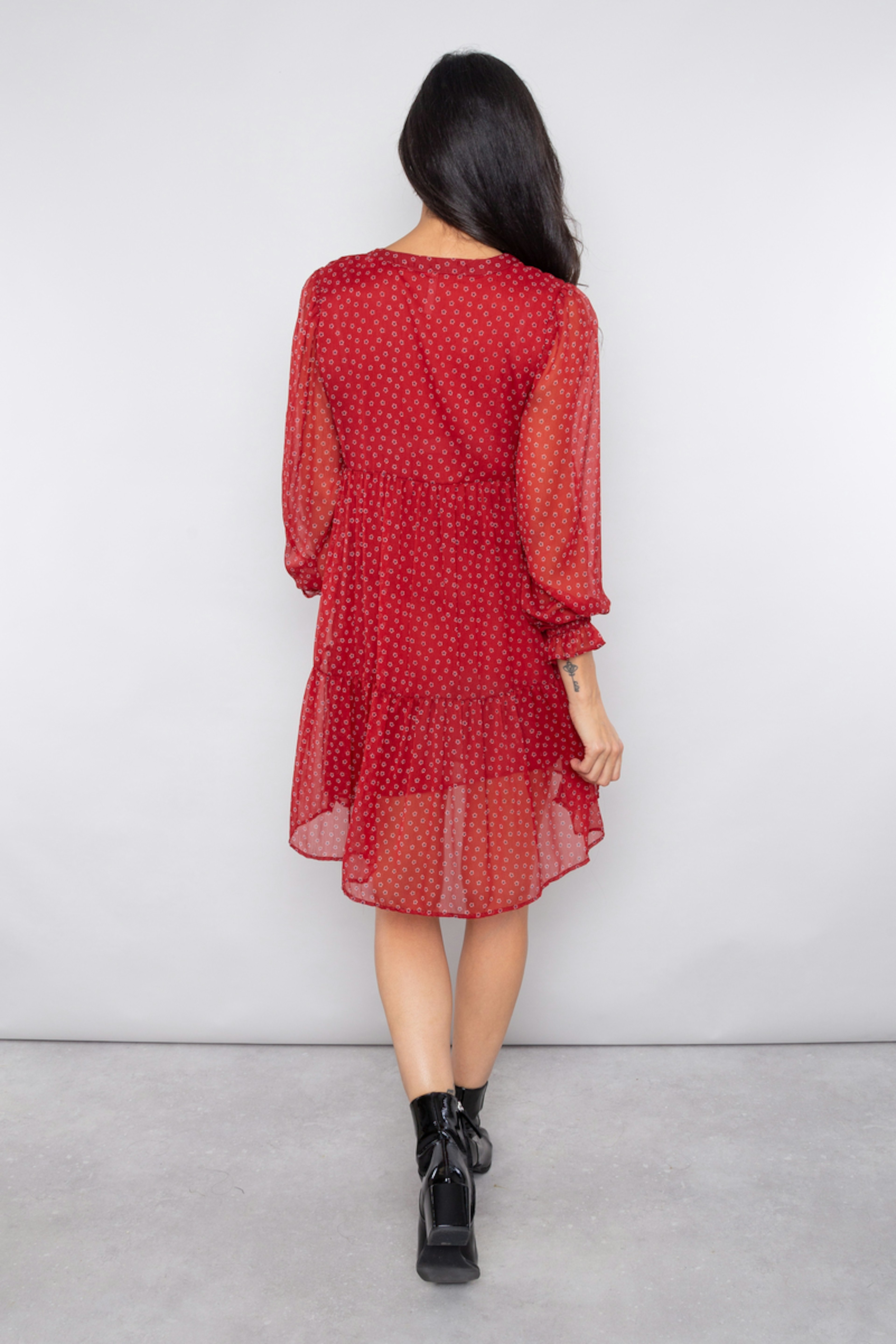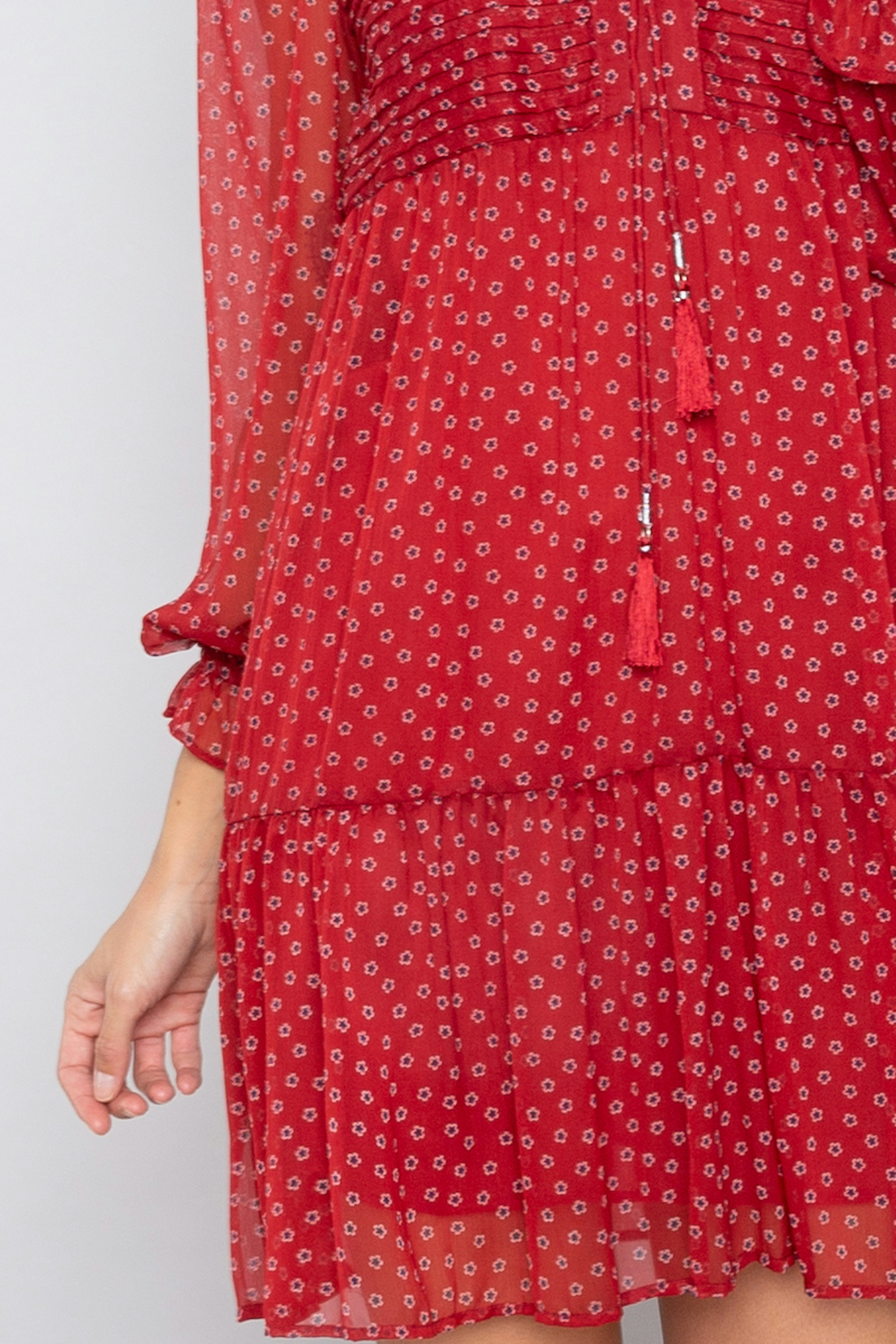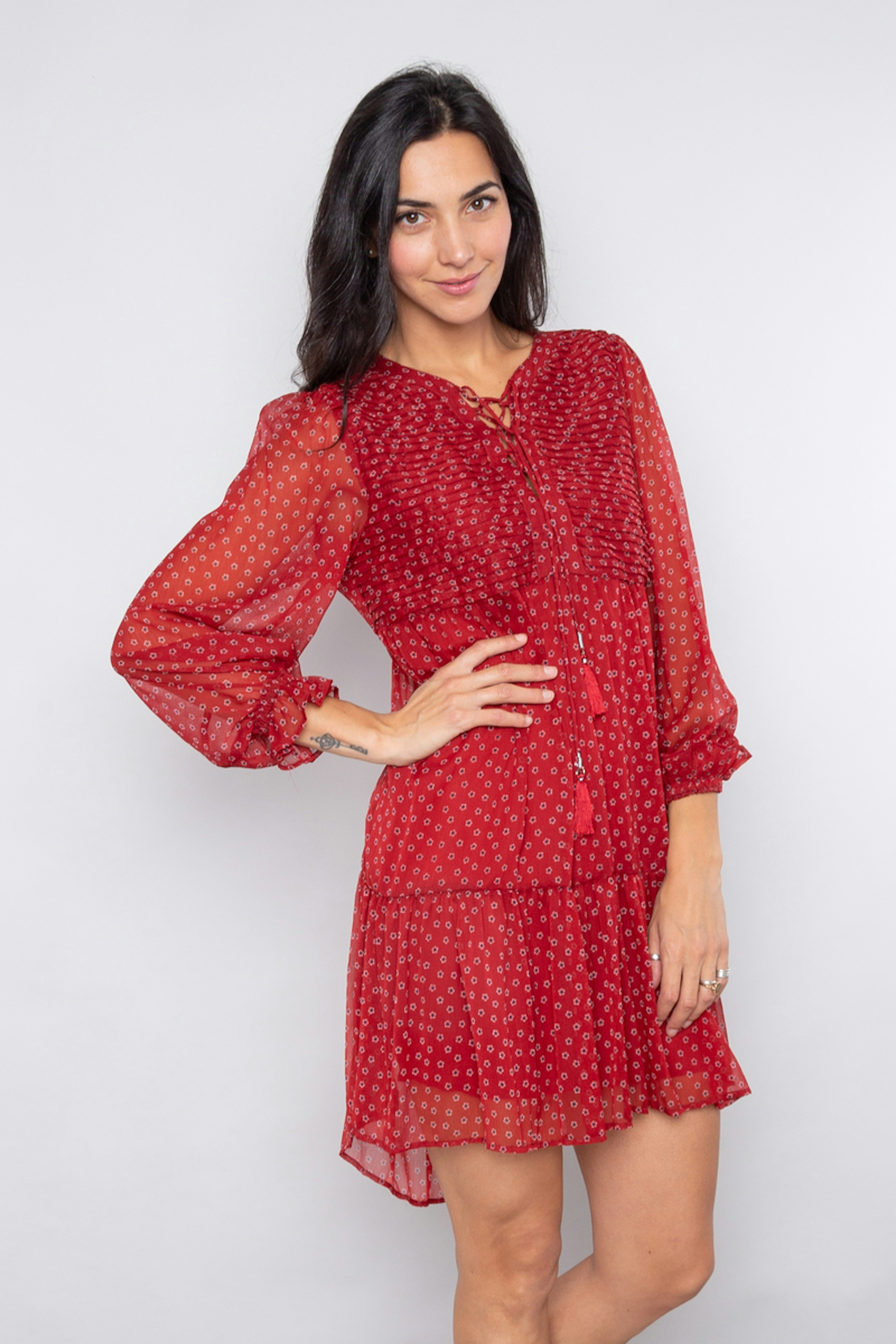 โ€ข Robe ร  manches longues en mousseline froissรฉe โ€ข Empiรจcement plissรฉ, croisรฉ ร  l'avant โ€ข Manches volumineuses et volant ร  l'ourlet
