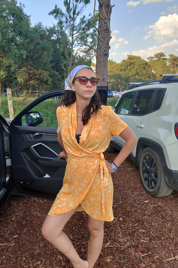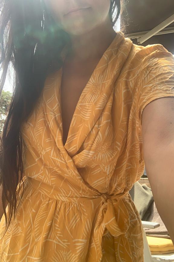 โข Robe portefeuille โข Taille montรฉe devant terminรฉe par une ceinture en matiรจre principale, nouรฉe sur le cotรฉ โข Elastiquรฉe au dos โข Pan retenu par deux boutons pressions dorรฉs invisibles โข Crรชpe de viscose imprimรฉ