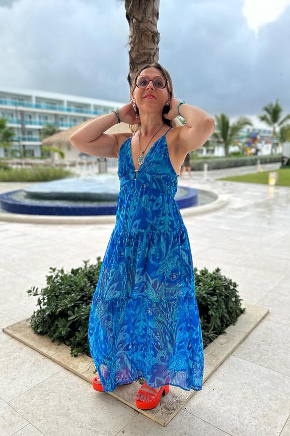 โข Robe longue bleu โข Imprimรฉs all-over fleuris โข Doublรฉe โข Sans manches, bretelles fines โข Dos nu croisรฉ โข Dรฉcolletรฉ en V plongeant avec boucle dorรฉe au centre