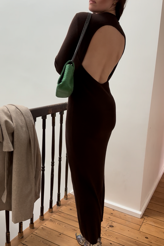Associez cette robe avec des bottines noires et des bijoux dorés pour un look chic hivernal. • Robe longue ajustée • Manches longues • Col rond • Coupe fluide • Teinte marron foncé