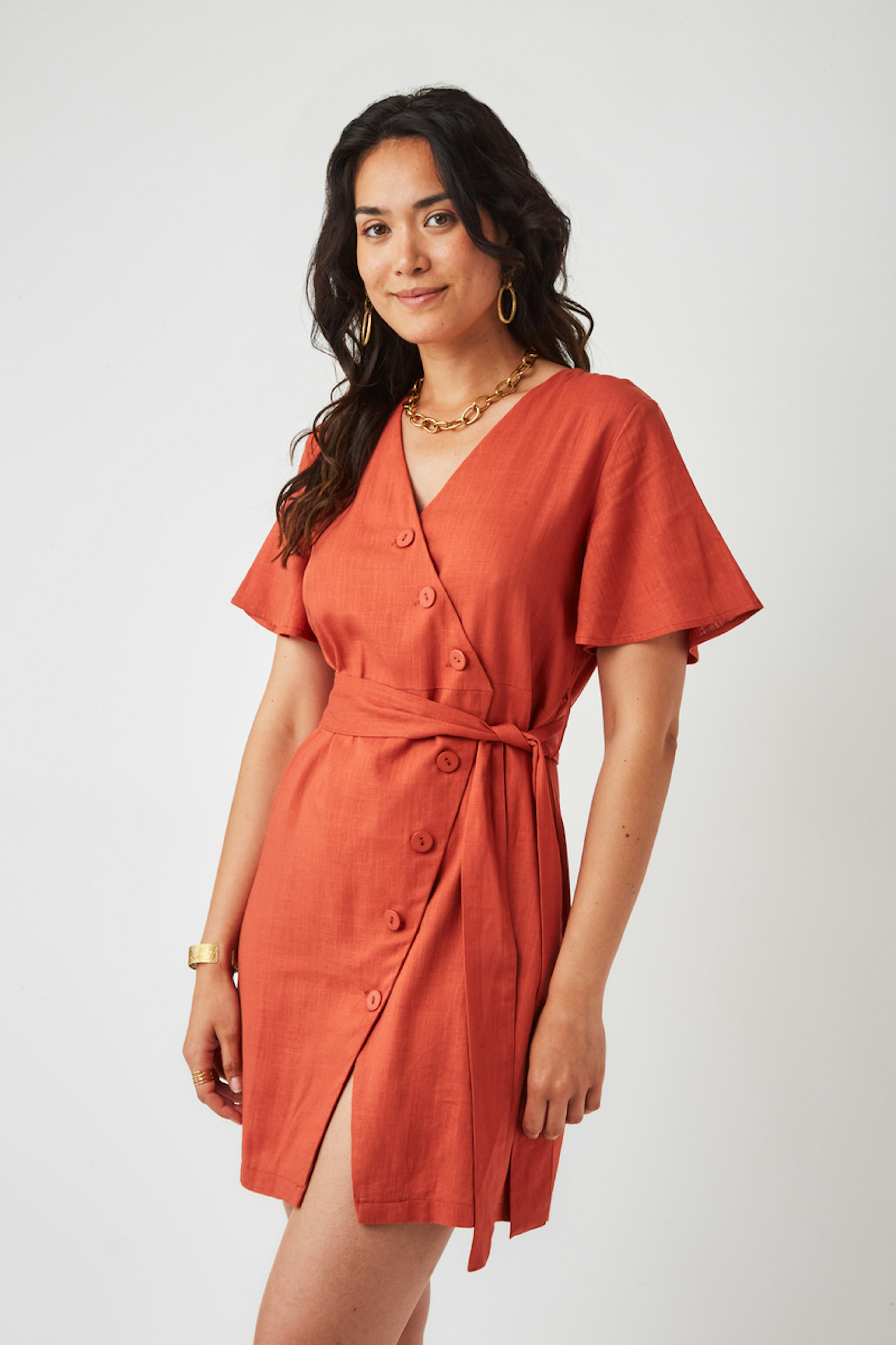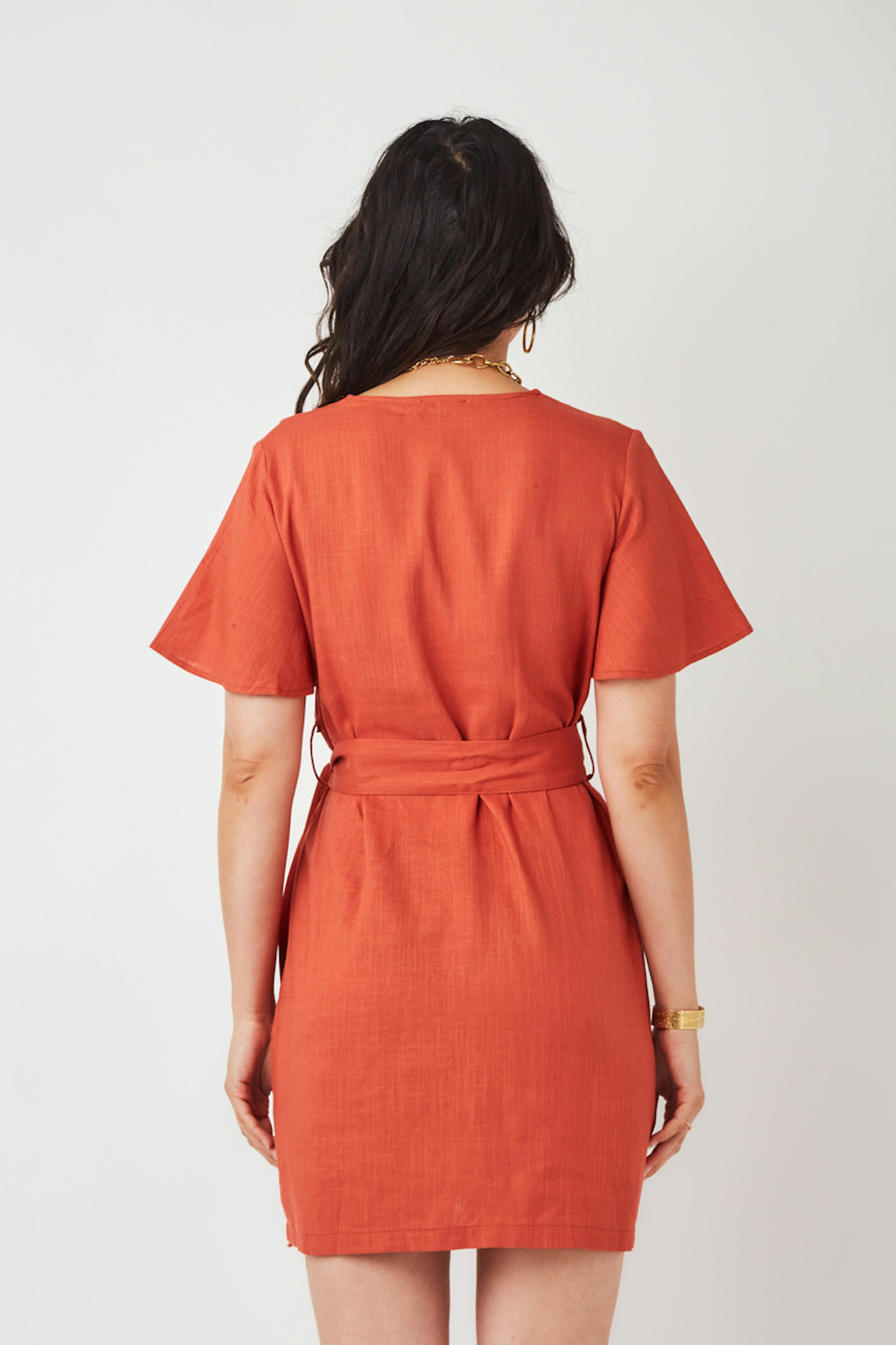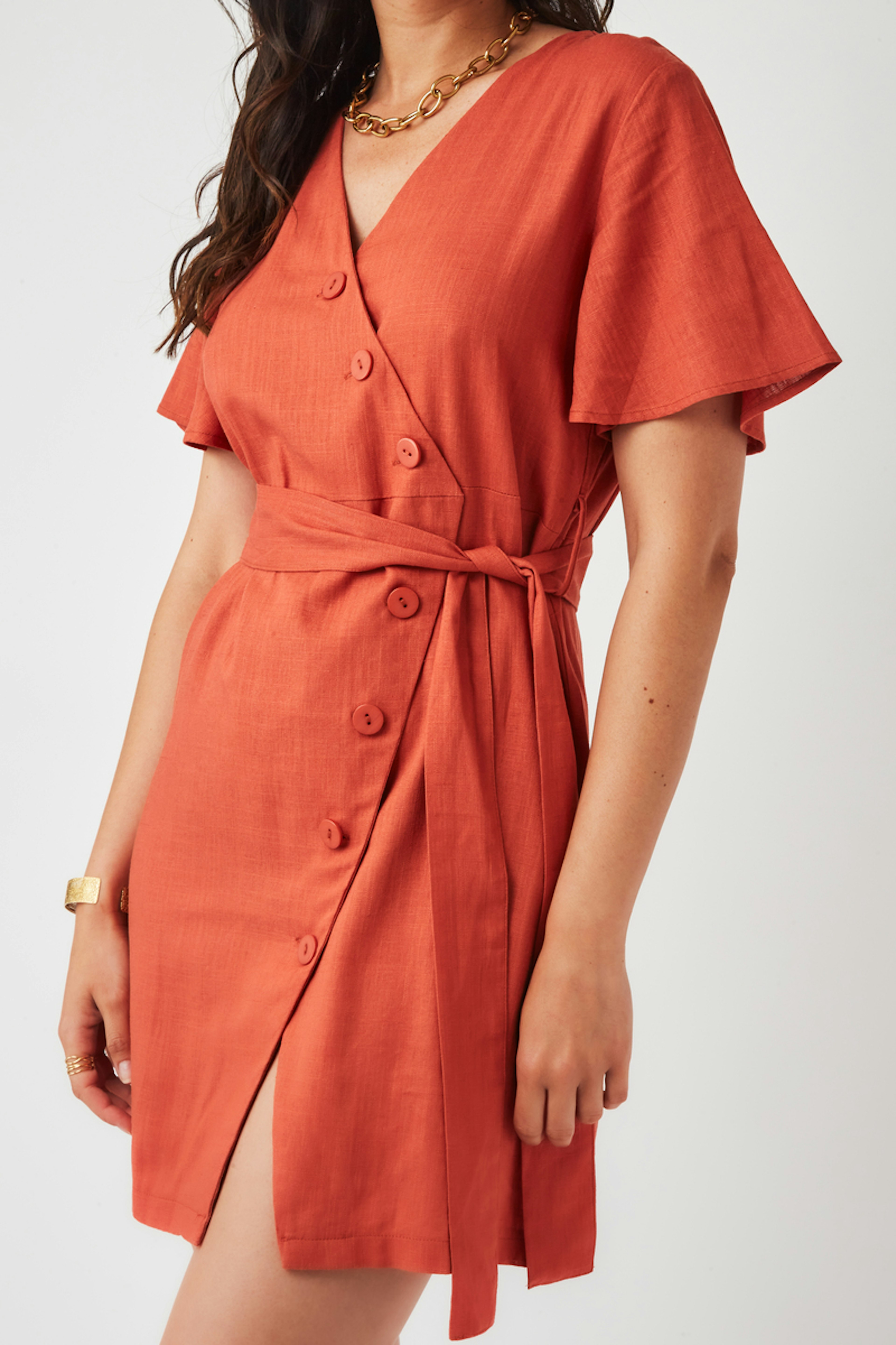 โข Robe en lin Jaye โข Col en V โข Coupe asymรฉtrique โข Fermeture ร boutons โข Ceinture dans le mรชme tissu โข Fente ร l'avant โข Manches courtes