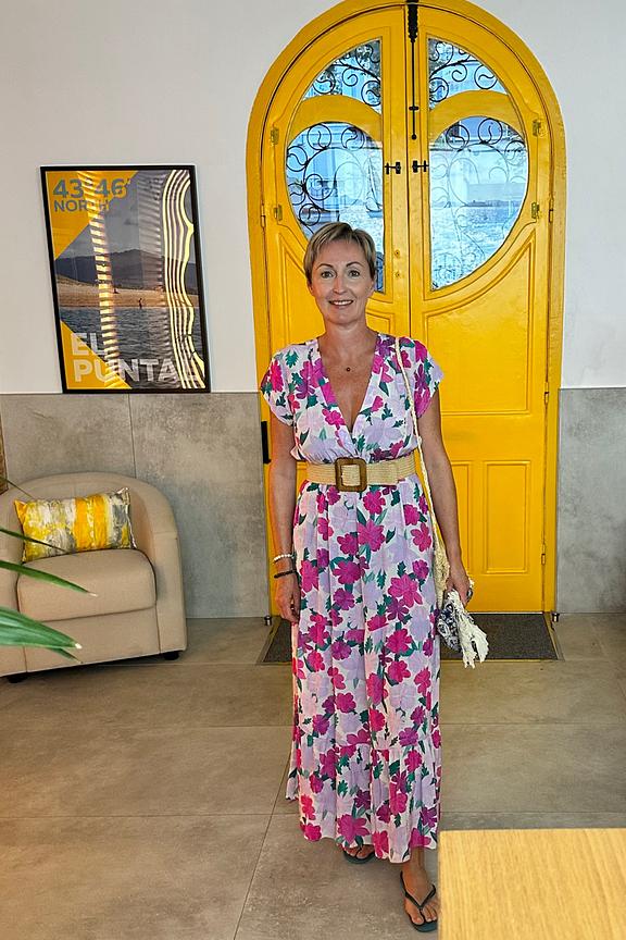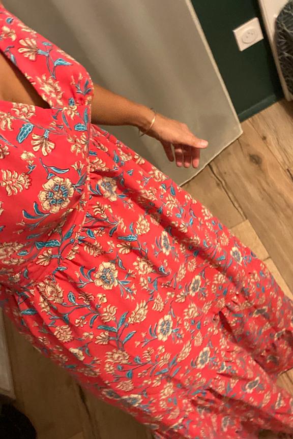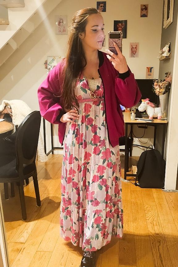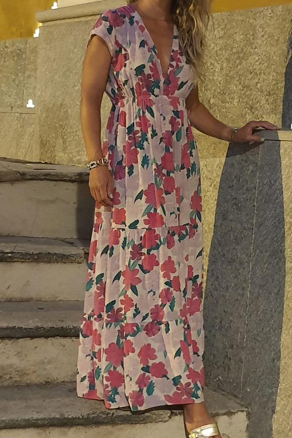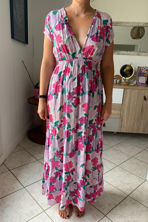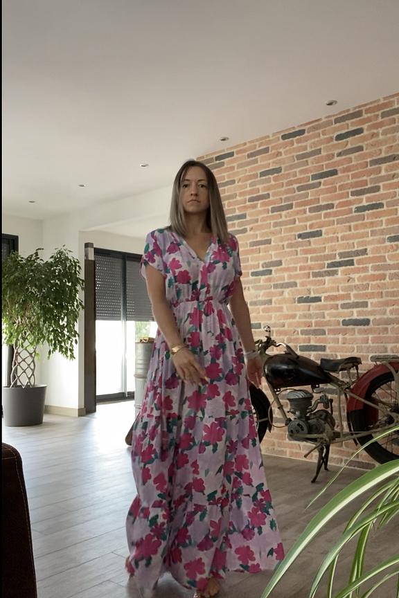 โข Robe longue imprimรฉe fleurie lilas et rose โข Dos ouvert fรฉminin avec lien au niveau du cou โข Manches courtes โข Taille cintrรฉe รฉlastiquรฉe โข Idรฉale pour un mariage