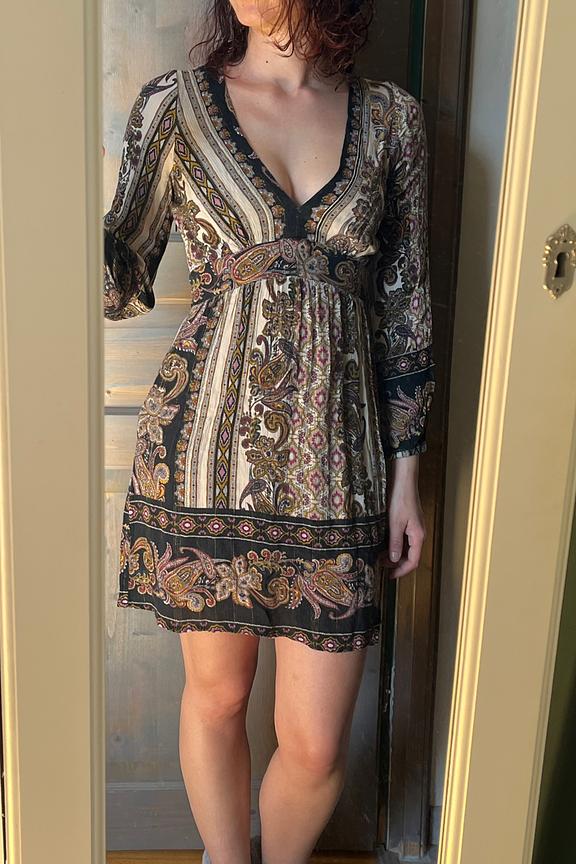 โข Robe courte โข Coupe fluide โข Col profond โข Manches longues lรฉgรจrement bouffantes โข Zip cotรฉ