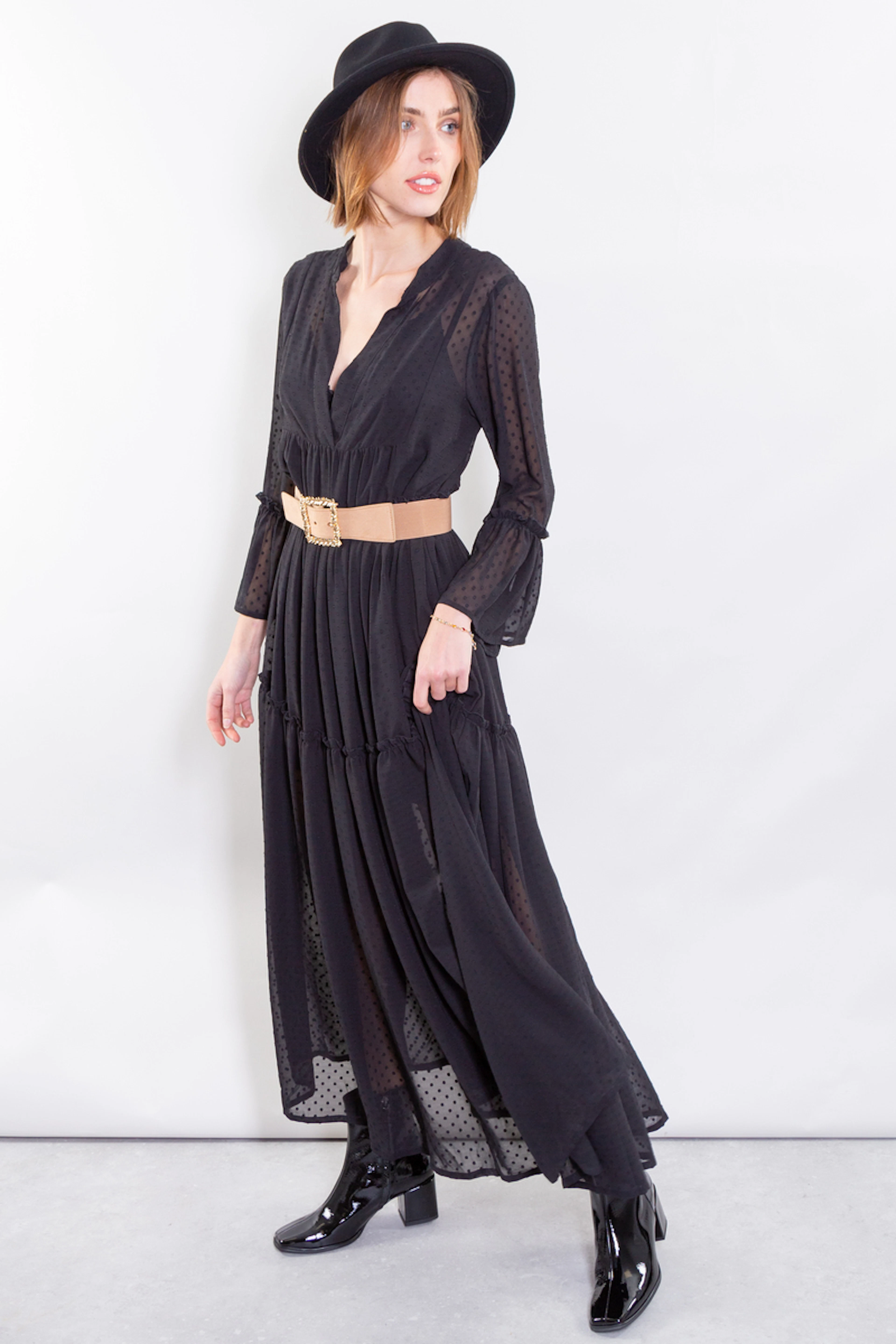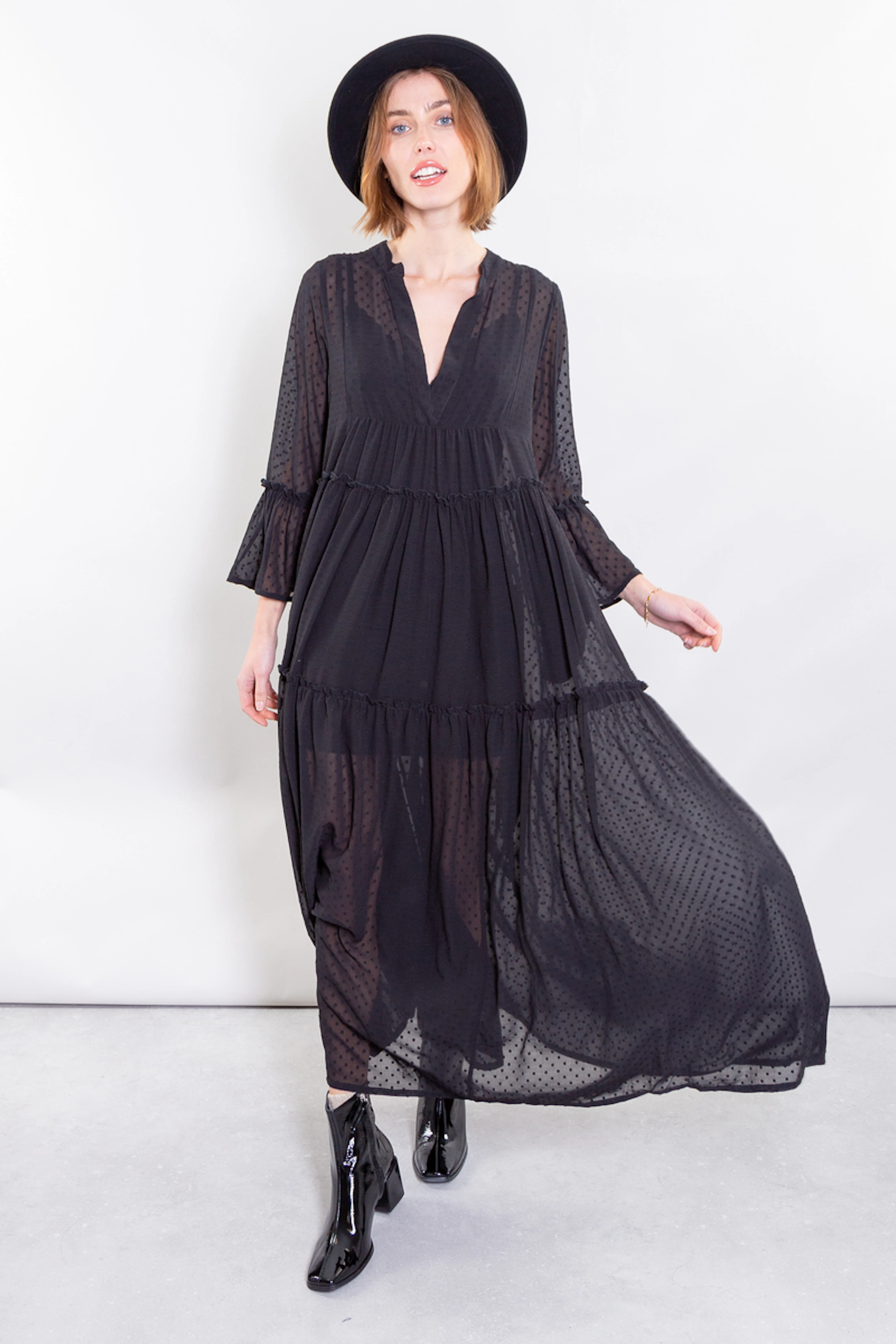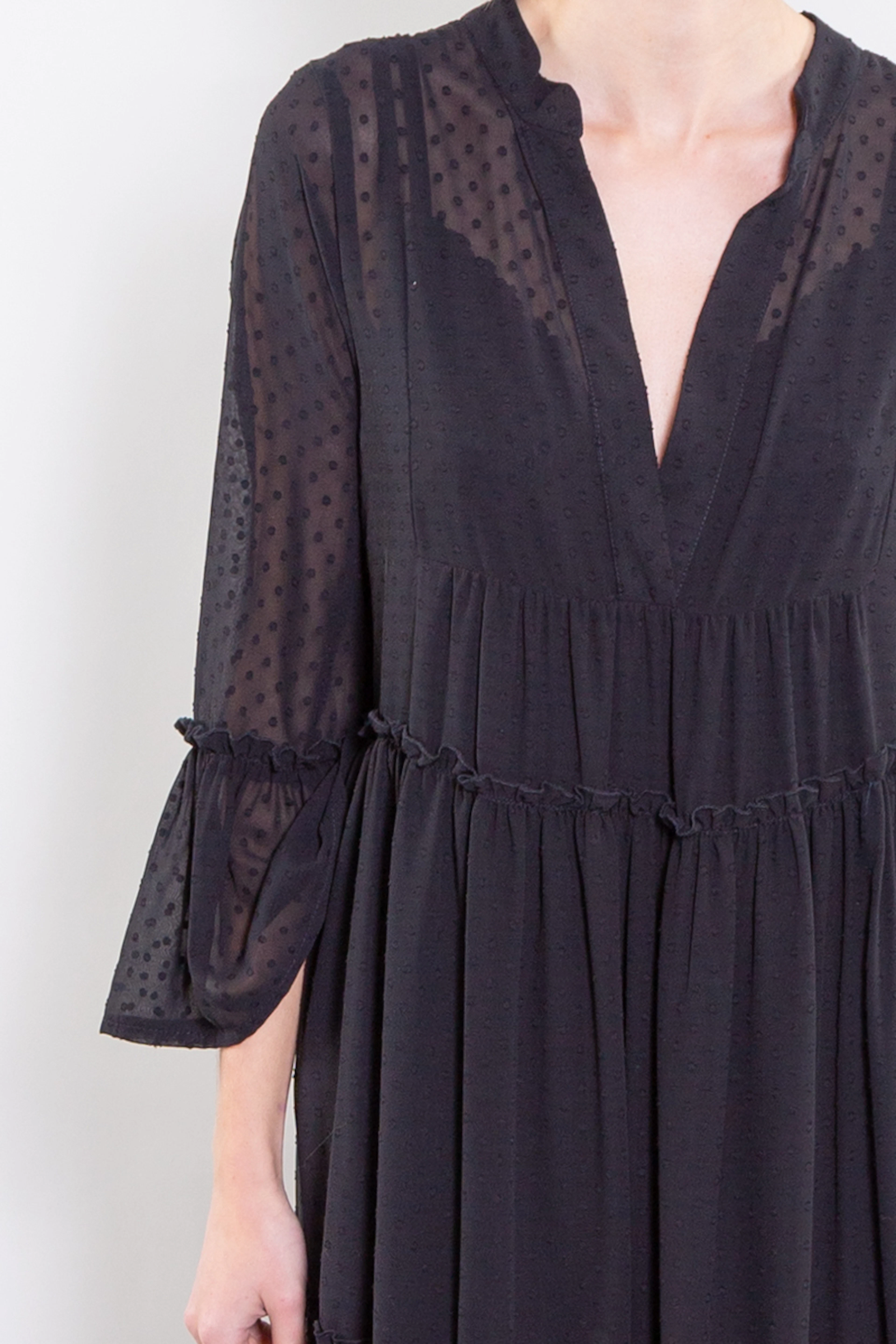 La robe Erin déclinée dans un élégant plumetis noir. • Longue robe avec deux grands volants froncés et cousus ensemble • Manches longues, avec poignets à volants • Empiècement devant ouvert orné d'un plastron à col Mao • Longueur cheville • Deux poches cachées dans les coutures côtés • Fond de robe en voile de coton noir et à bretelles ajustables