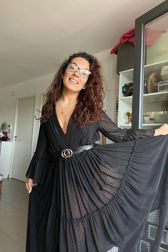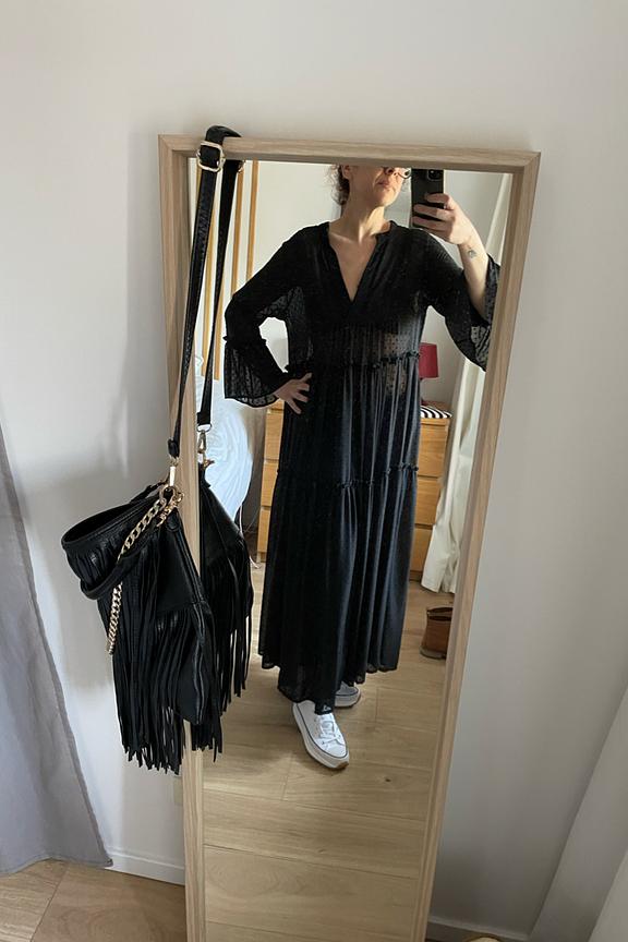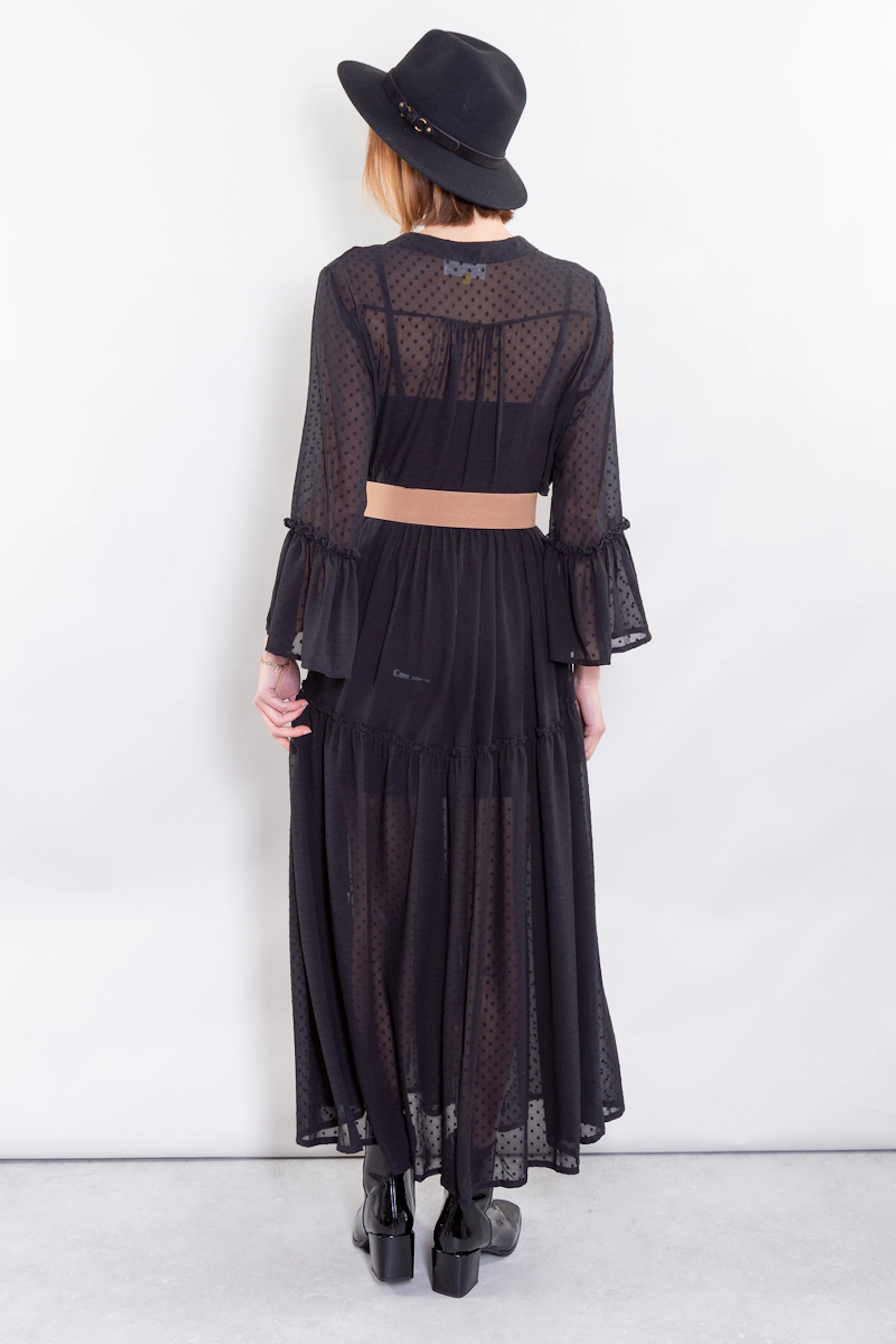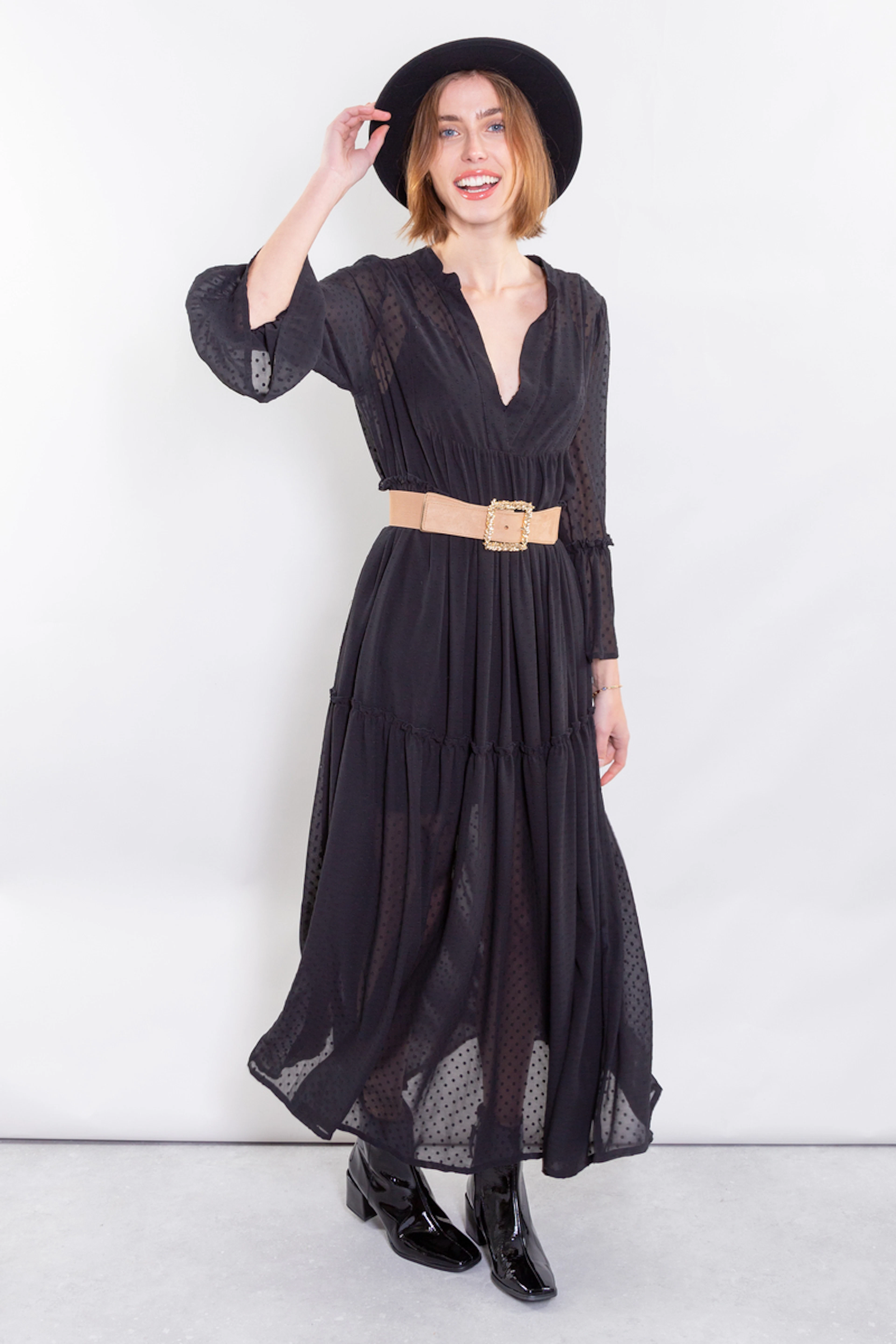 La robe Erin déclinée dans un élégant plumetis noir. • Longue robe avec deux grands volants froncés et cousus ensemble • Manches longues, avec poignets à volants • Empiècement devant ouvert orné d'un plastron à col Mao • Longueur cheville • Deux poches cachées dans les coutures côtés • Fond de robe en voile de coton noir et à bretelles ajustables