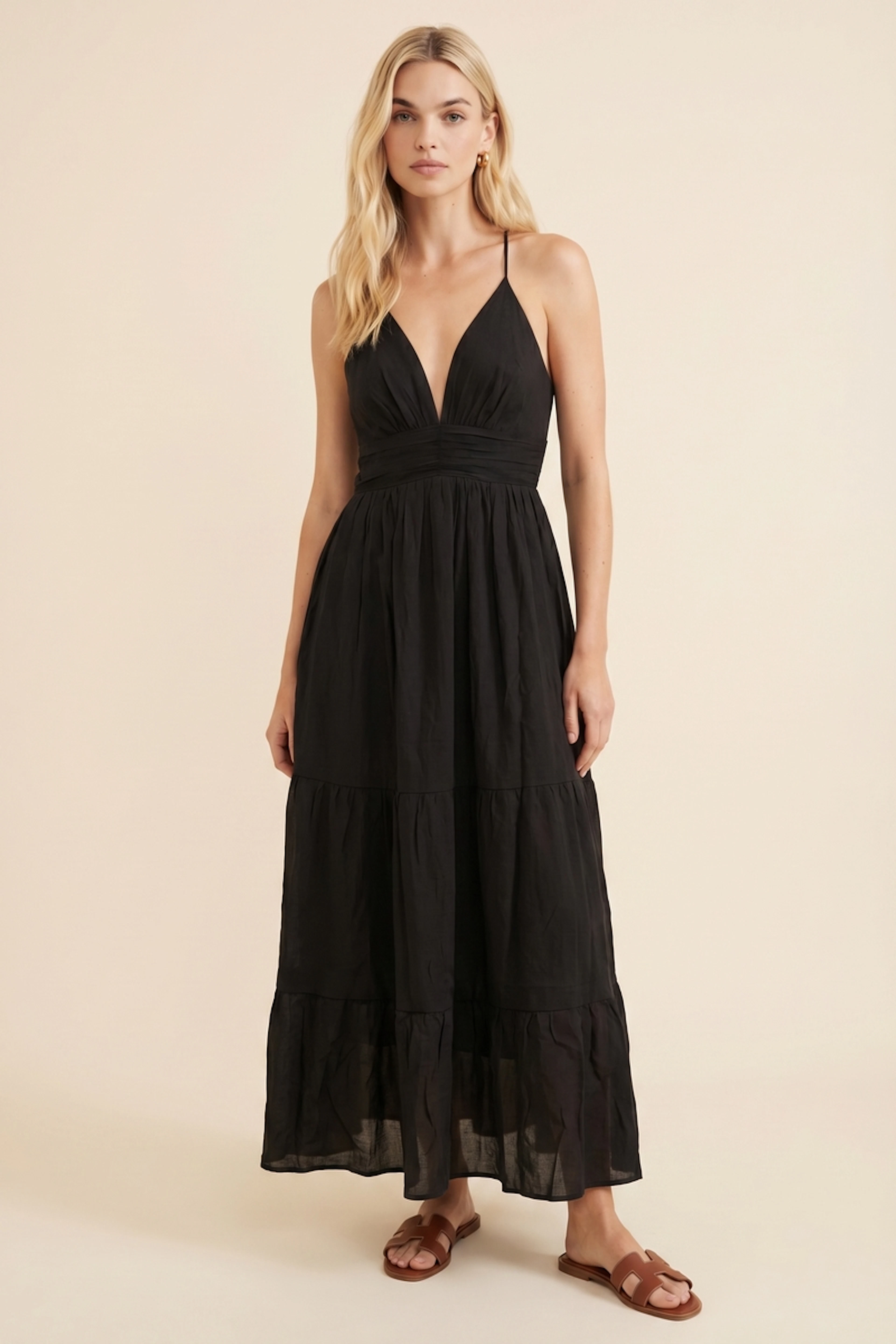 Associez cette robe à des sandales et un chapeau en paille pour un look estival parfait. • Robe longue en coton • Bretelles fines ajustables • Décolleté plongeant en V • Jupe évasée • Dos nu élégant