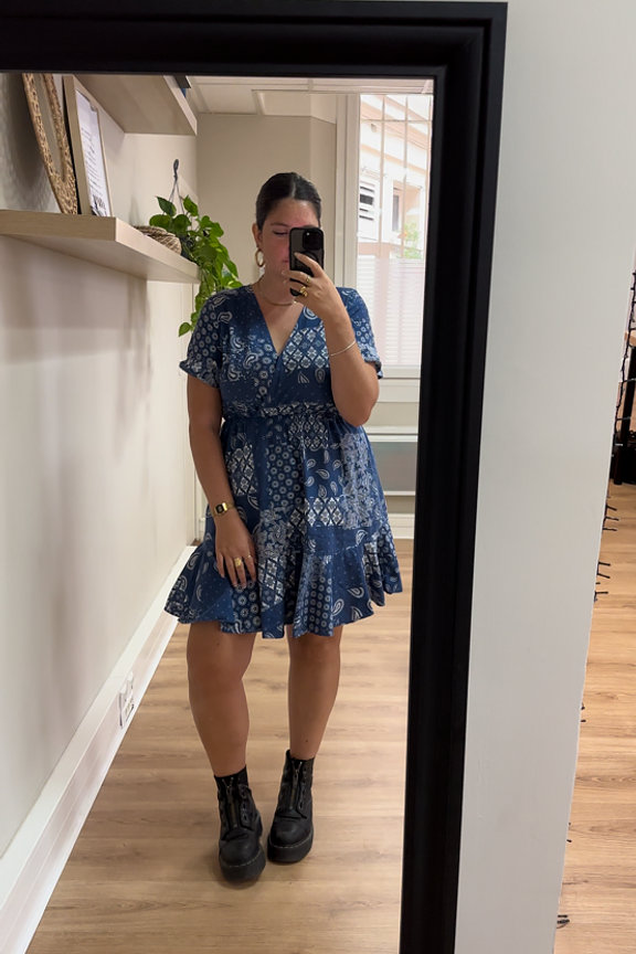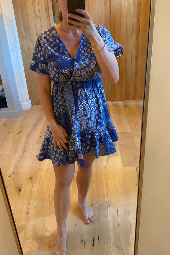 โข Robe courte en imprimรฉ bandana bleu โข Encolure arrondie sur le devant et cache-cลur dans le dos avec bouton-pression cachรฉ โข Manches courtes รฉvasรฉes โข Taille รฉlastiquรฉe โข Ourlets cannelรฉs โข Robe rรฉversible : recto-verso