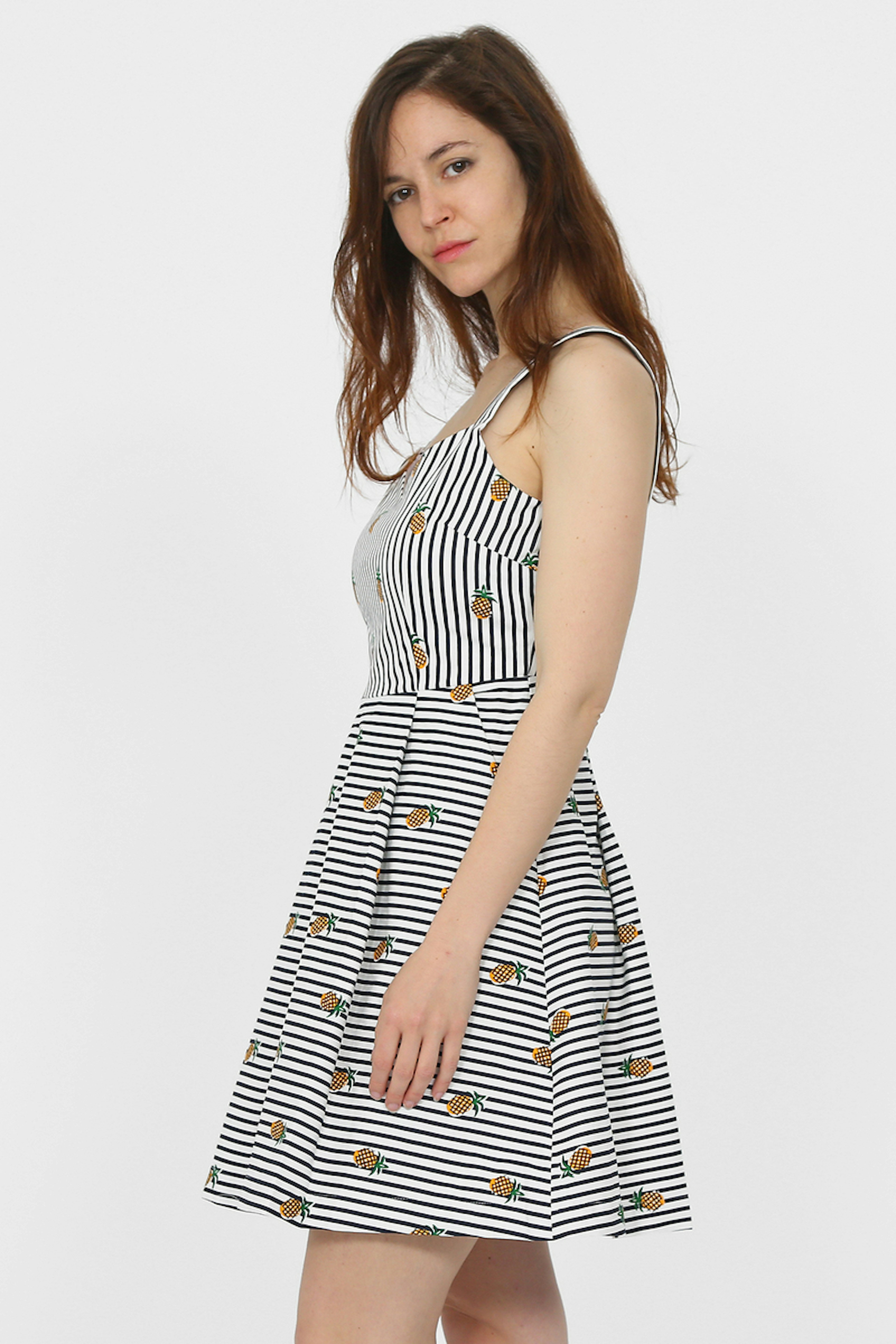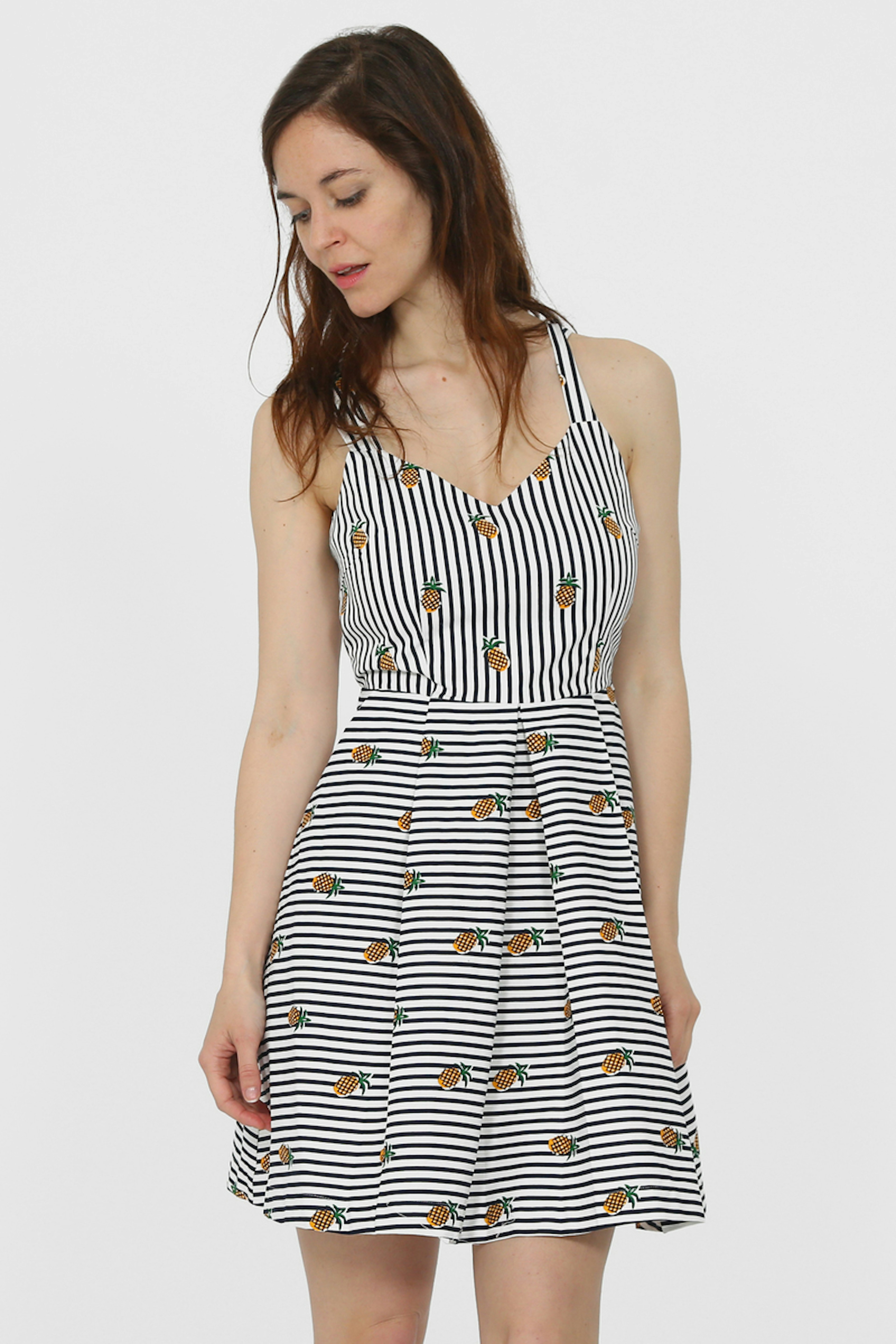 Robe blanche ร rayures noires avec un imprimรฉ ananas et col en V. Taille marquรฉe par couture et zip dans le dos.