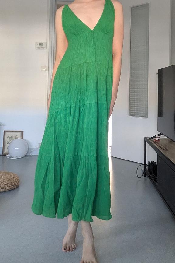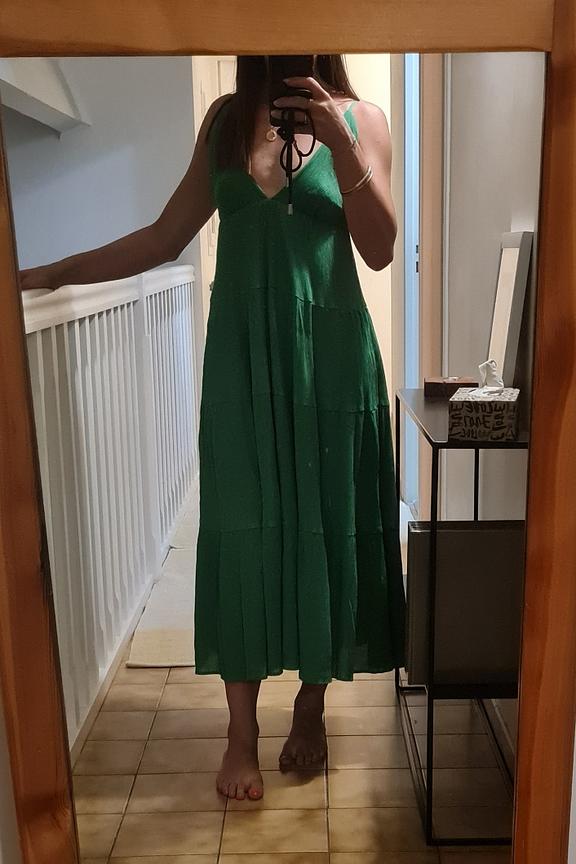Laissez-vous séduire par cette robe vert émeraude, parfaite pour un été éclatant. Associez-la à des sandales dorées pour une allure divine ! • Robe empire en tissu léger • Décolleté plongeant en V • Sans manches, bretelles fines • Jupe à volants superposés • Longueur mi-mollet, mouvement aérien