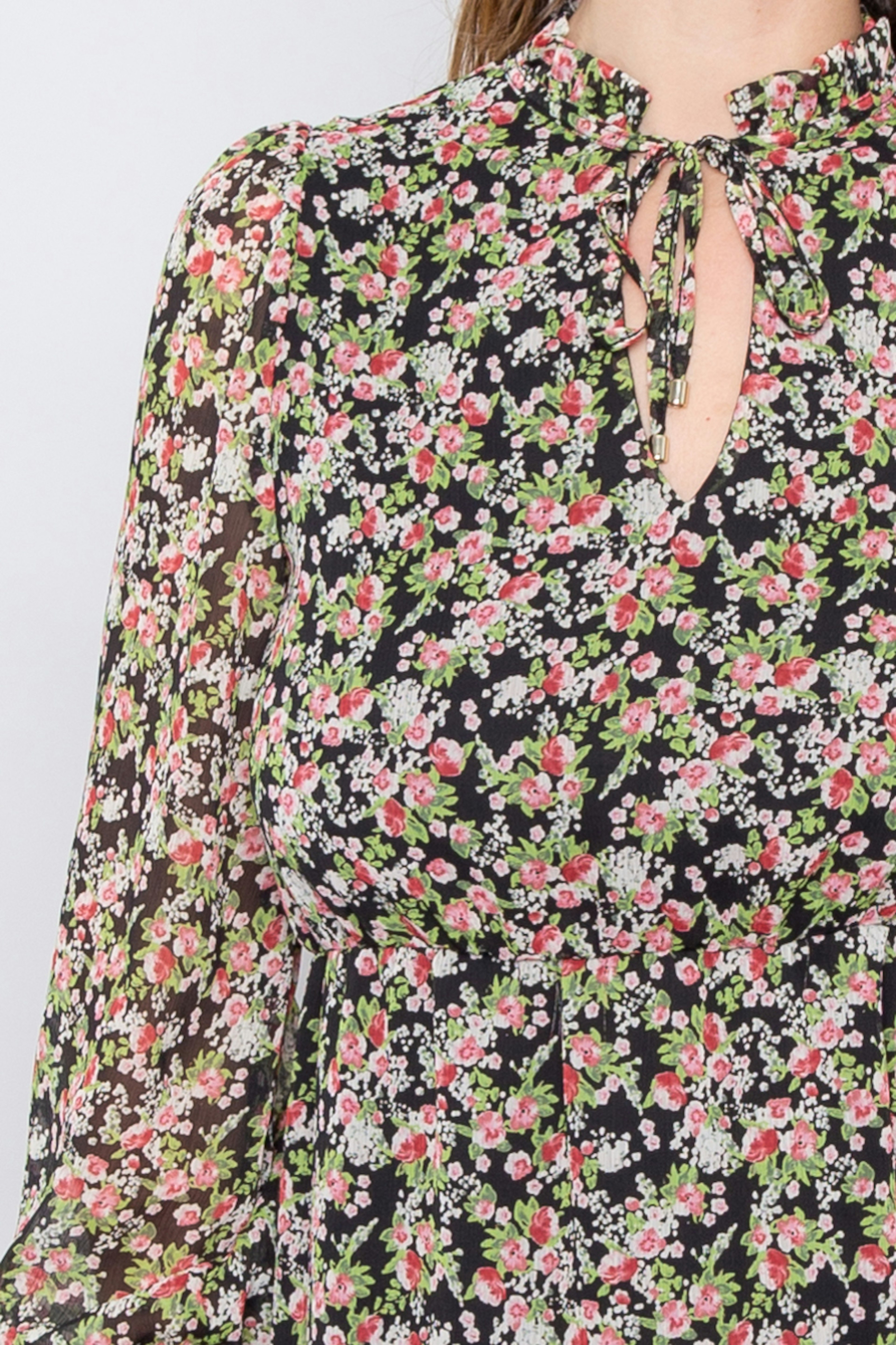 โข Manches longues ballon resserrรฉes aux poignets โข Encolure V devant ร volant โข Doublรฉe en coton โข Cordon devant avec mรฉtal dorรฉ โข Ligne taille รฉlastiquรฉe โข Longueur depuis l'รฉpaule 105 cm (pour un 44/46)