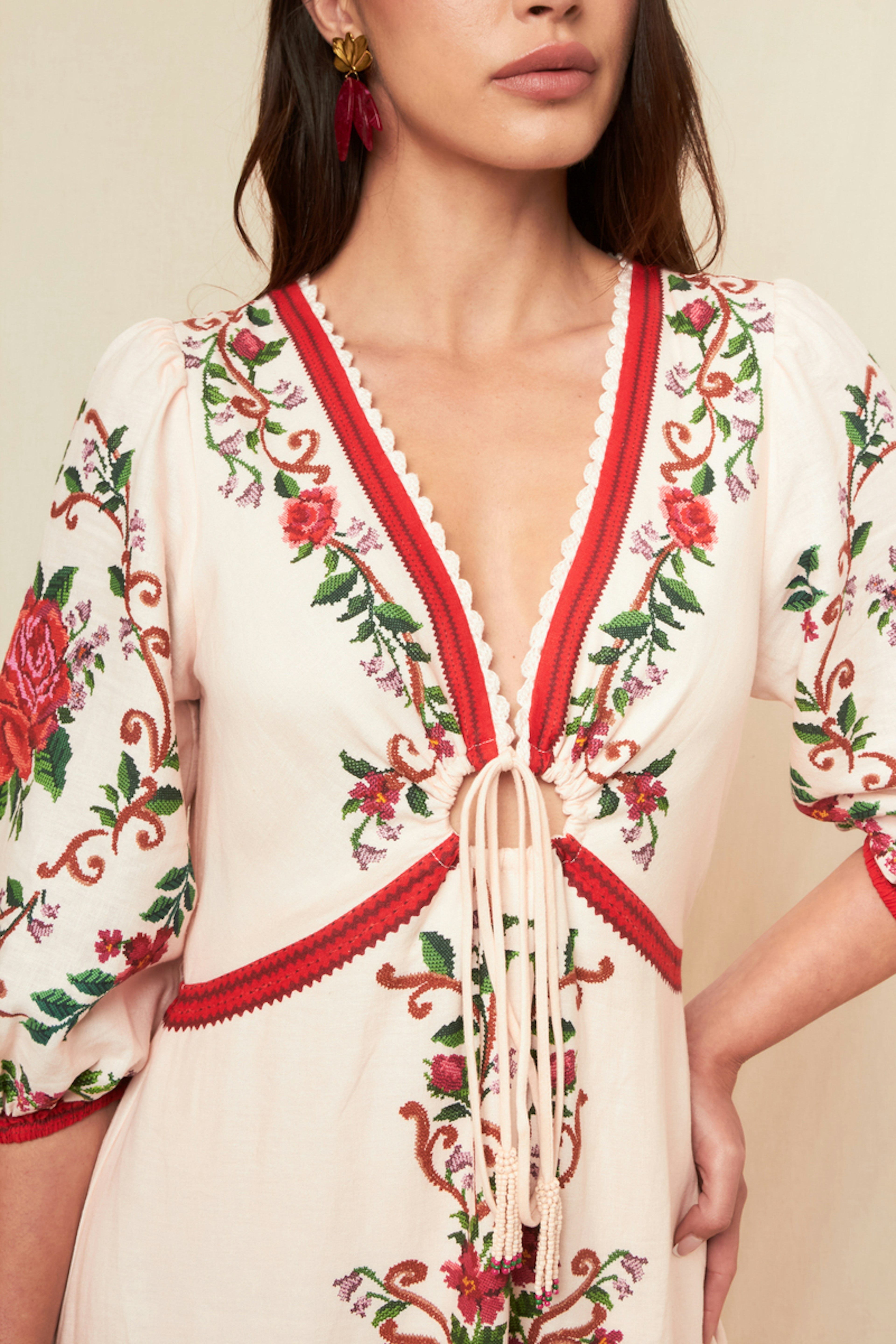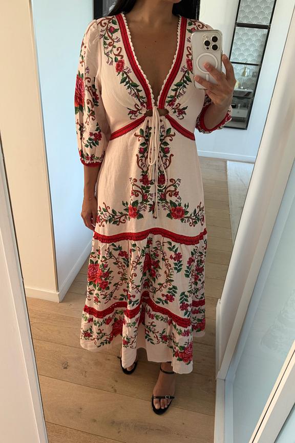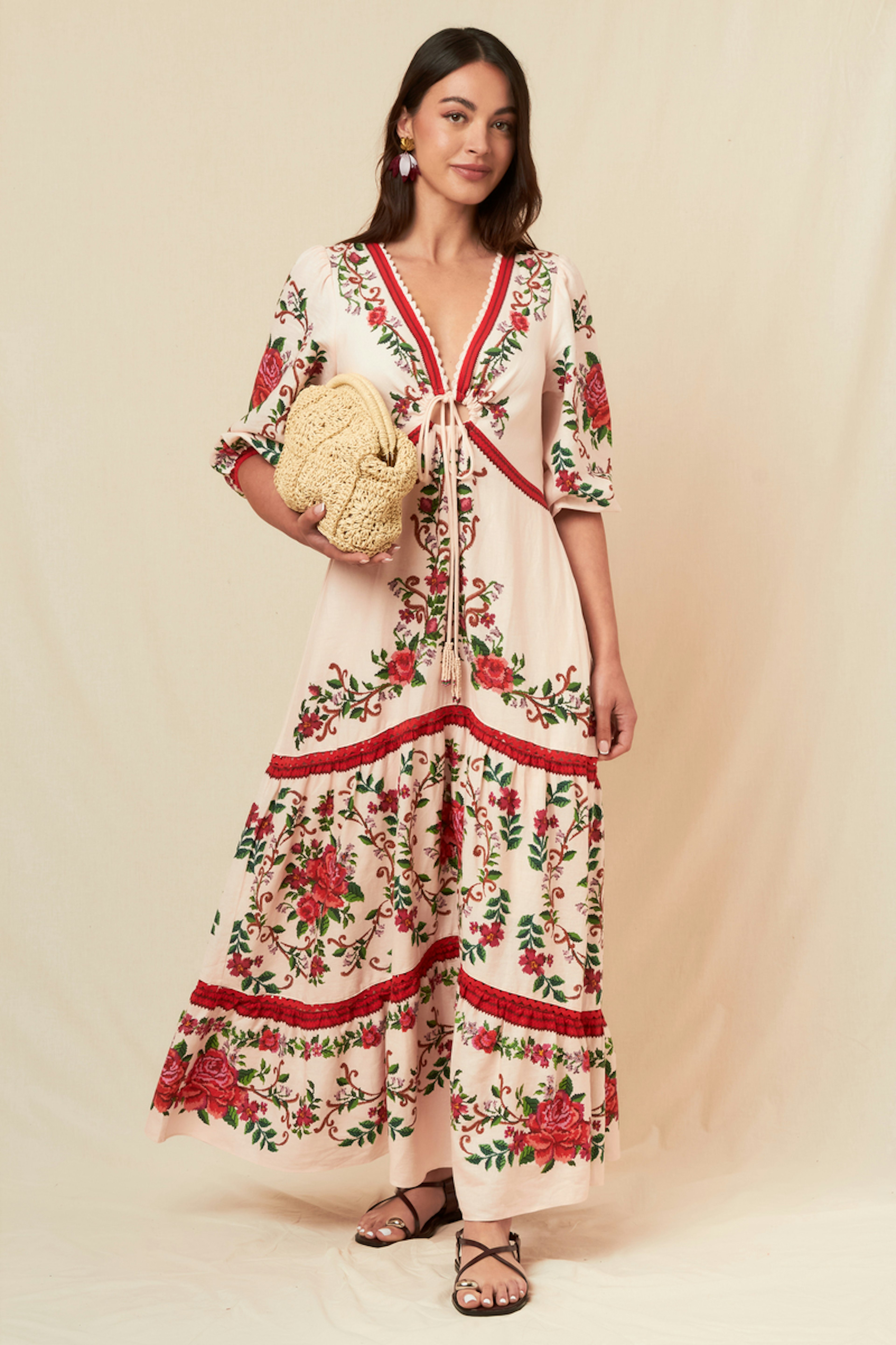 Associez cette robe longue à des sandales à lanières pour un look estival rafraîchissant. • Robe longue en lin et viscose • Décolleté en V flatteur • Manches trois-quarts bouffantes • Imprimé floral éclatant • Taille ajustée avec ceinture intégrée
