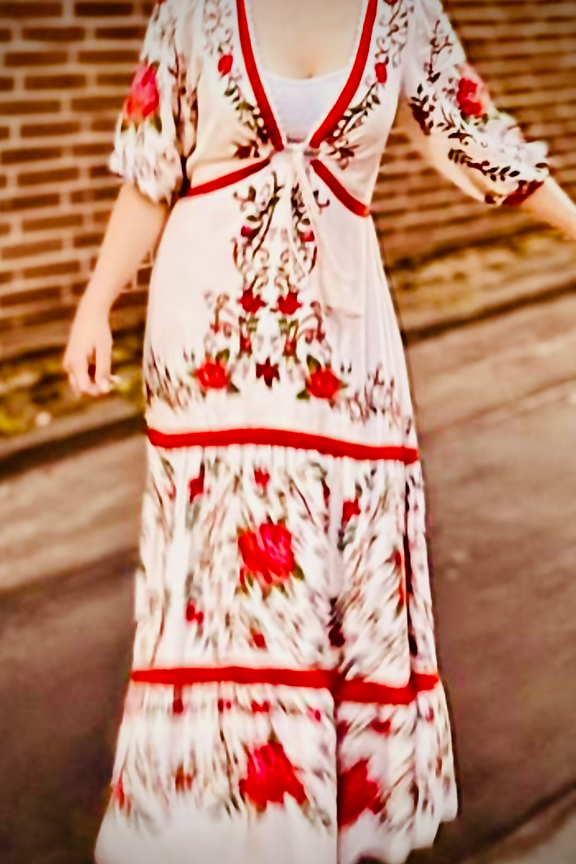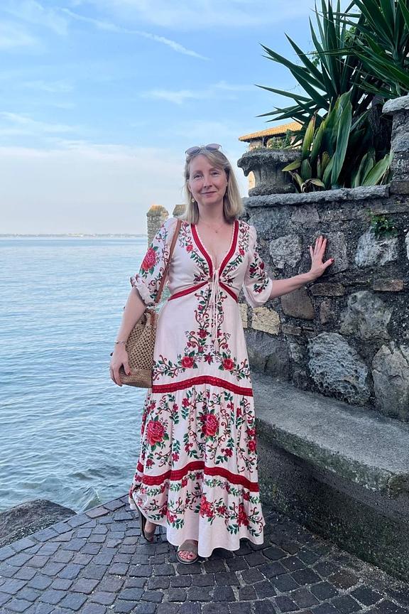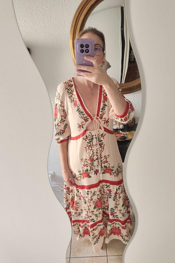 “J'adore ! Il y a toujours des détails trop bien chez cette marque. Sur celle ci, le décolleté hyper plongeant et le lien devant ajoutent aux motifs encore plus d'apprêt. Alors bien sûr, je serai obligée de porter la robe avec des talons (je suis petite) et avec quelque chose en dessous (j'ai des formes !) mais même avec une grosse veste ou un pull, elle est vraiment jolie.”