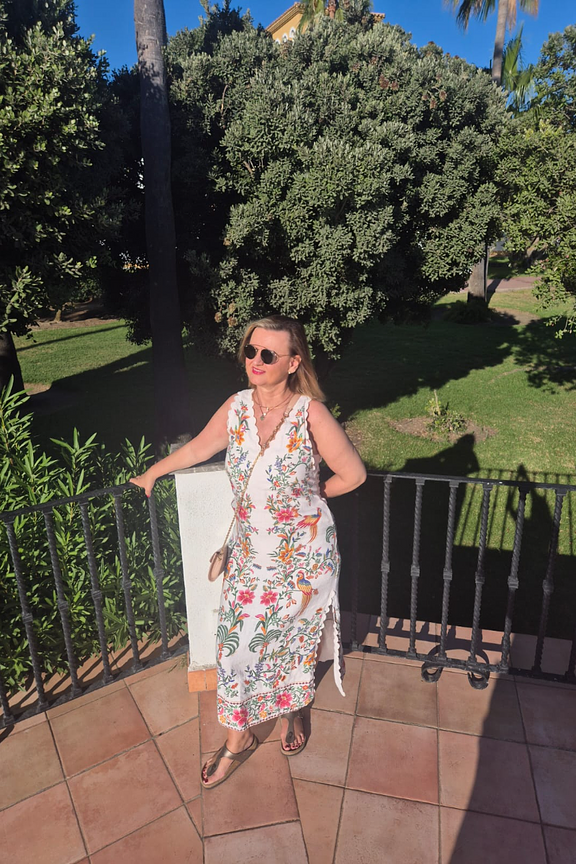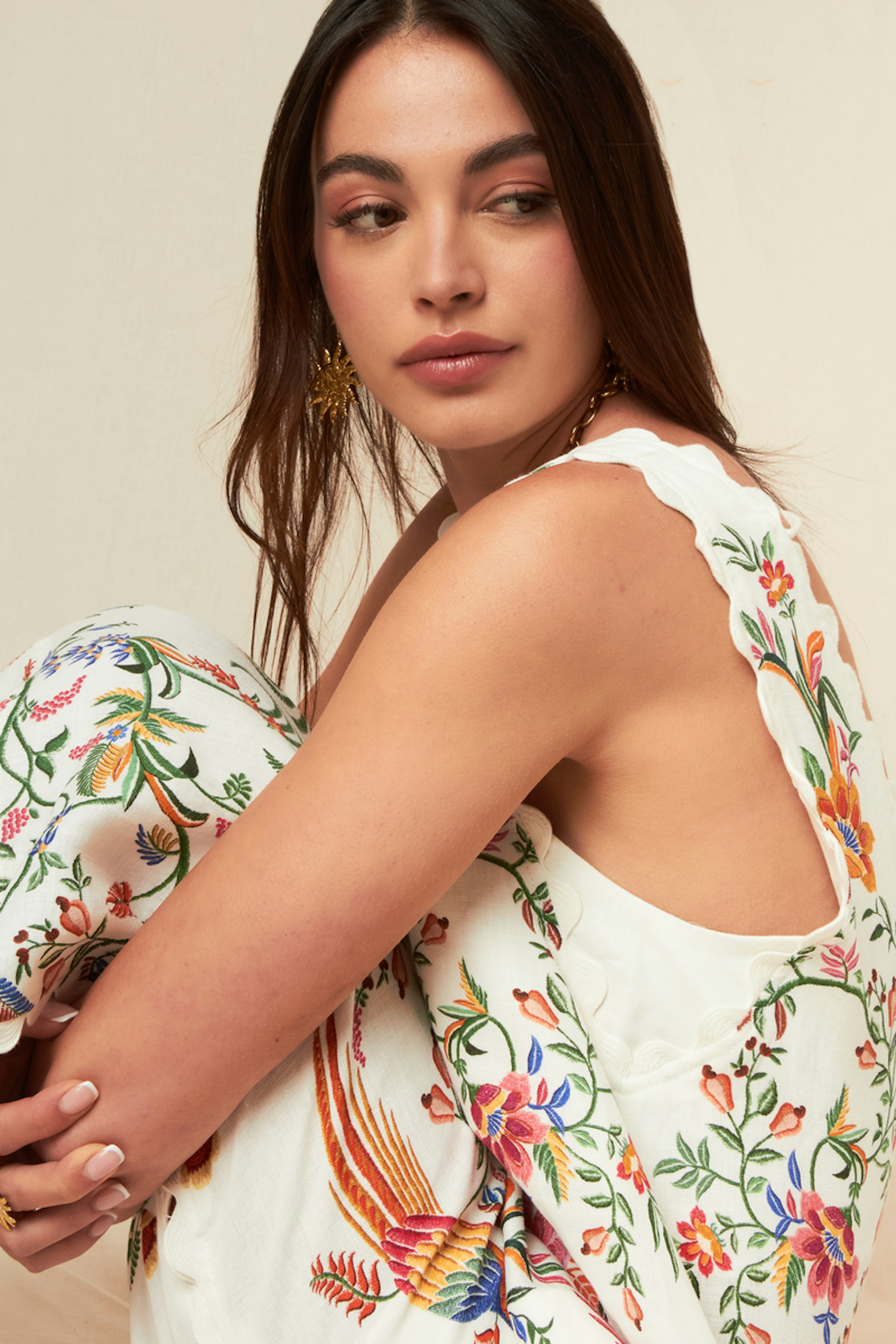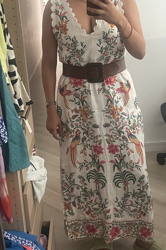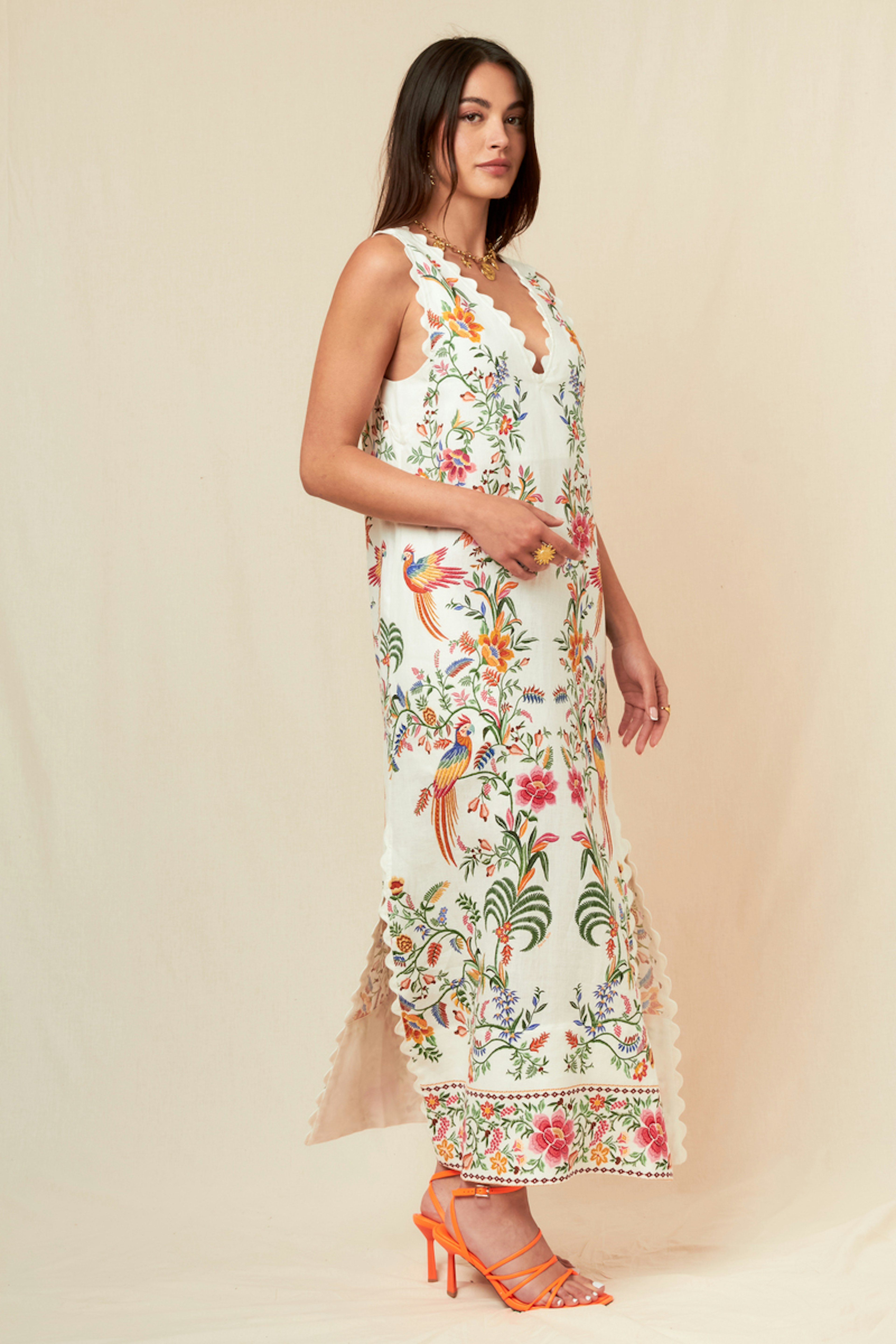 Portez cette robe avec des sandales colorées et des bijoux dorés pour un style estival élégant. Parfaite pour les journées ensoleillées ! • Robe longue en lin • Col en V • Sans manches • Imprimé floral • Détails festonnés