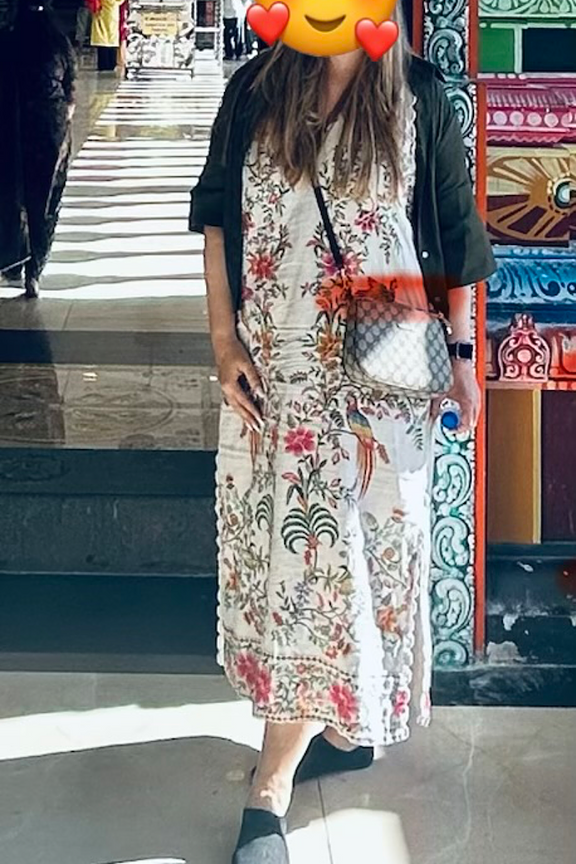 Portez cette robe avec des sandales colorées et des bijoux dorés pour un style estival élégant. Parfaite pour les journées ensoleillées ! • Robe longue en lin • Col en V • Sans manches • Imprimé floral • Détails festonnés