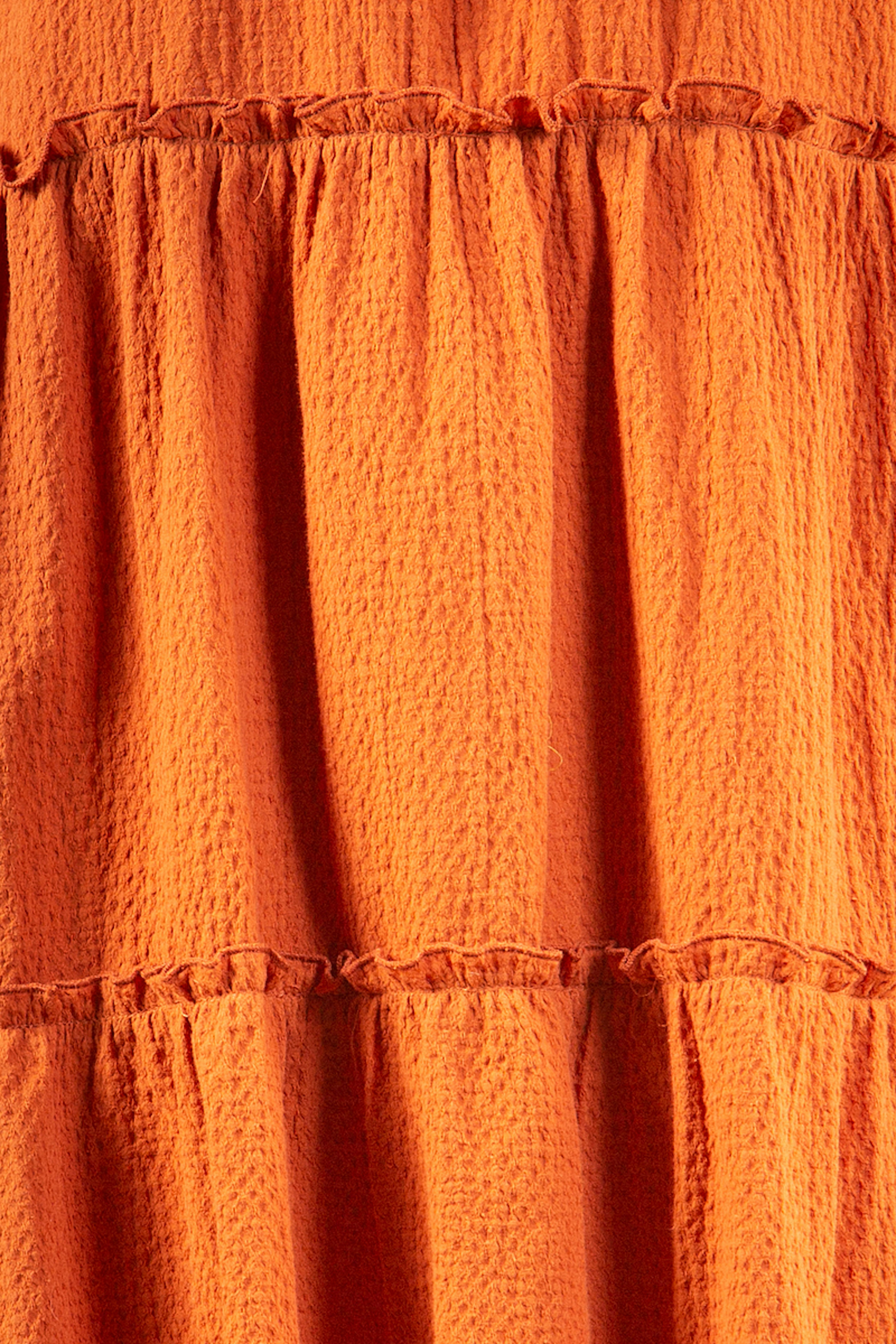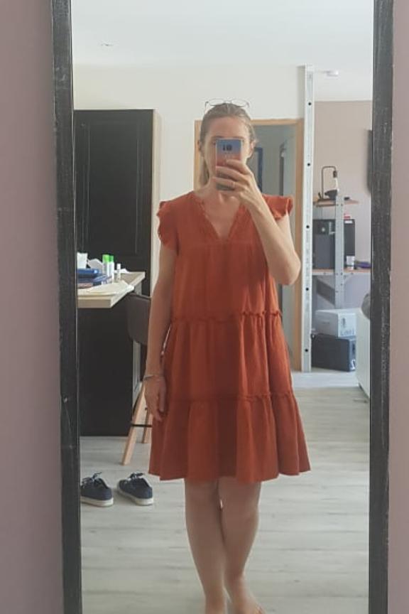 Optez pour Gaucho, cette robe en coton double gaze brique. On aime l'originalitรฉ de sa matiรจre et les dรฉtails des festons aux manches. Cette robe dispose d'une doublure.