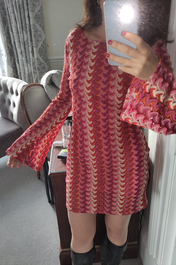 “J’ai aimé cette robe qui a reçu son lot de compliment la seule fois où je l’ai portée. En effet, je l’ai reçue en fin d’été et n’ai pas trouvé d’autre occasion pour la mettre. Les manches, le dos nu et le tissus original la rendent unique. Attention cependant au coté moulant qui marque le bas du ventre si vous n’aimez pas ça.”