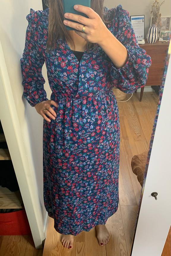 โข Robe longue en imprimรฉ G&M exclusif โข Ecolure V โข Manches longues forme boule รฉlastiquรฉes au poignet โข Taille รฉlastiquรฉe โข Doublรฉe
