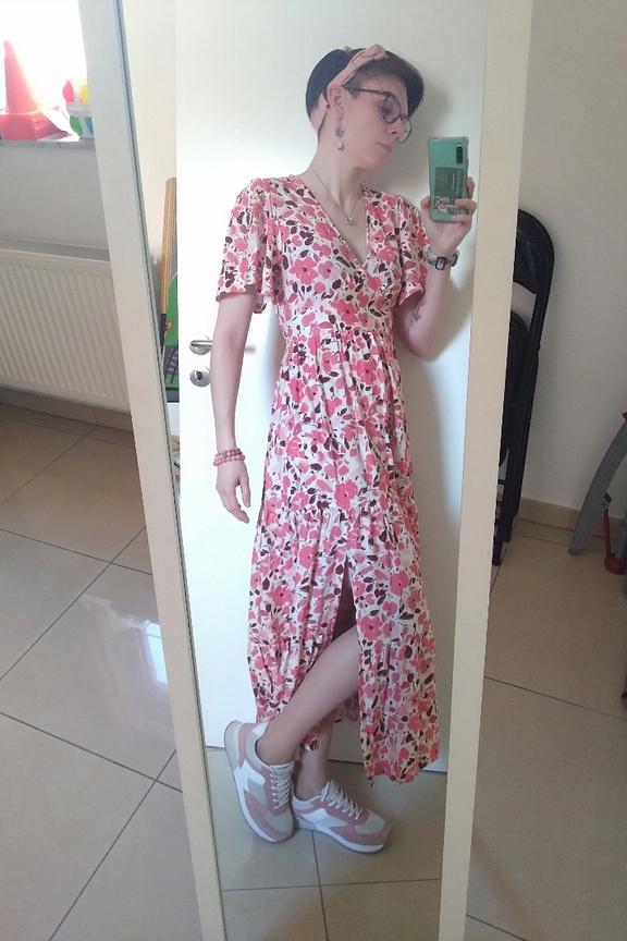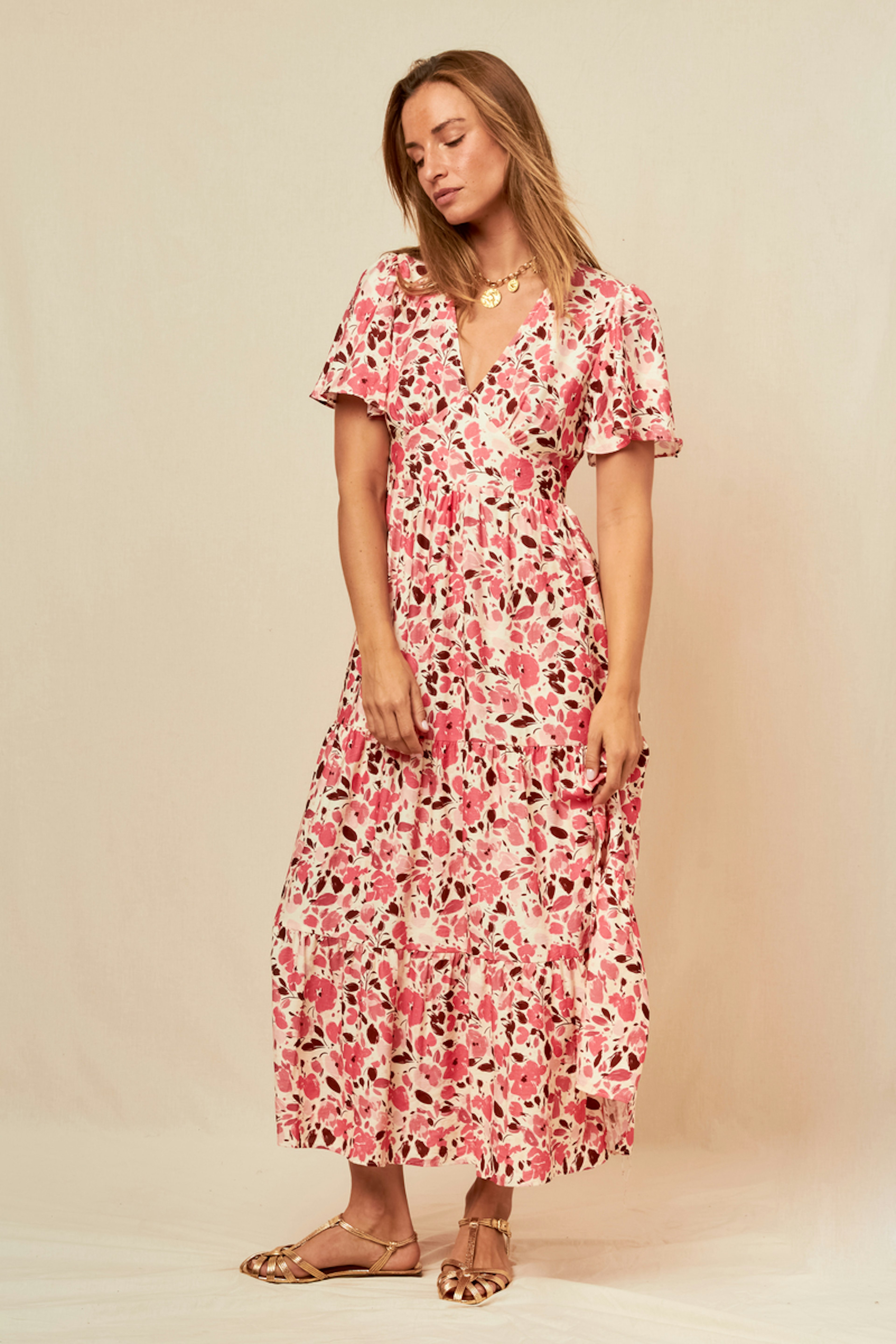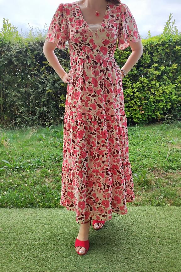 Ajoutez une touche bohème avec des sandales dorées pour un look estival enchanteur. • Robe longue • Décolleté en V • Manches courtes • Taille empire • Motif floral