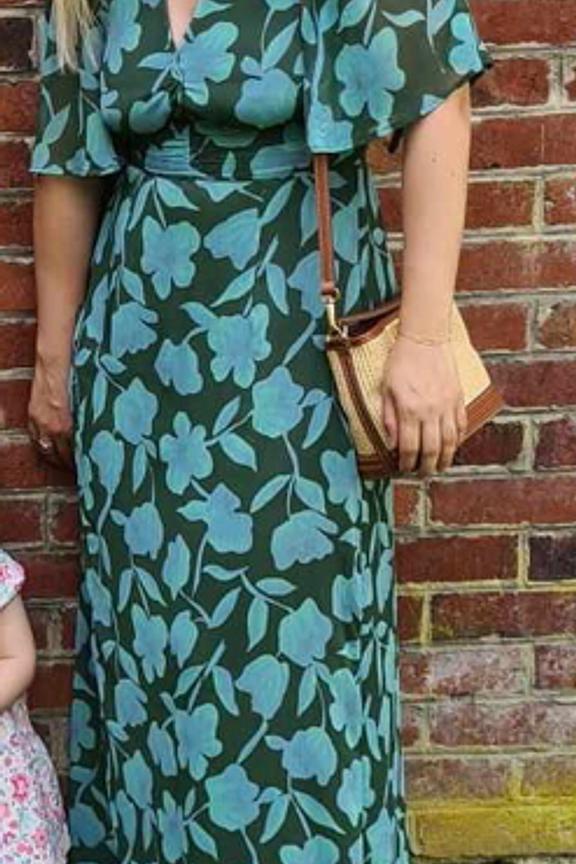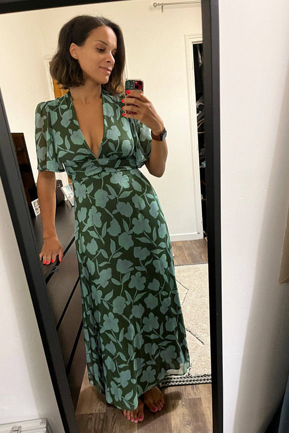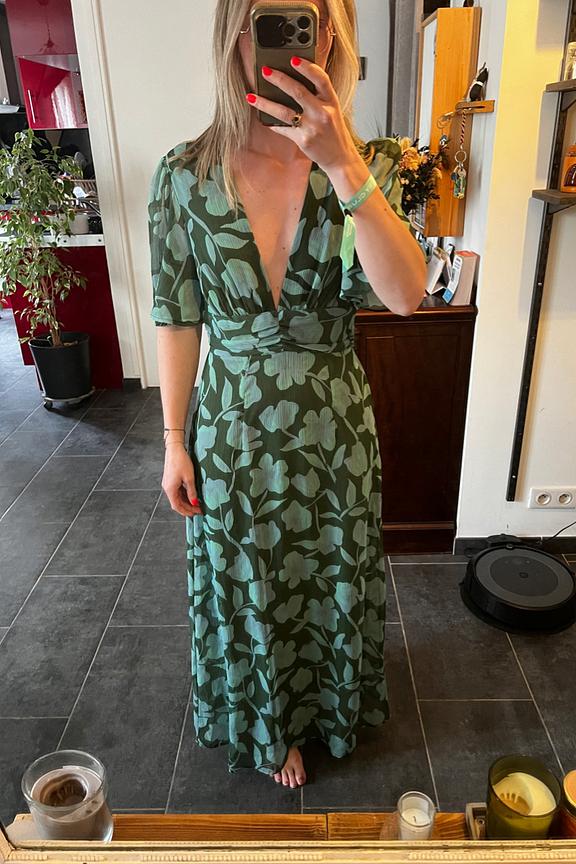 Flรขnez sous le soleil estival avec cette robe au charme bucolique, parfaite avec des sandales ร talons pour une occasion. โข Robe longue imprimรฉe โข Dos nu รฉlรฉgant โข Dรฉcolletรฉ profond โข Manches courtes volantes โข Ceinture froncรฉe chic