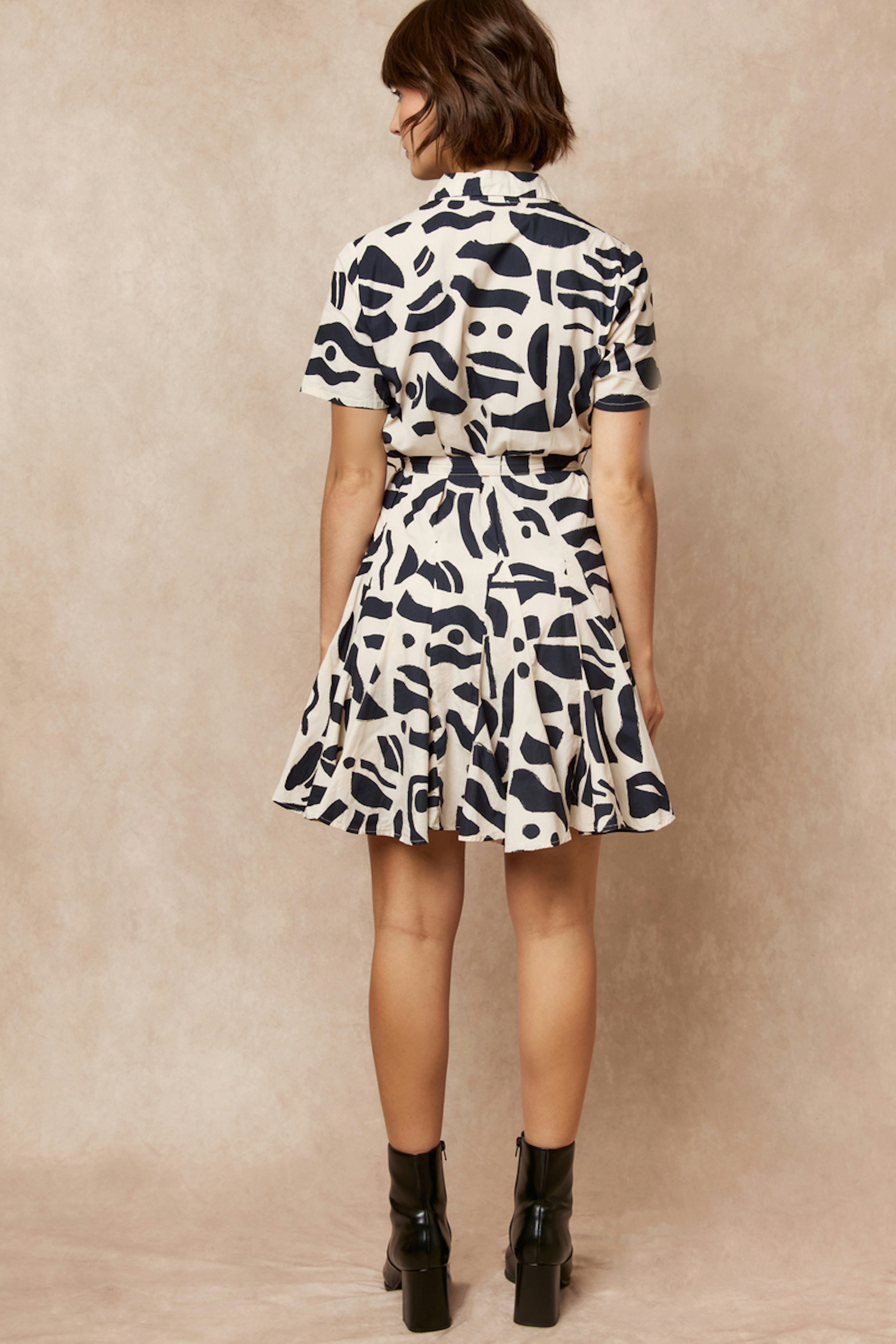 Associez cette robe à des sandales minimalistes et des accessoires dorés pour une élégance estivale parfaite. Idéale pour profiter des journées ensoleillées avec style. • Robe courte en coton • Manches courtes • Ceinture à nouer • Col chemise • Motif imprimé