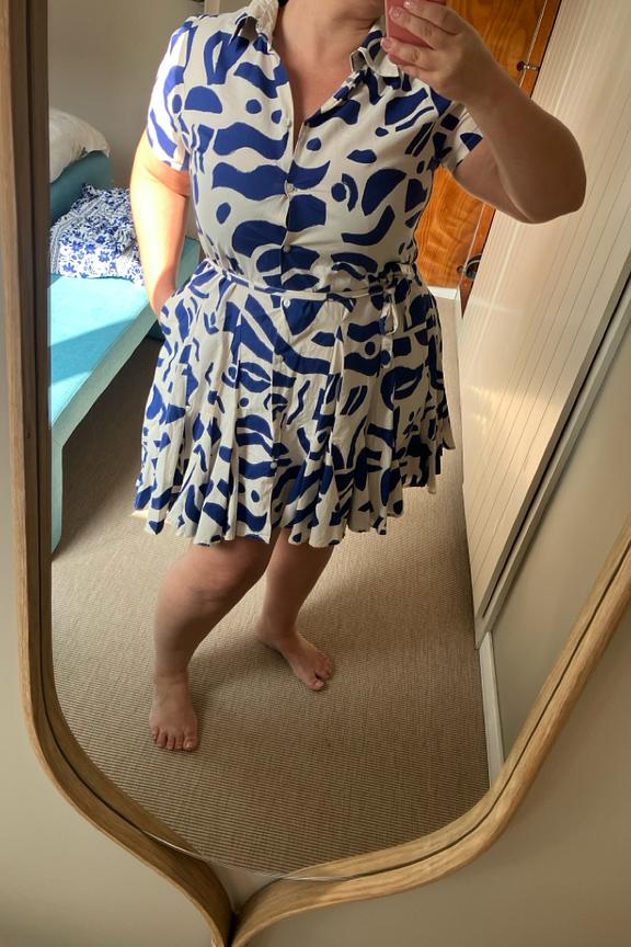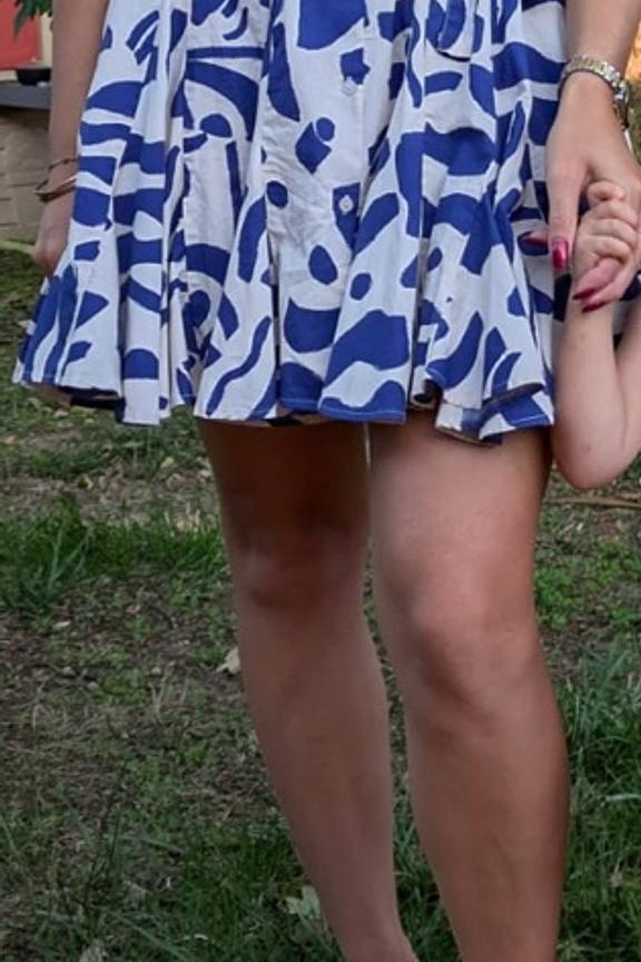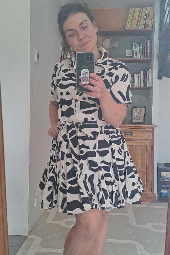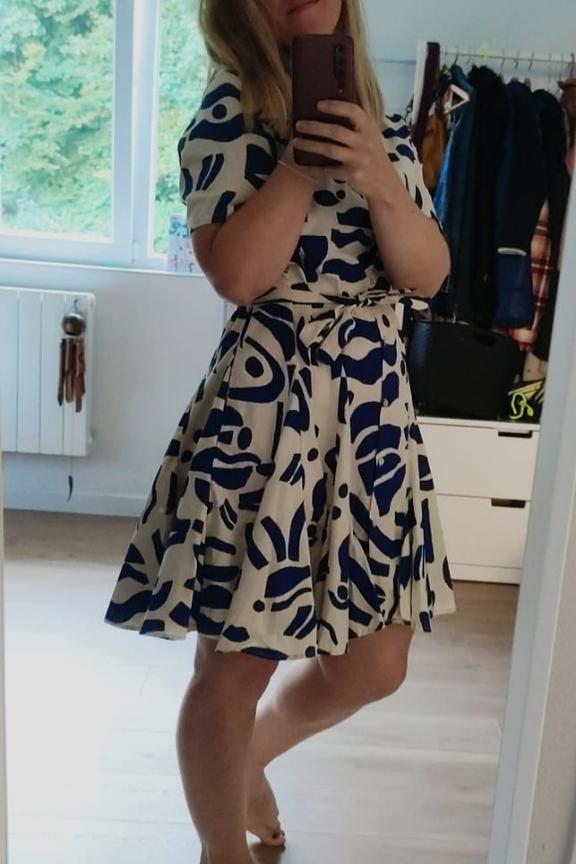 “Très chouette robe simple à porter (assez courte, donc attention ne vous penchez pas trop !). Le point fort c’est le mouvement de la jupe, absolument magnifique (dirty dancing style) Le point faible c’est qu’on peut rapidement entrevoir le décolleter à travers les boutons (pour les poitrines généreuses). La taille est parfaite.”