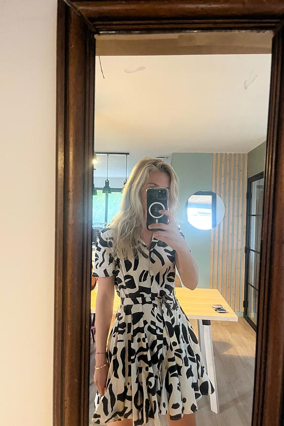 Associez cette robe joyeuse avec des sandales en cuir et un sac à main coloré pour un look estival parfait. • Robe chemisier en coton • Col chemise classique • Manches courtes • Coupe évasée • Ceinture assortie