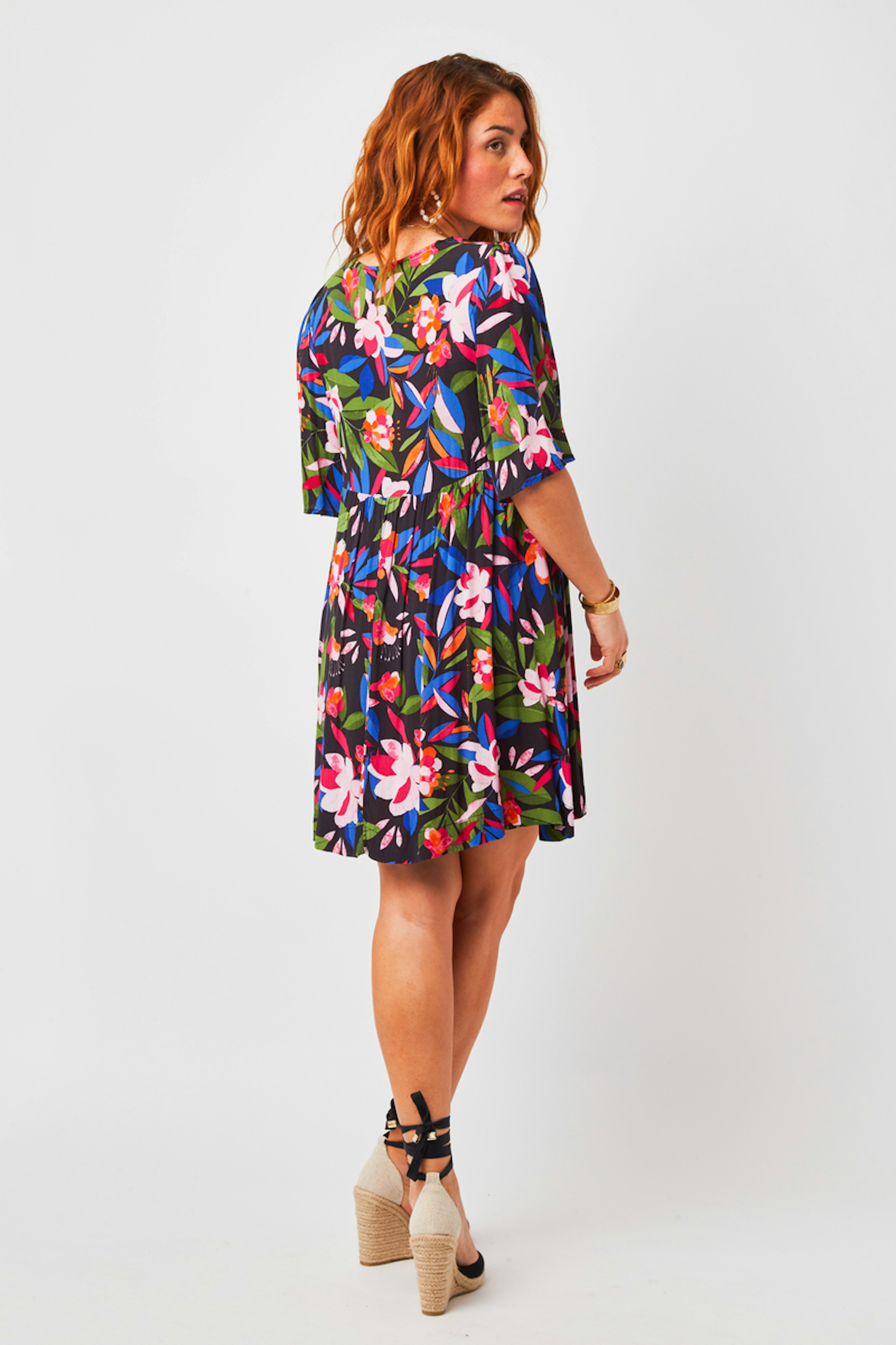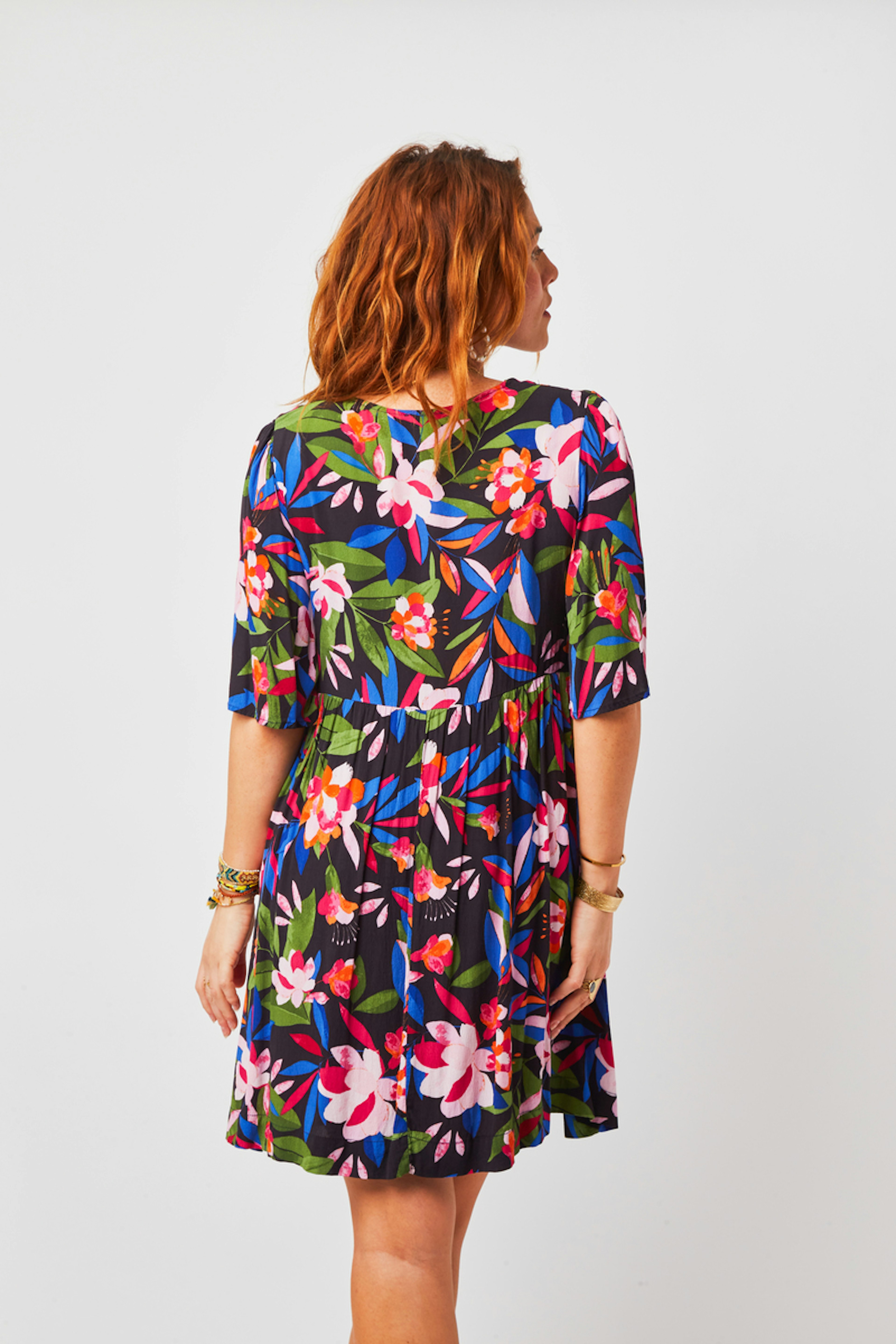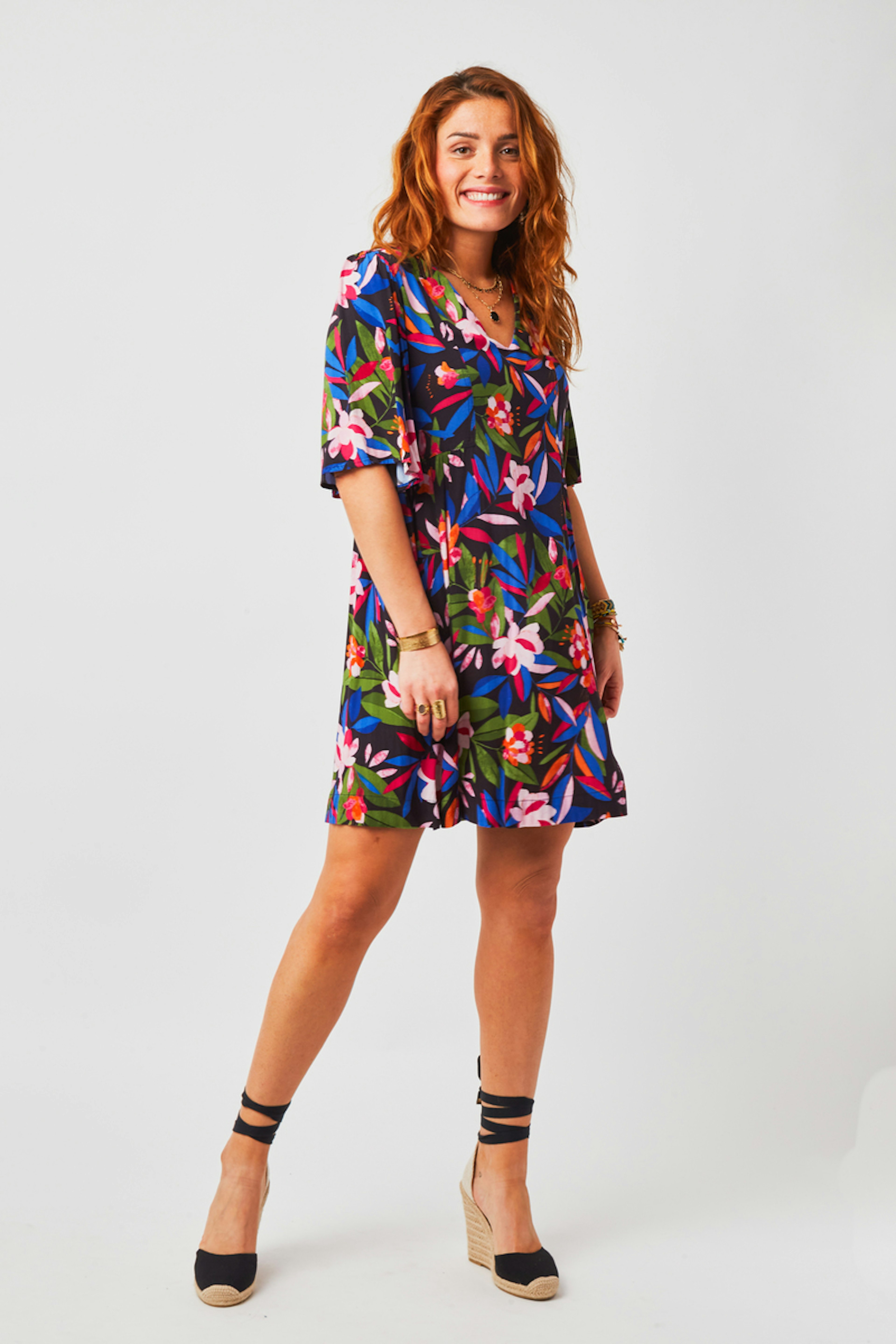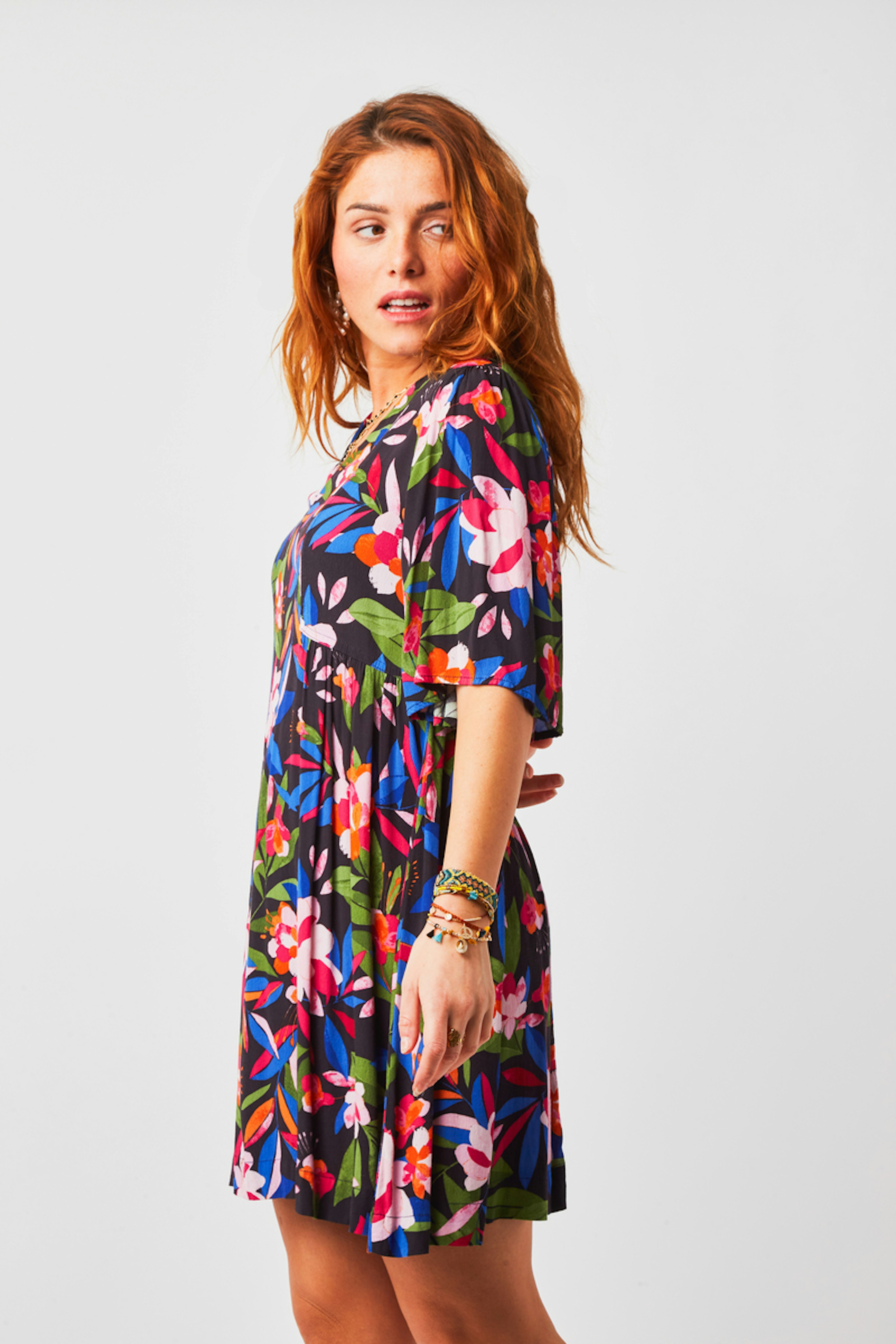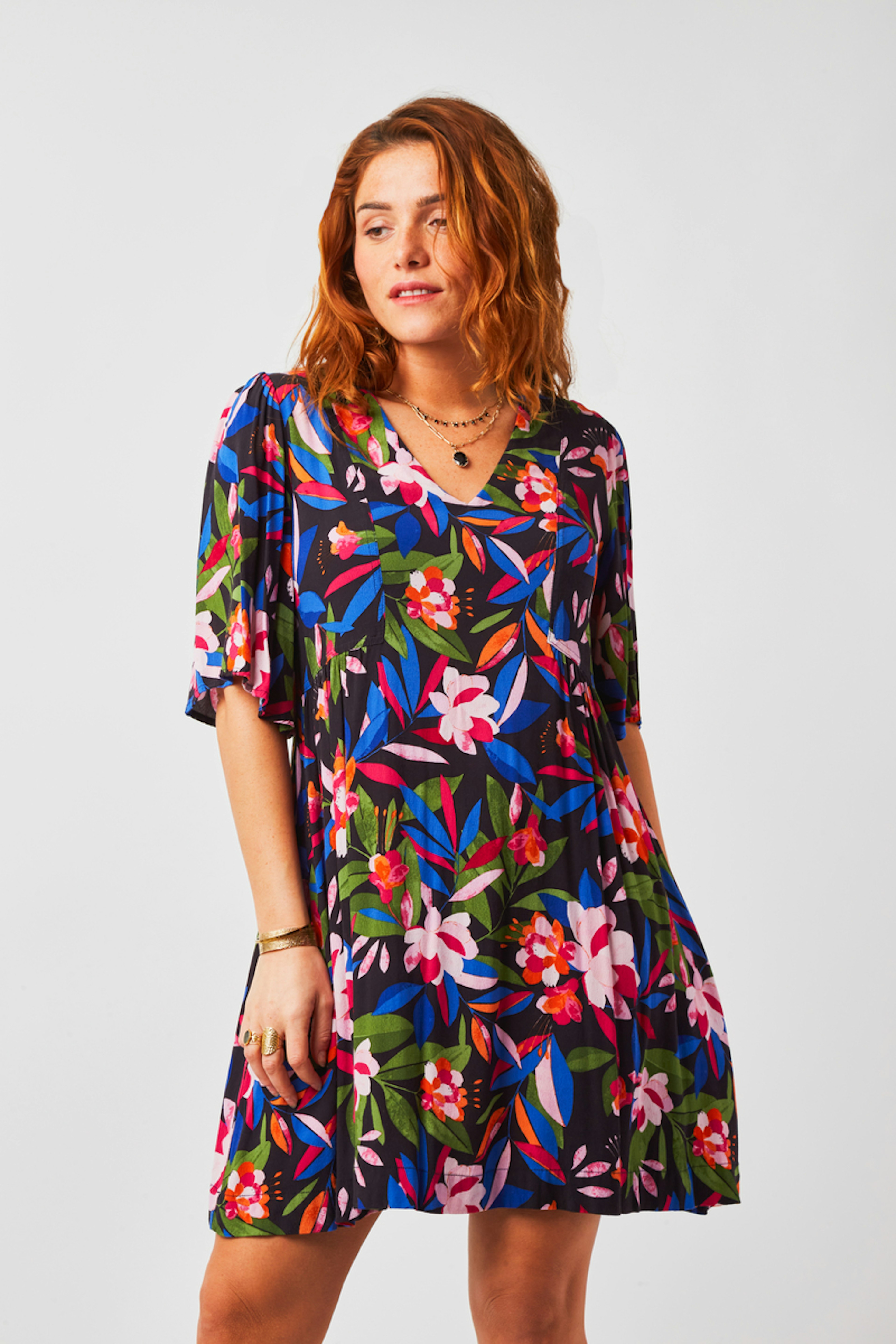 โข Robe courte col V en imprimรฉ G&M exclusif โข Manches papillon longueur coude โข Empiรจcements froncรฉs ร la taille โข Forme babydoll