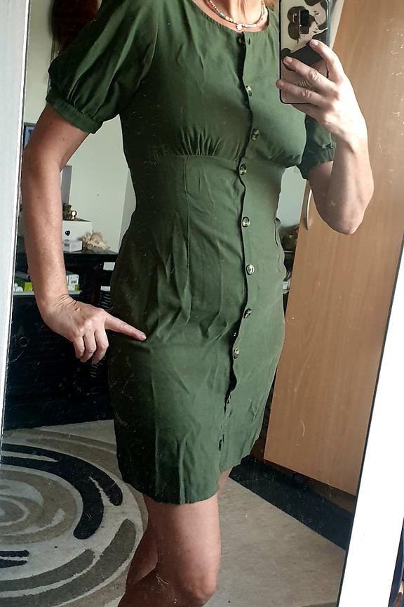 Hamptons est une robe fluide kaki en viscose et polyester. On aime sa coupe facile et ses boutons effet corne sur le devant.