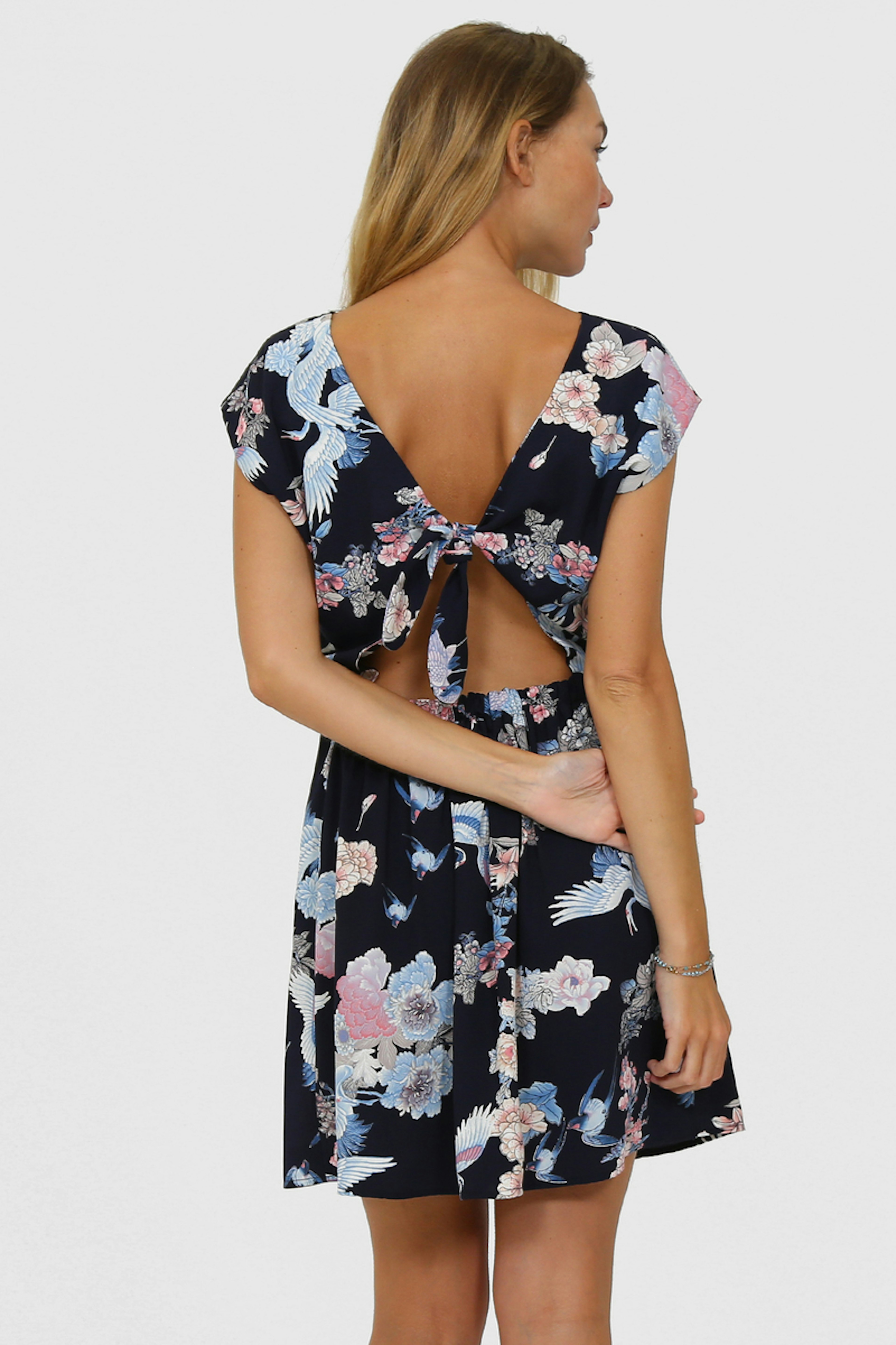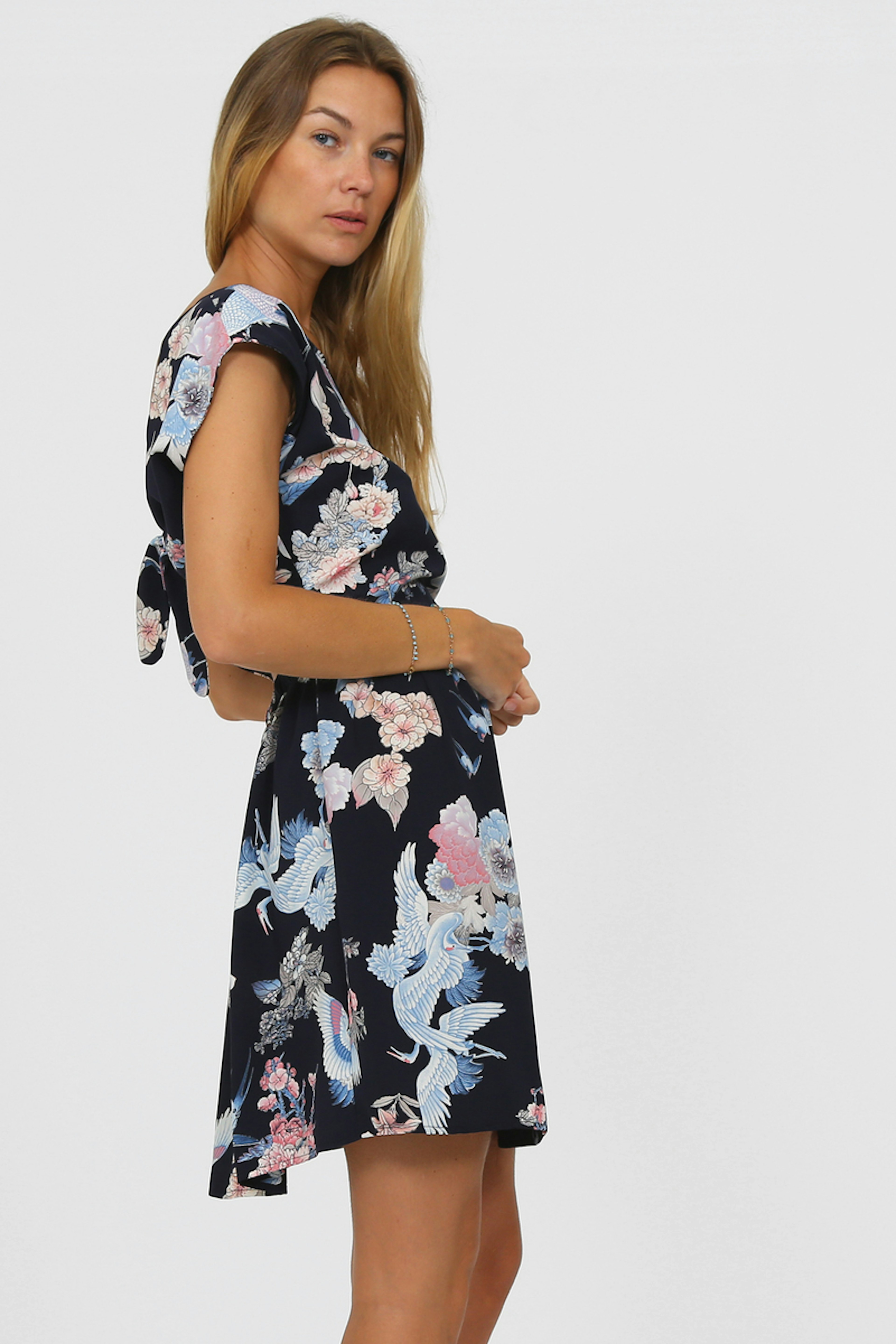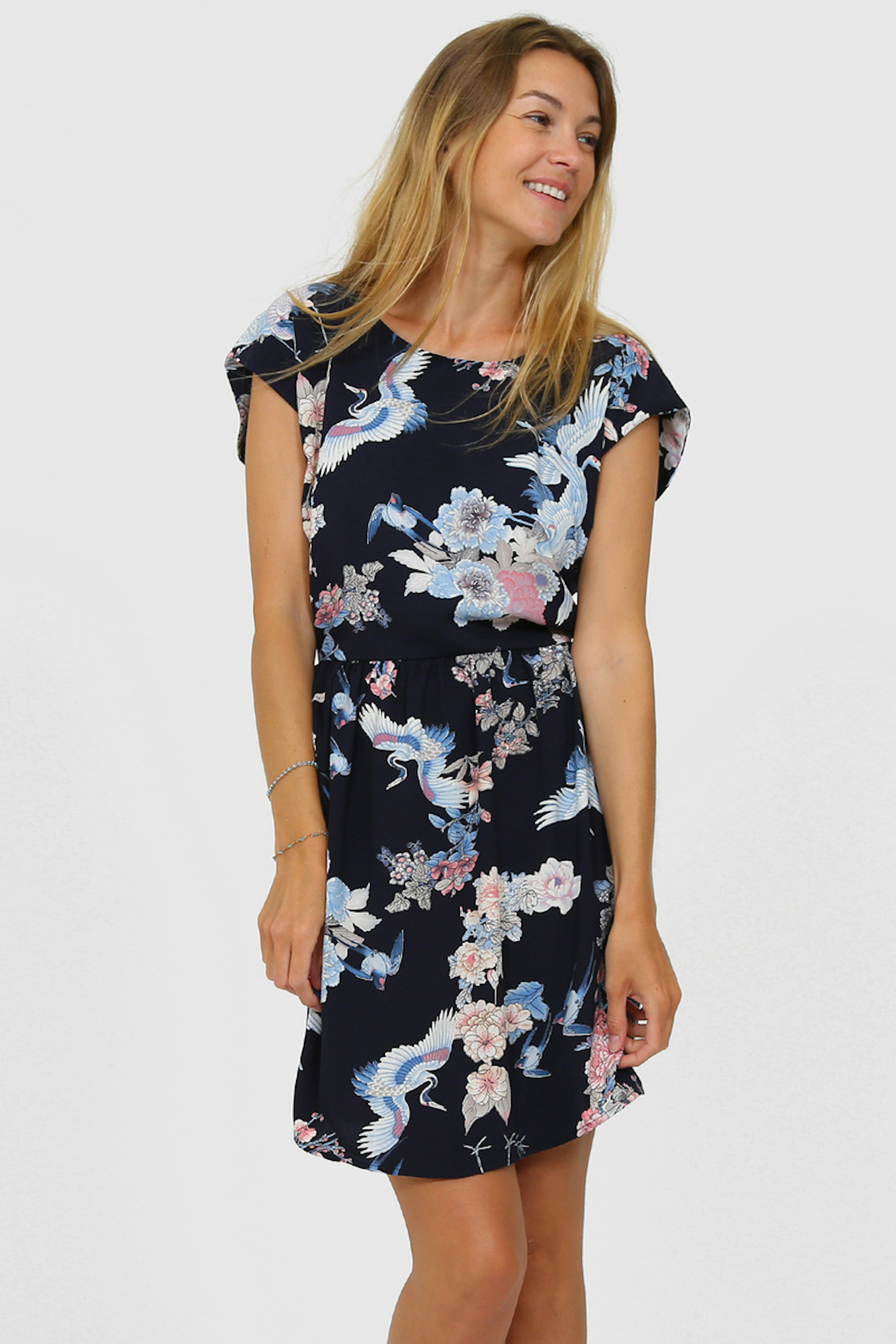 Robe bleu marine avec un imprimรฉ japonisant, manches courtes et col rond. รlastique placรฉ ร l'arriรจre et nouรฉe dans le dos.