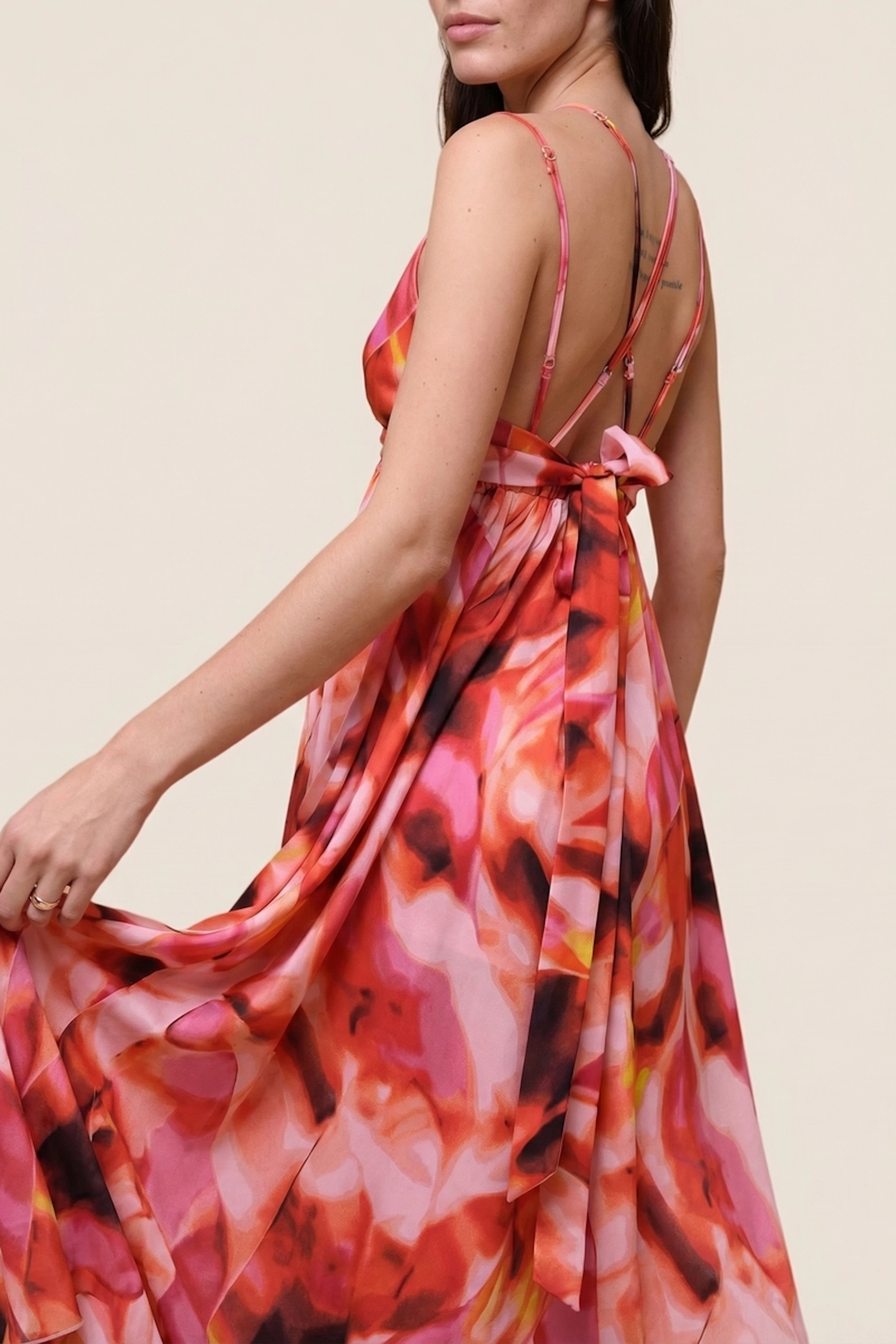Associez cette robe à des sandales dorées et des boucles d'oreilles pendantes pour un look estival éclatant. • Robe longue avec imprimé • Bretelles fines • Dos nu élégant • Coupe fluide • Nœud à l'arrière