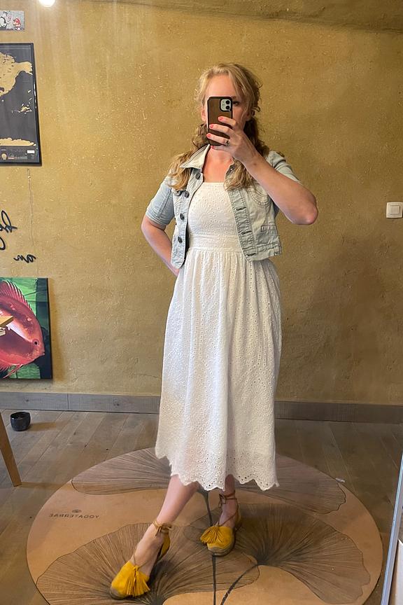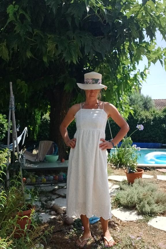 Cette robe longue en coton est votre alliée estivale parfaite. Accessoirisez-la avec des sandales en cuir et des bijoux dorés pour un look chic et décontracté sous le soleil. Parfaite pour les journées ensoleillées. • Robe longue en coton • Sans manches • Élastique dans le dos • Doublée • Broderies fleuries