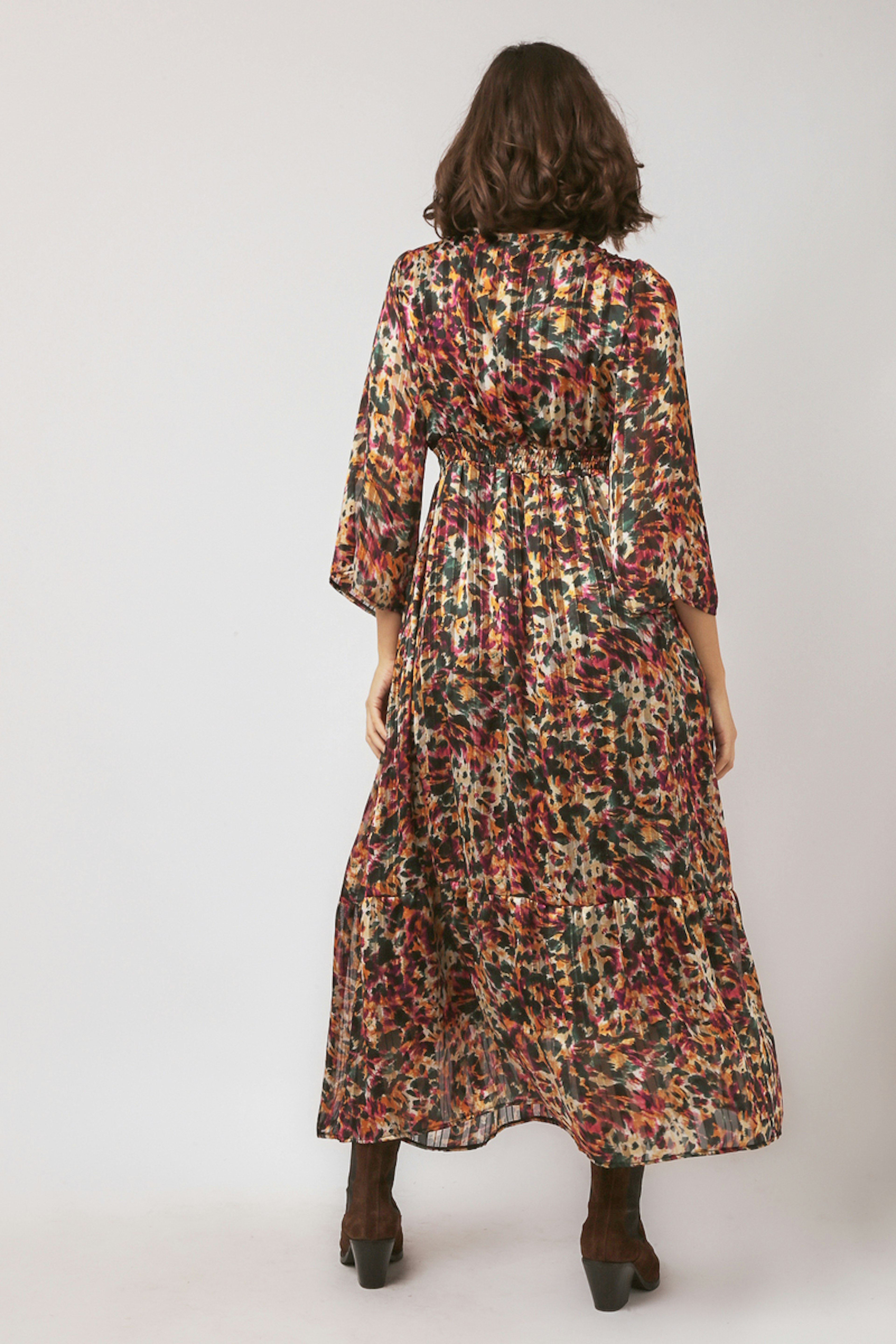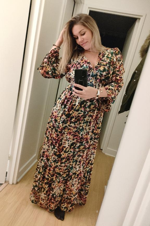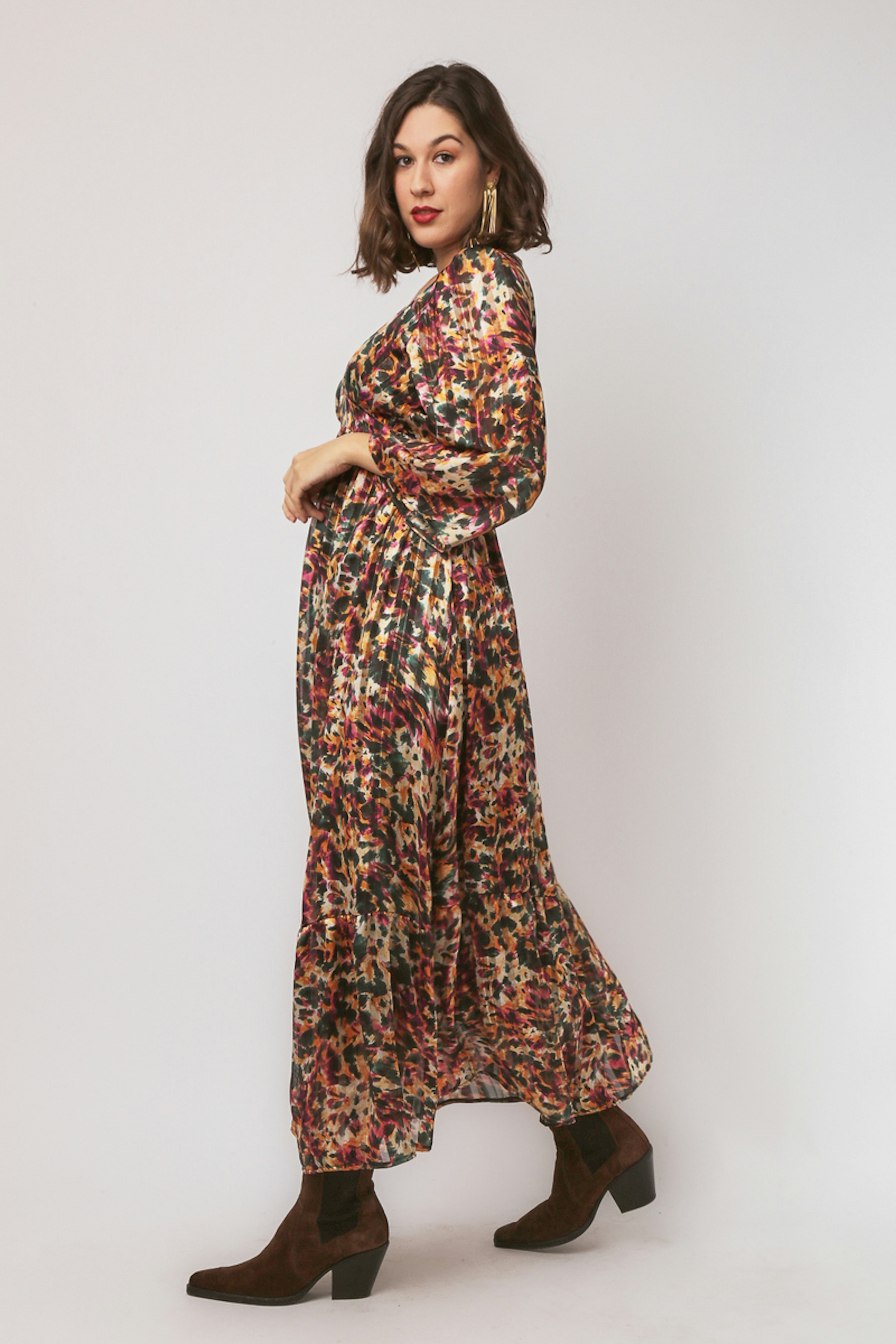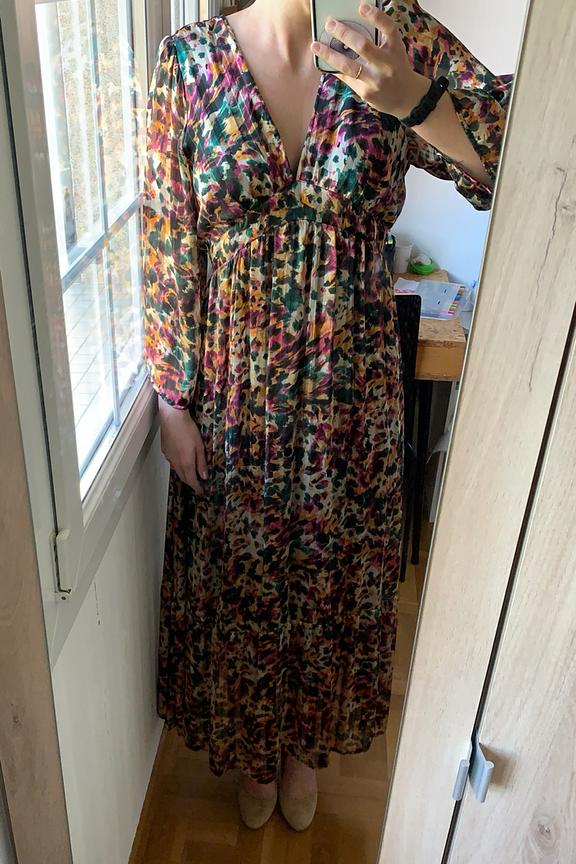 โข Robe longue fleurie โข Col en V โข Manches 3/4 resserrรฉes par un รฉlastique aux poignets โข Elastique ร la taille