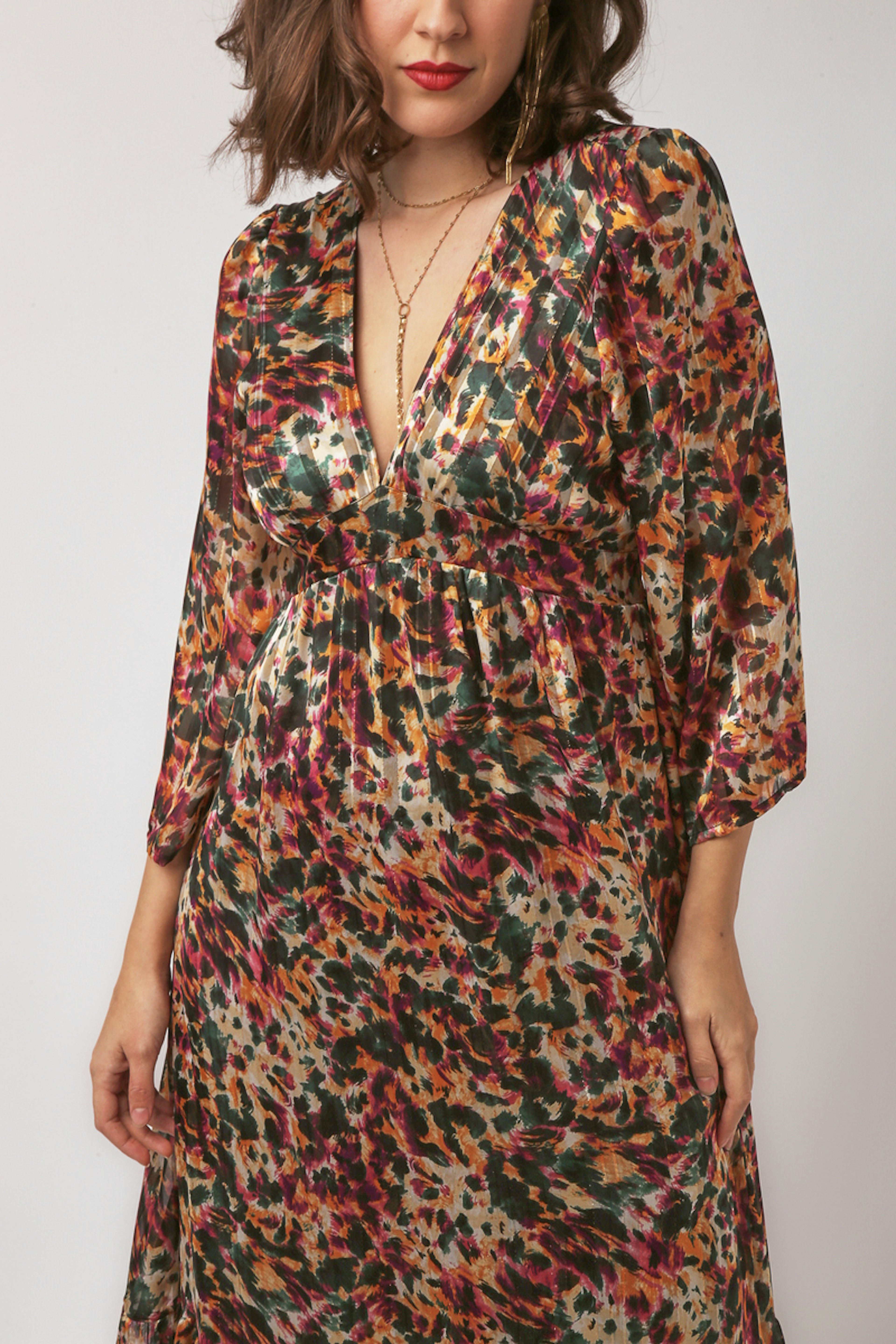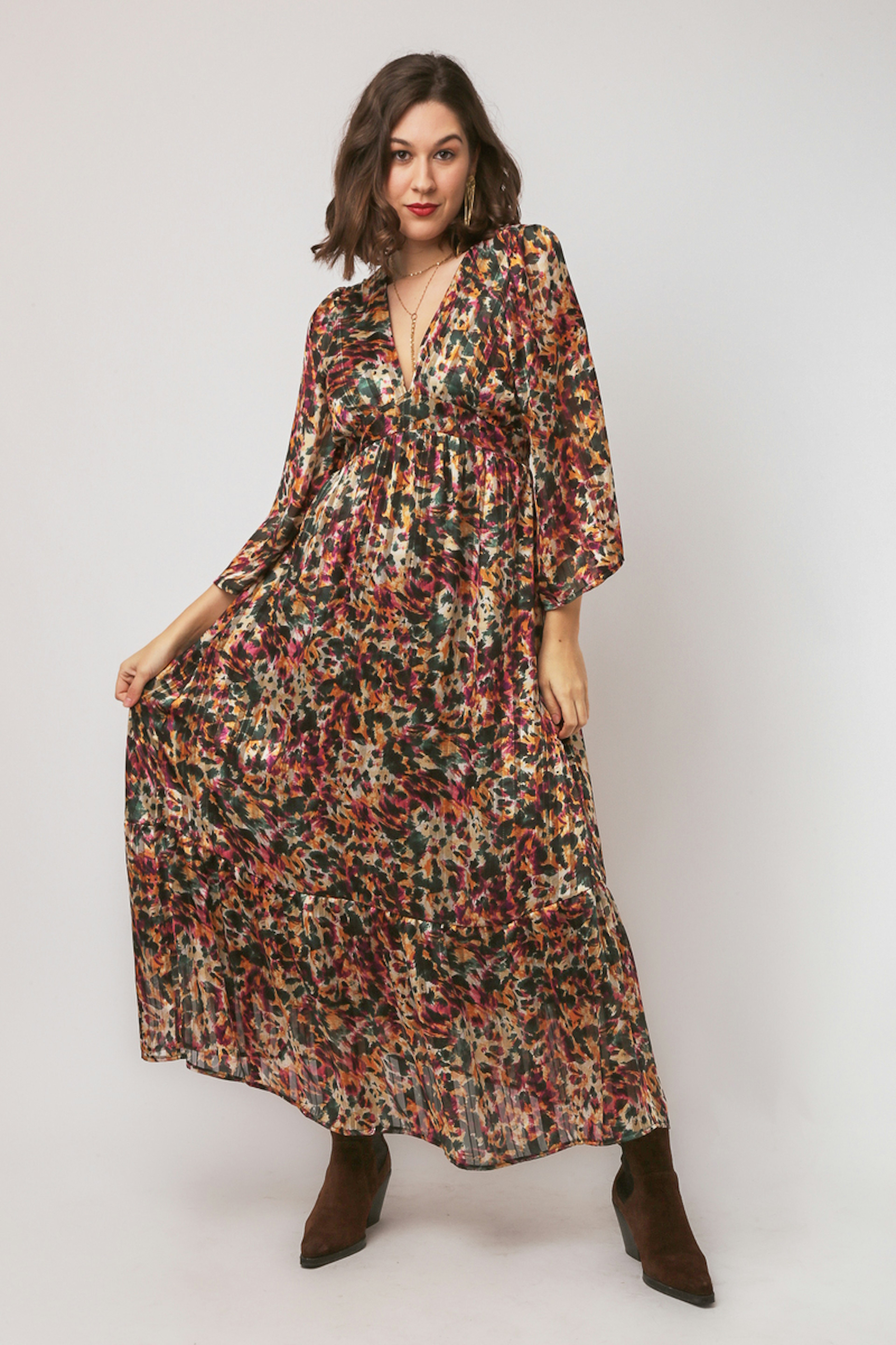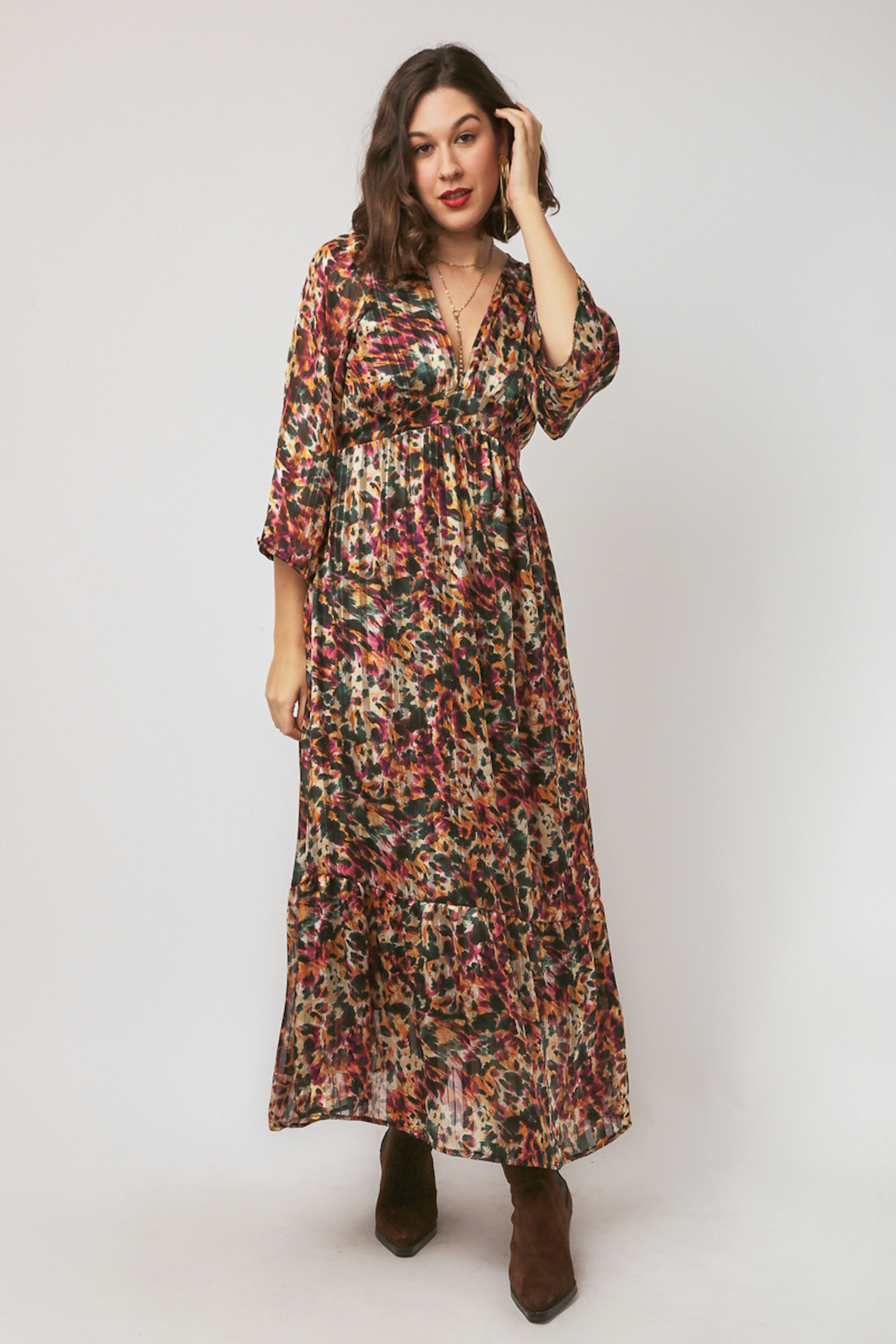 โข Robe longue fleurie โข Col en V โข Manches 3/4 resserrรฉes par un รฉlastique aux poignets โข Elastique ร la taille