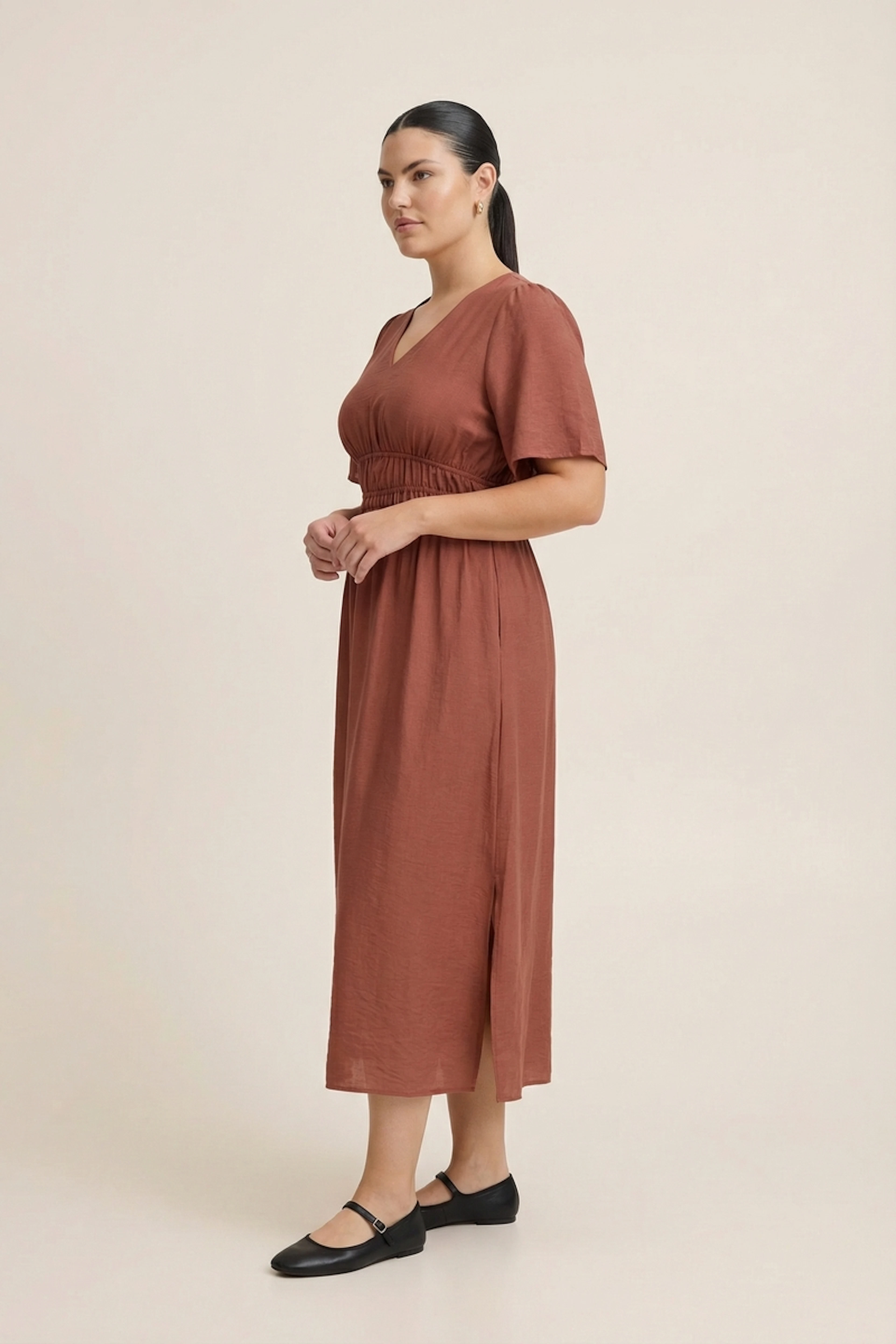 Associez cette ravissante robe avec des sandales à lanières et un panier en osier pour un look estival chic. • Robe midi en lin • Col en V flatteur • Manches courtes évasées • Taille empire smockée • Fente latérale subtile