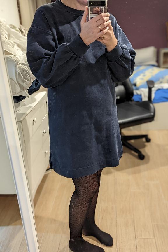 โข Robe sweat ร manches longues marine โข Manches resserrรฉes au poignet โข Longueur genou โข Coupe droite โข Col rond