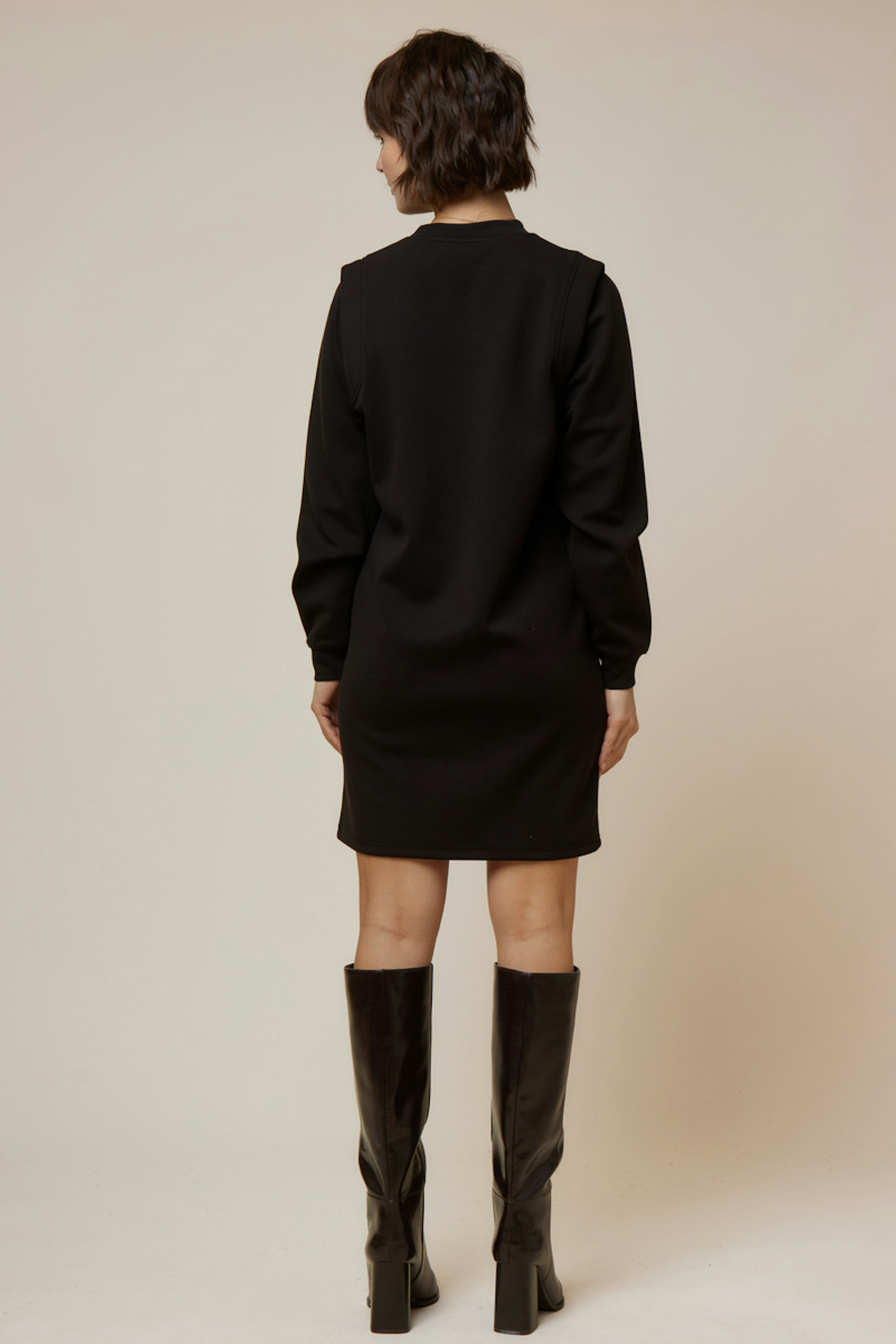 Associez cette robe noire avec des bottes hautes en cuir et un manteau structuré. Idéale pour l'hiver urbain ! • Robe droite • Coupe ample • Manches longues • Col rond • Couleur noire profonde