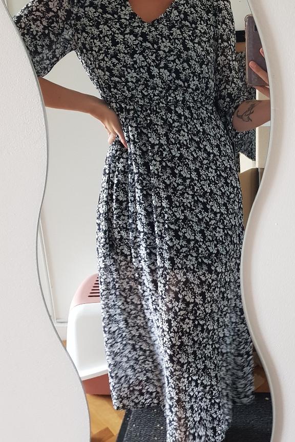 โข Robe longue ร imprimรฉ fleuri noir et blanc โข Encolure en v โข Manches 3/4 โข Doublure