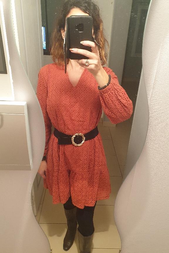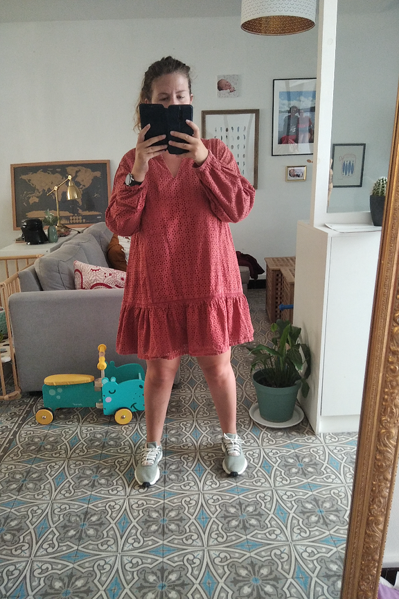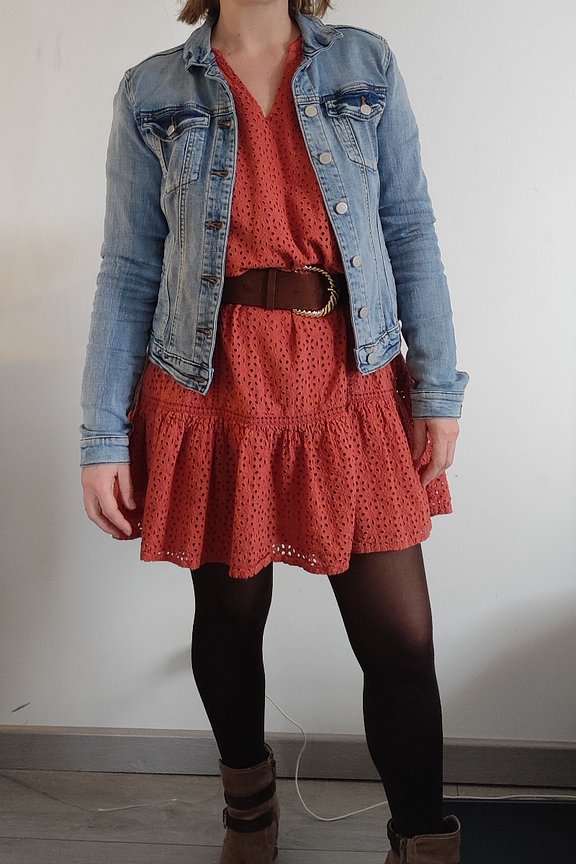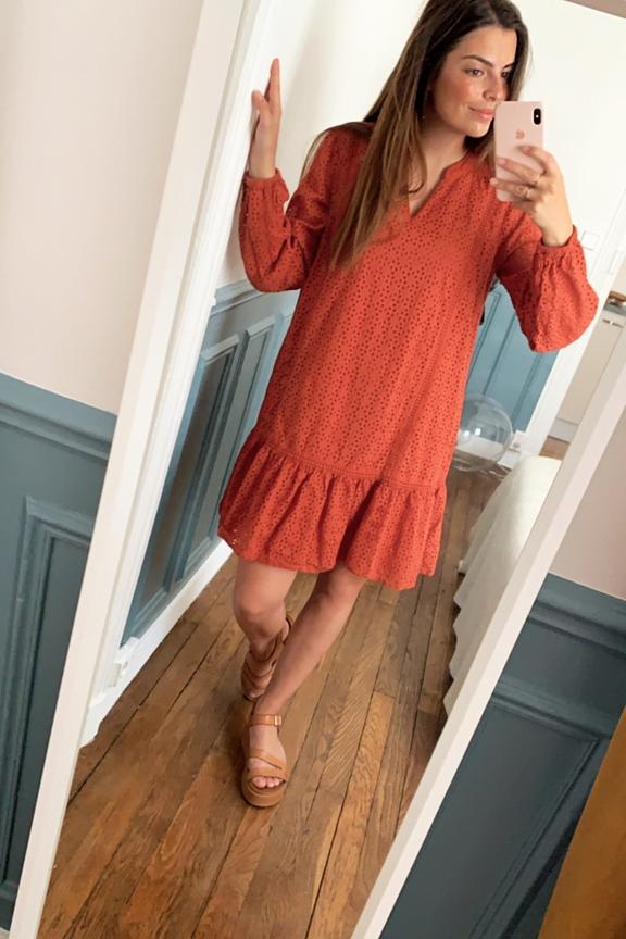 Immila est une robe en coton brodรฉ corail. On aime sa coupe facile et son tissu travaillรฉ. A porter cet รฉtรฉ avec des sandales et un panier.