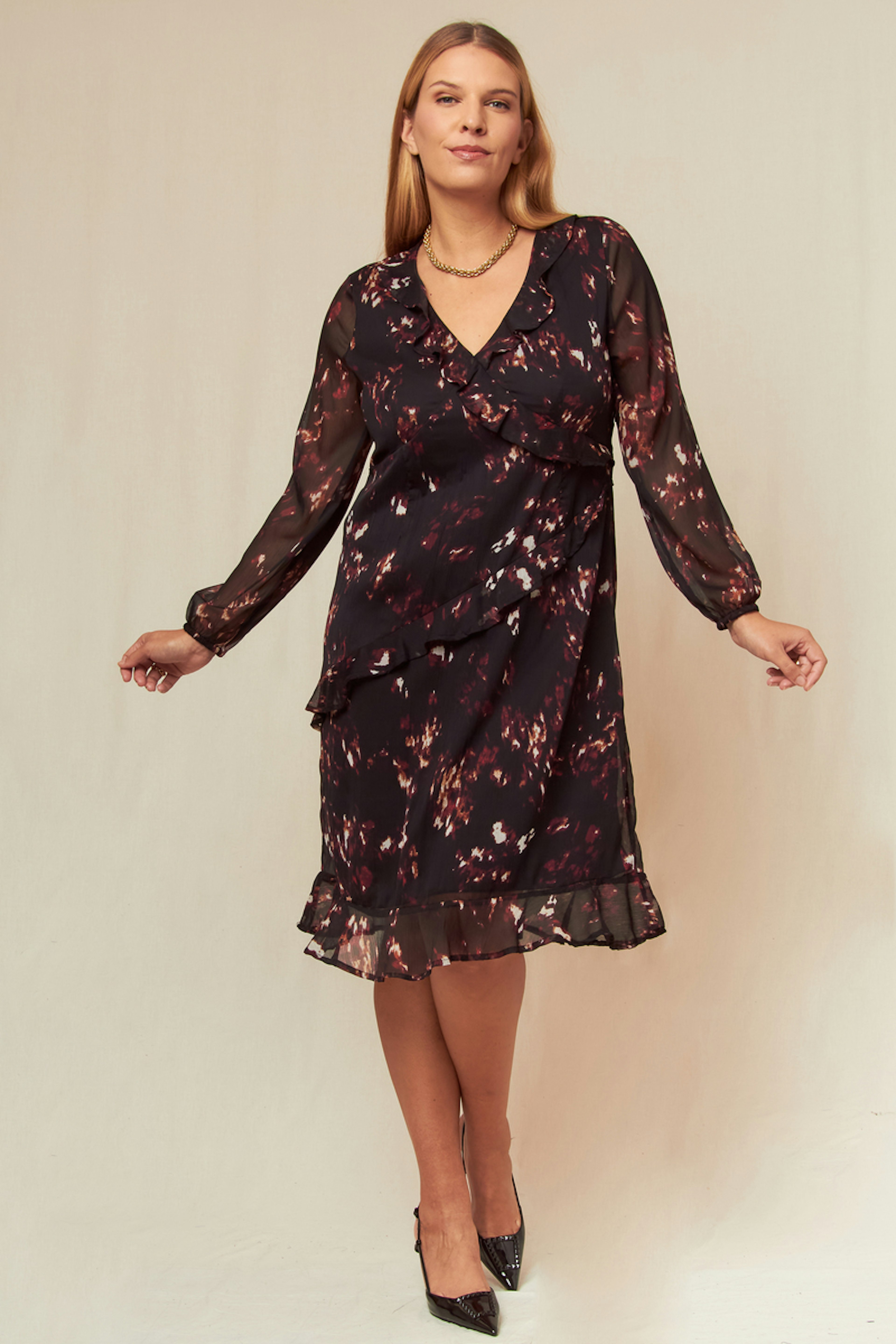 Optez pour des escarpins noirs et une pochette dorée pour un look chic en toutes saisons. • Robe imprimée • Coupe portefeuille • Décolleté en V • Manches longues • Imprimé floral