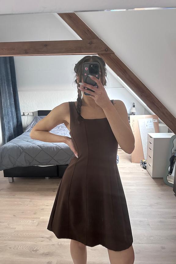 Portez cette robe avec des bottines et une veste en cuir pour un look hivernal chic. • Robe trapèze • Col carré • Sans manches • Coupe évasée • Longueur au-dessus du genou