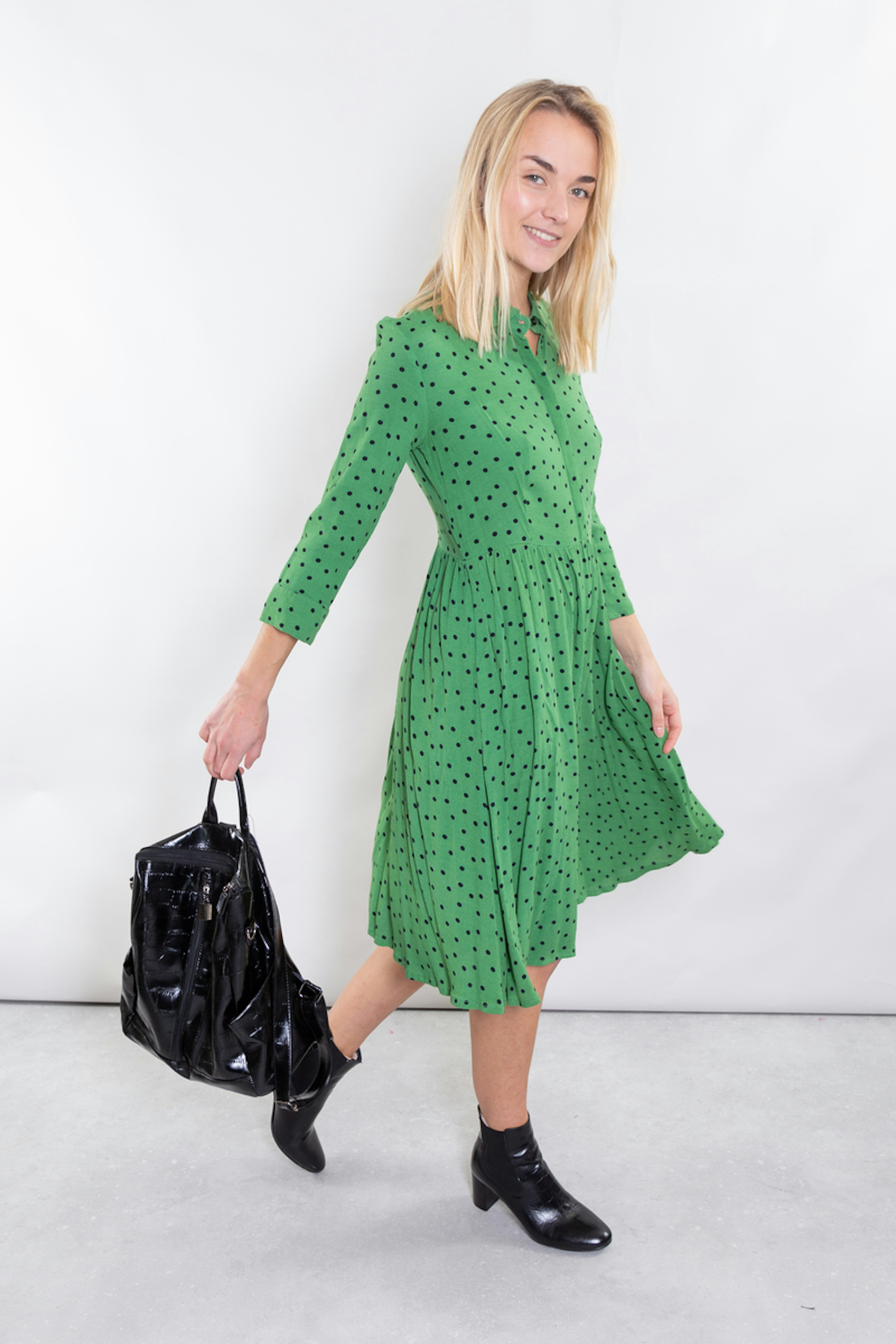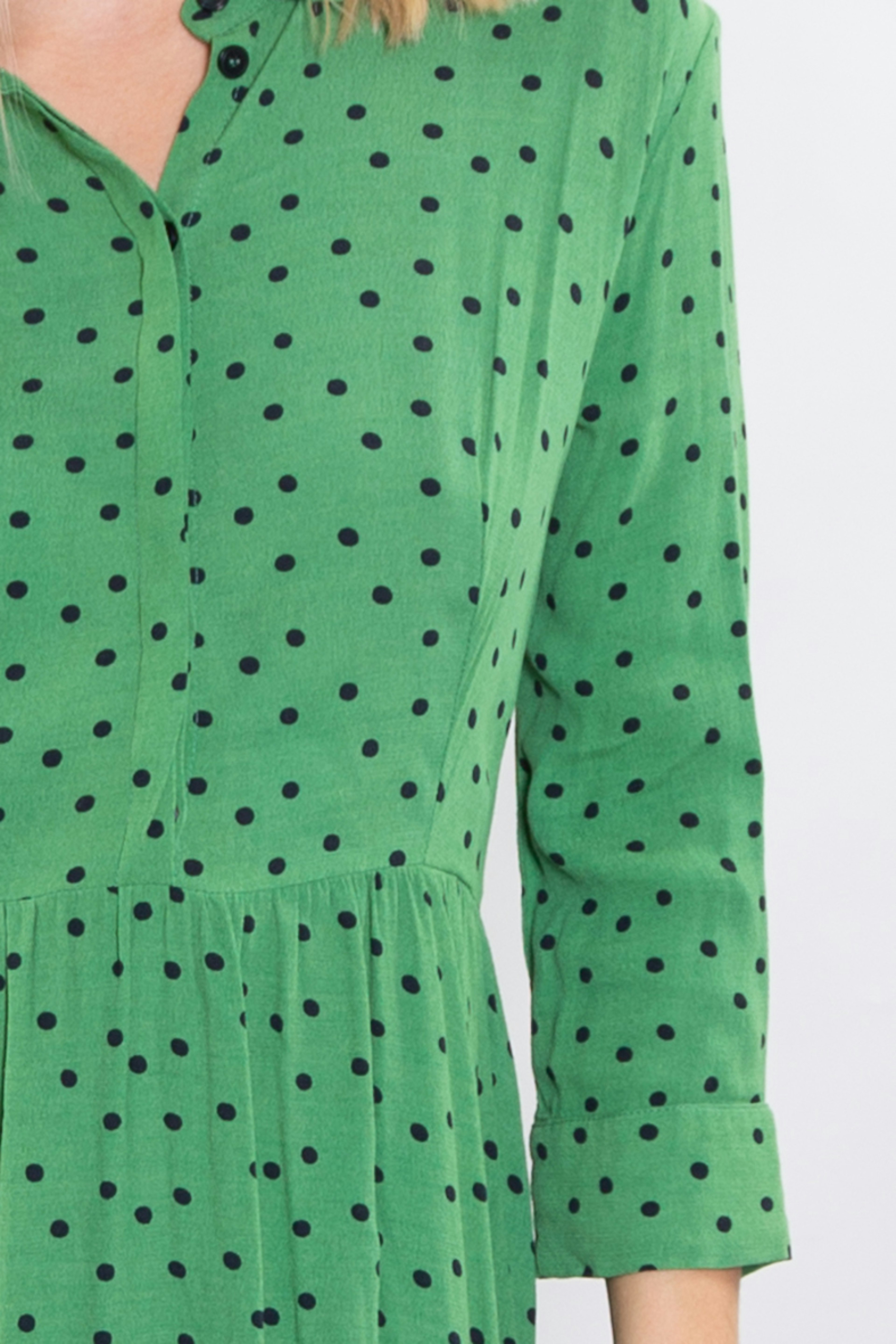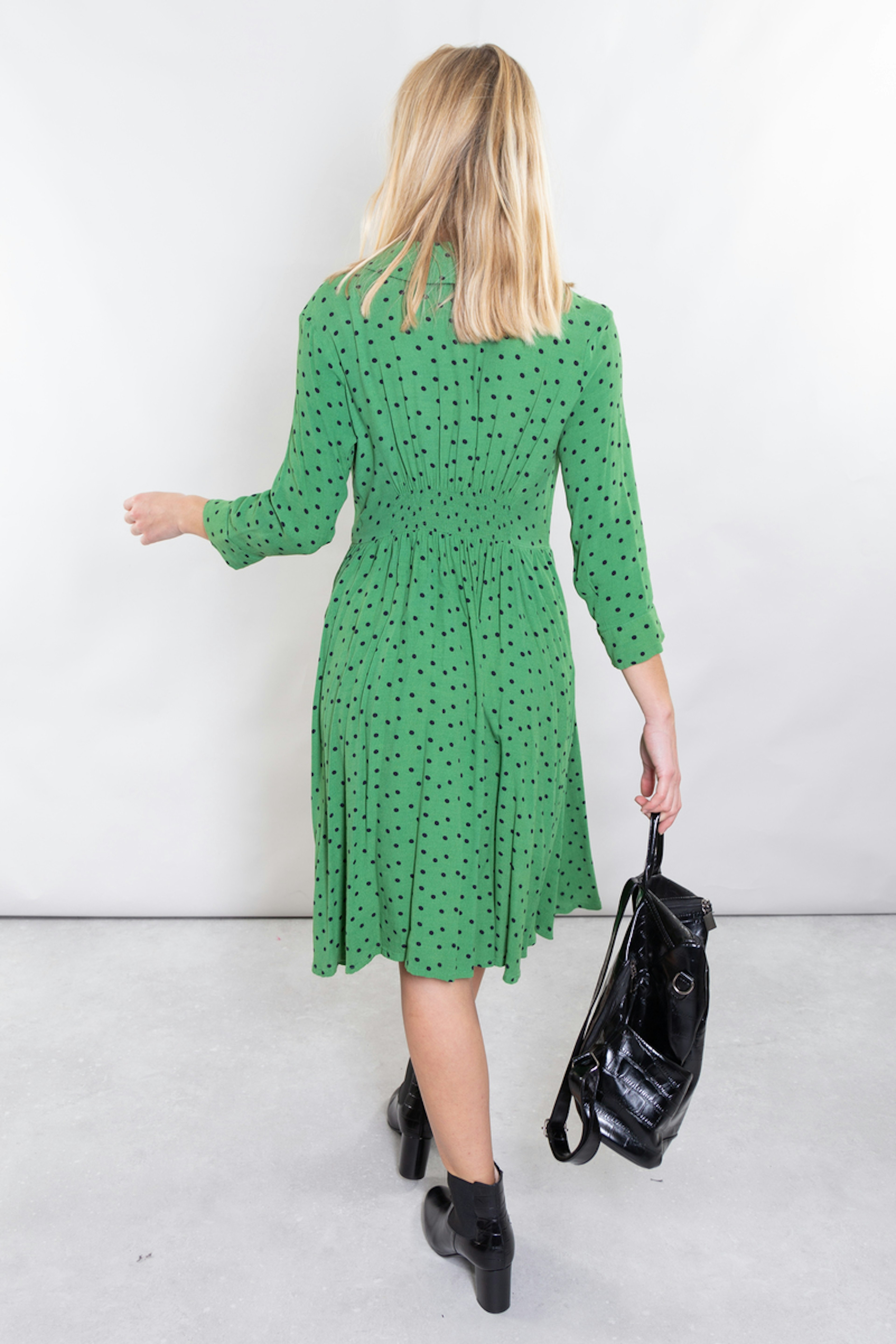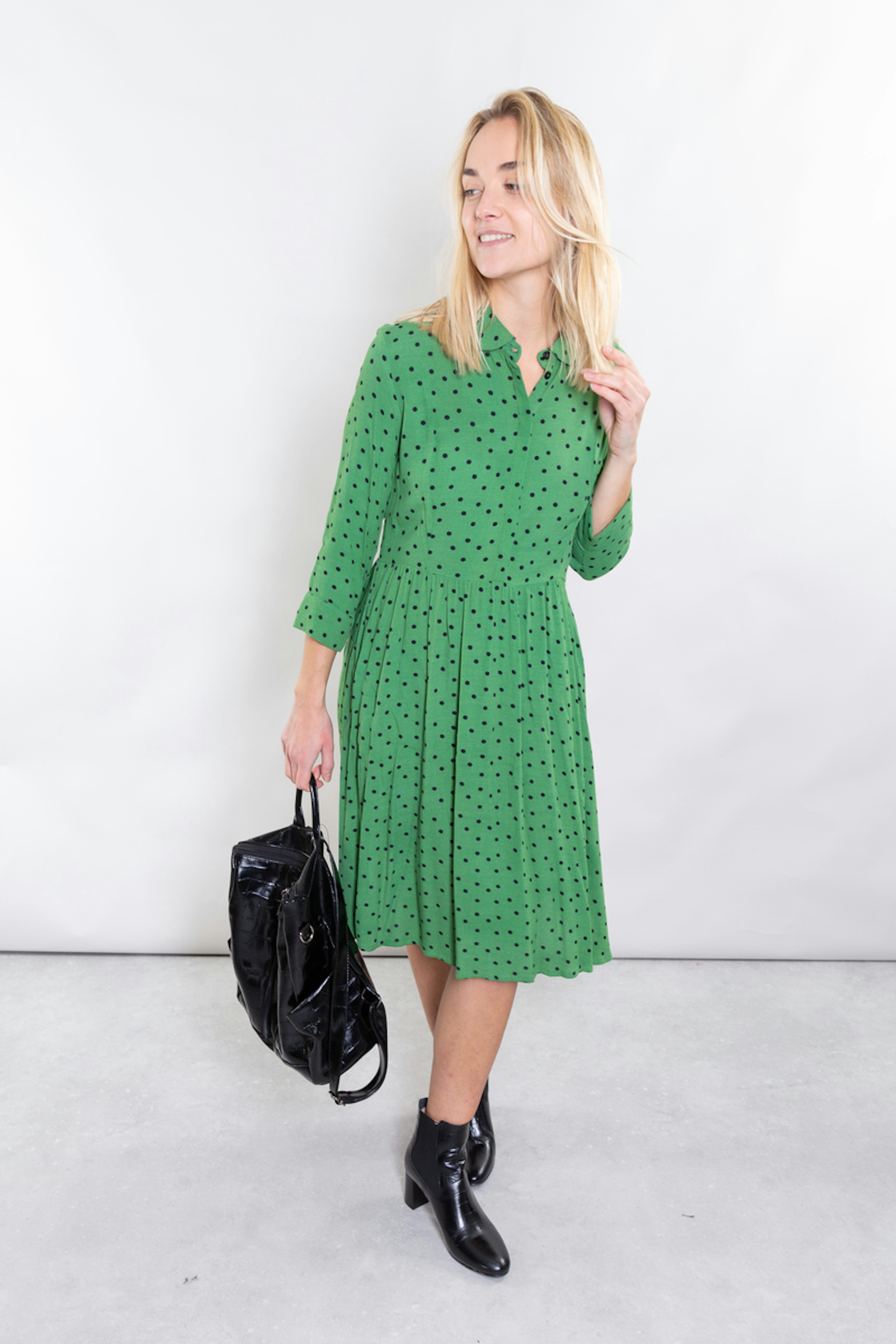 โข Robe longueur au genou, col claudine โข Ouverture devant par de petits boutons cachรฉs sous la patte de boutonnage, plus un premier bouton visible. โข Manches 3/4, smocks dos au niveau de la taille โข Partie jupe froncรฉe โข Poches cachรฉes dans les coutures cรดtรฉs
