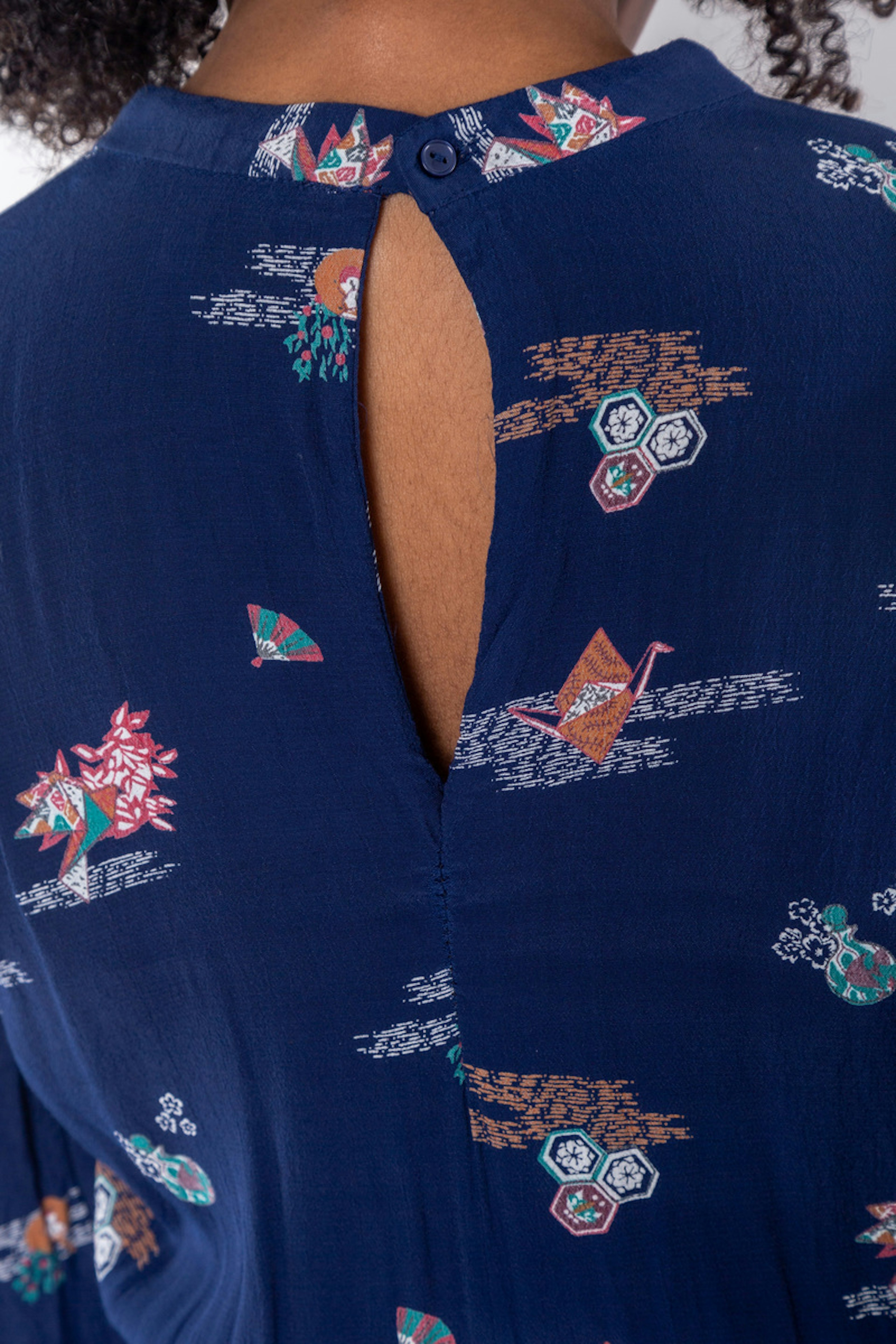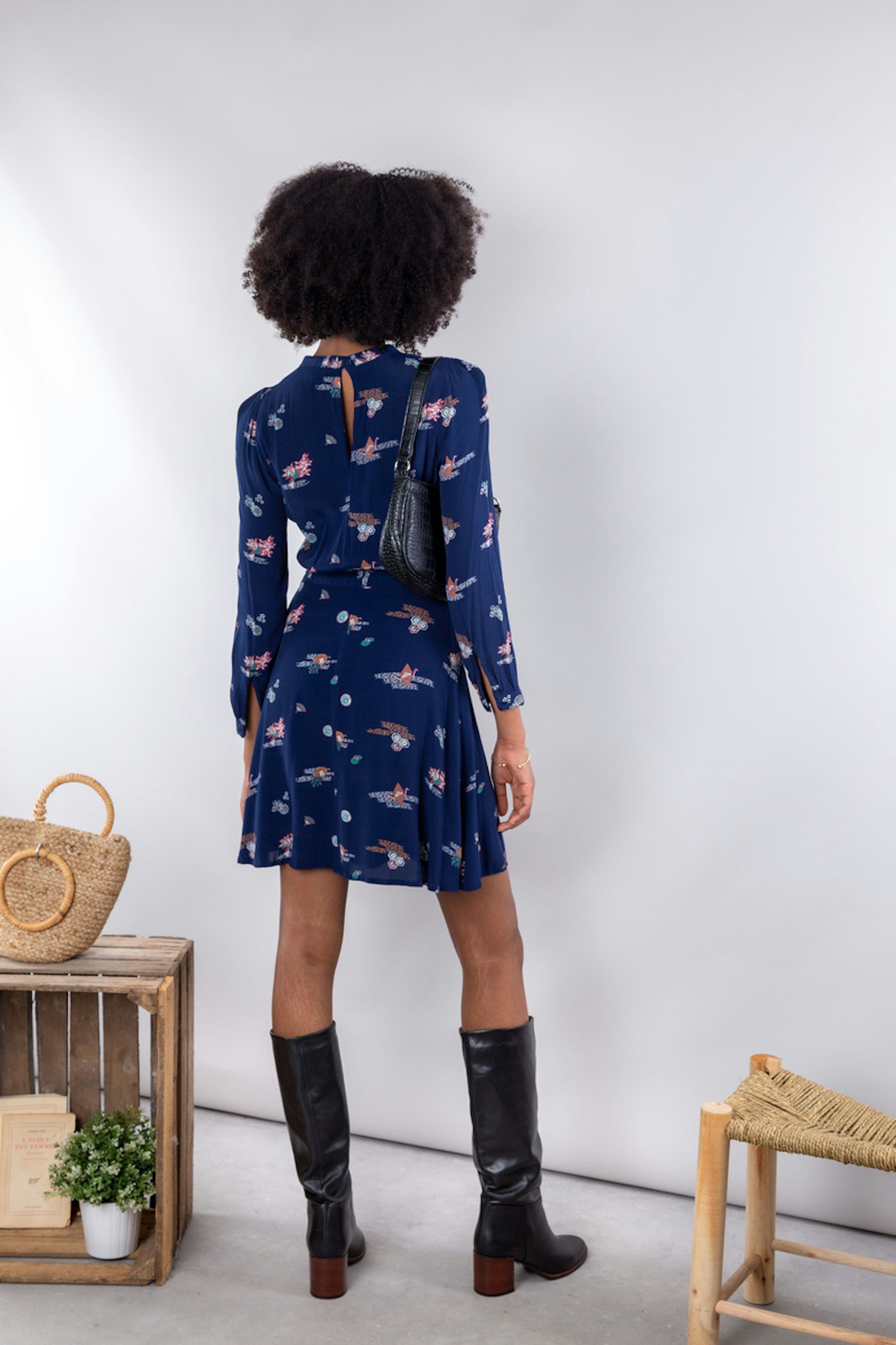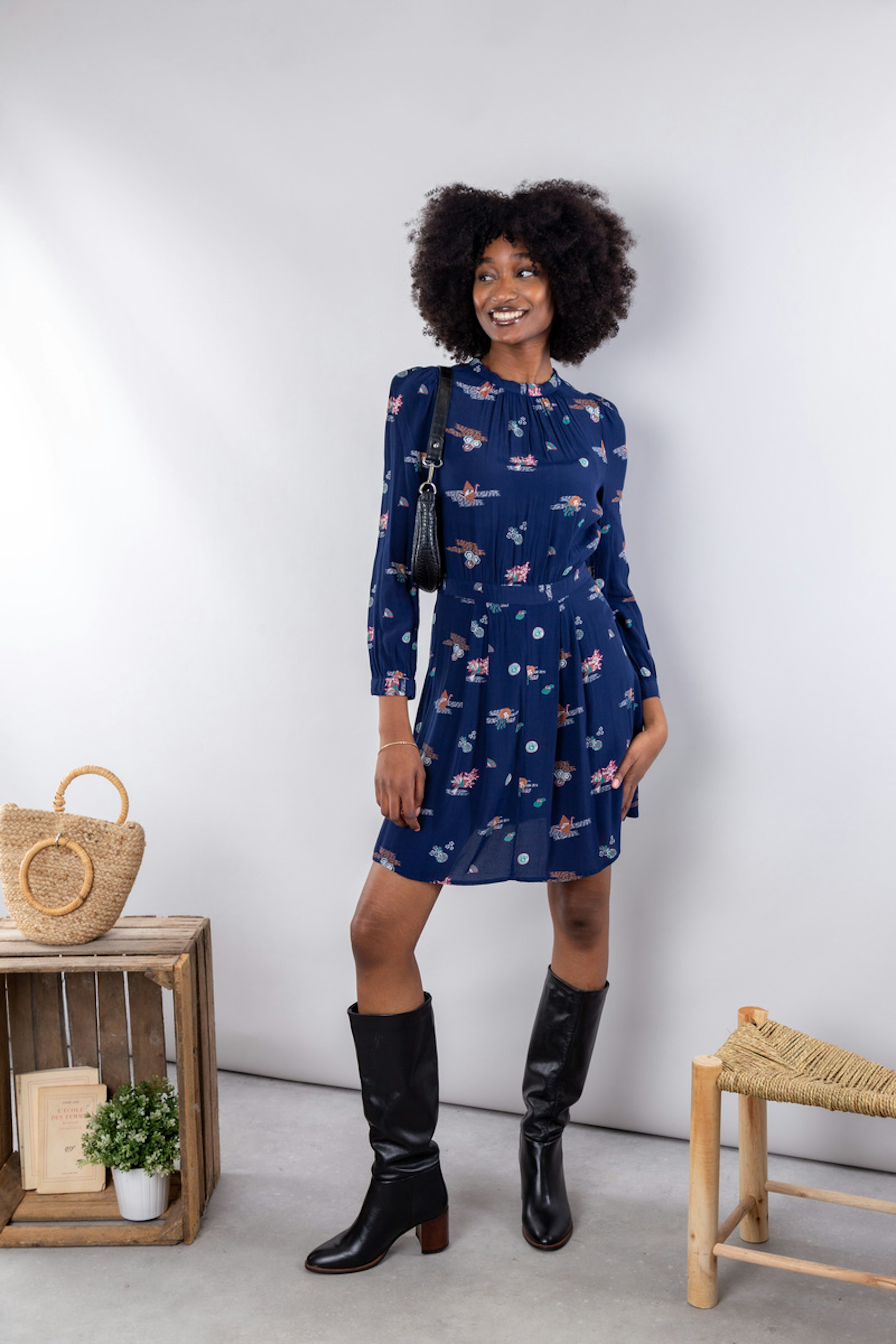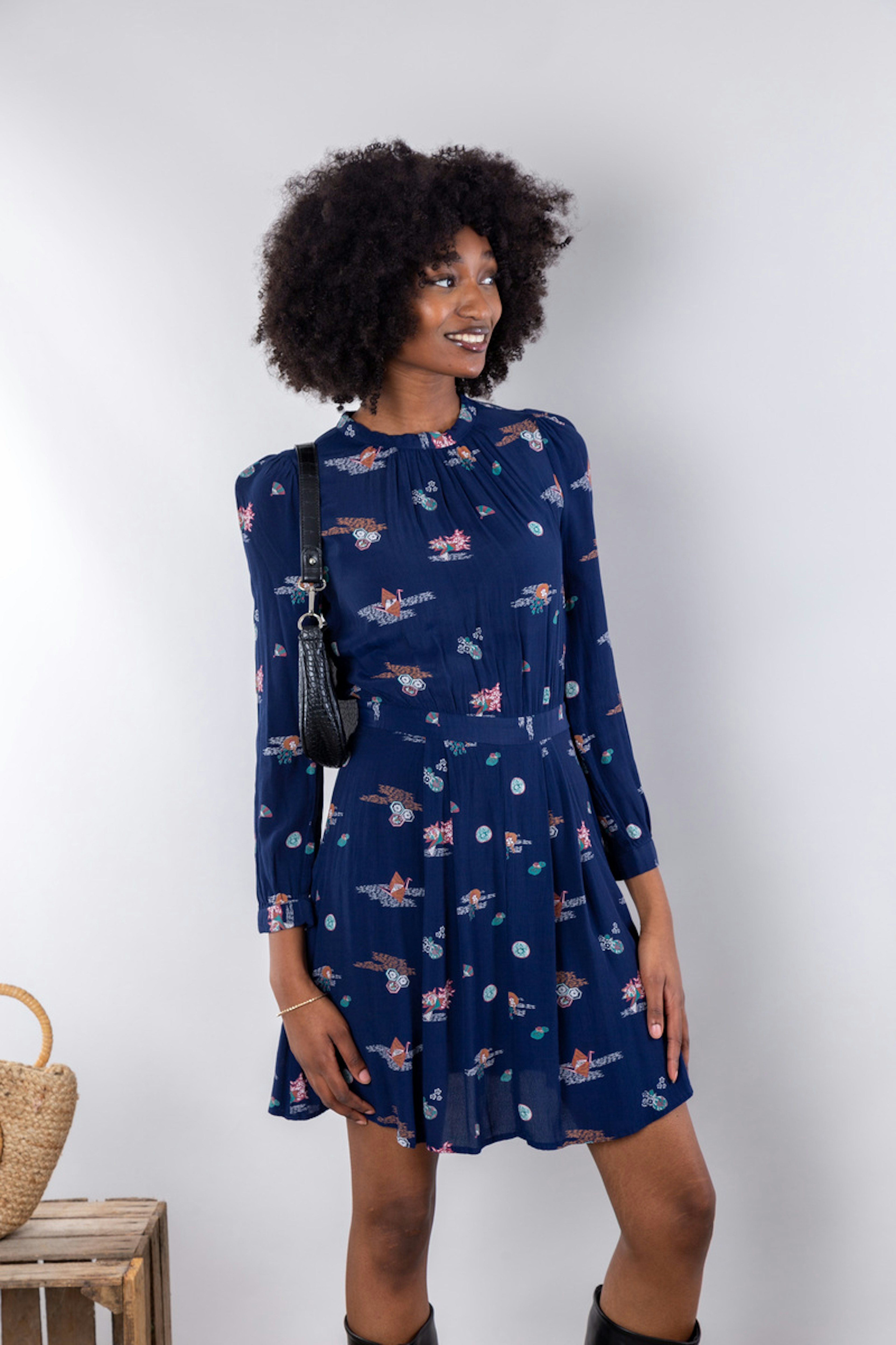 โข Notre robe courte bleu marine en tissu fluide est idรฉale pour toutes les occasions โข Confectionnรฉe avec un tissu doublรฉ pour plus de confort, elle est ornรฉe d'imprimรฉs dessinรฉs uniques pour un look original โข Les manches longues et le col montant froncรฉ ajoutent une touche รฉlรฉgante ร cette robe tendance