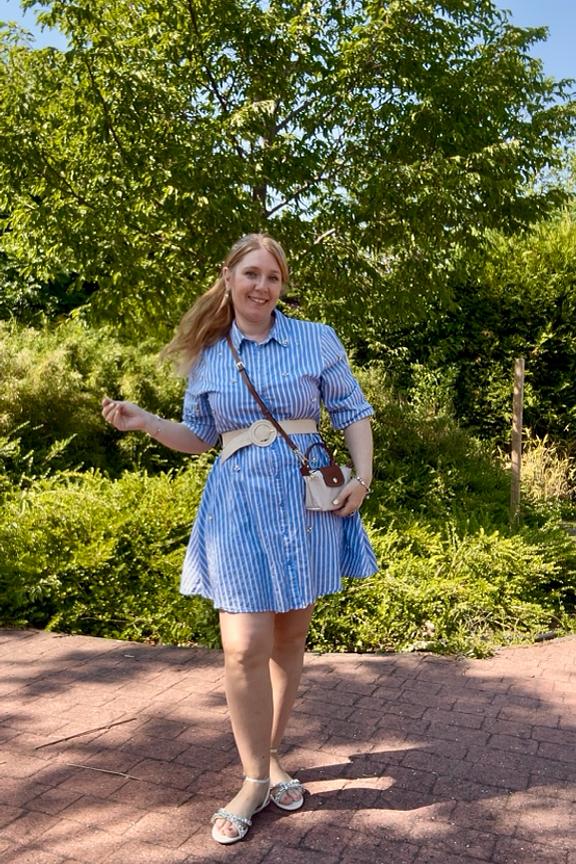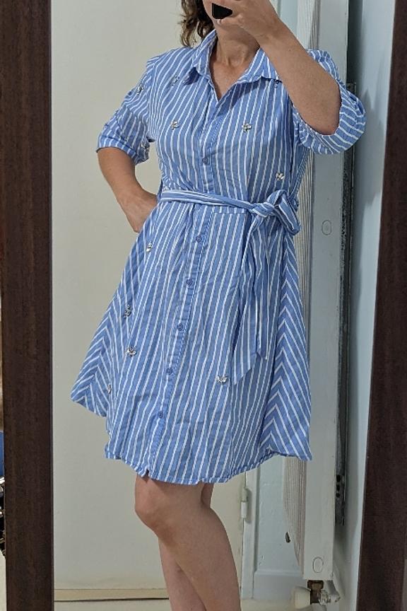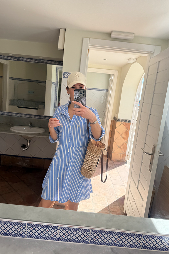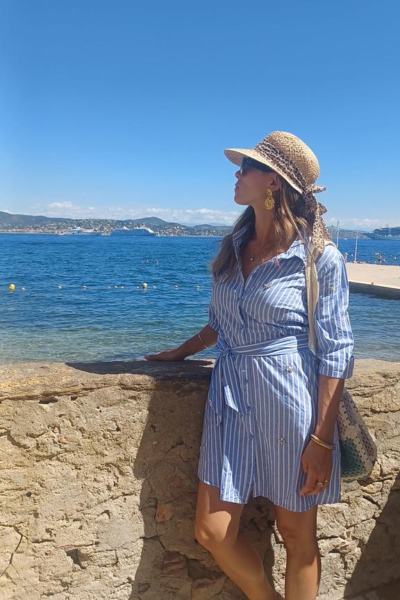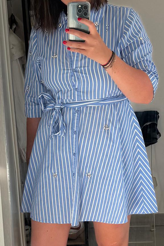 Associez cette robe chemise à des baskets blanches pour un look estival décontracté. Idéal pour les journées ensoleillées. • Robe en coton • Coupe cintrée à la taille • Manches trois-quarts • Col chemise • Motif rayé
