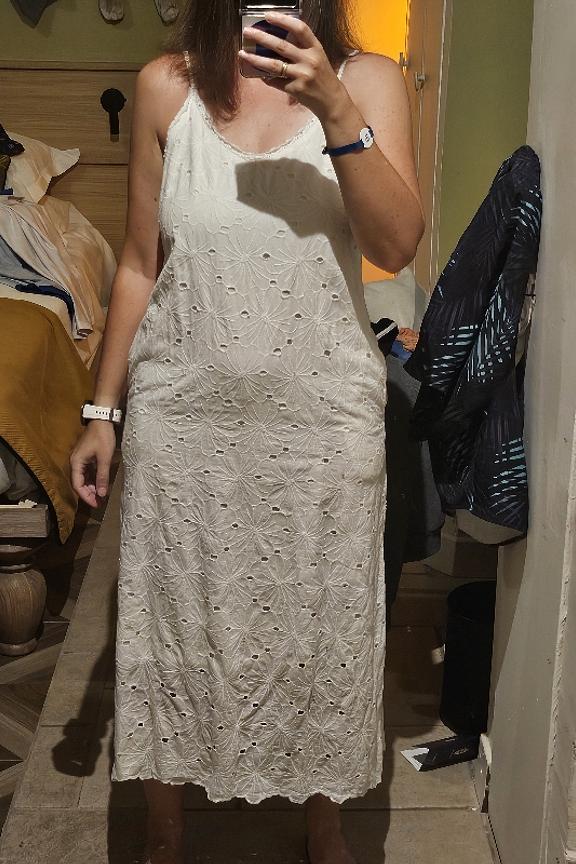 Idéale pour les jours ensoleillés, associez cette charmante robe blanche à des sandales dorées. Parfaite pour toute saison. • Robe longue droite en coton brodée • Bretelles fines ajustables • Col V féminin • Fente discrète avant • Motifs floraux brodés