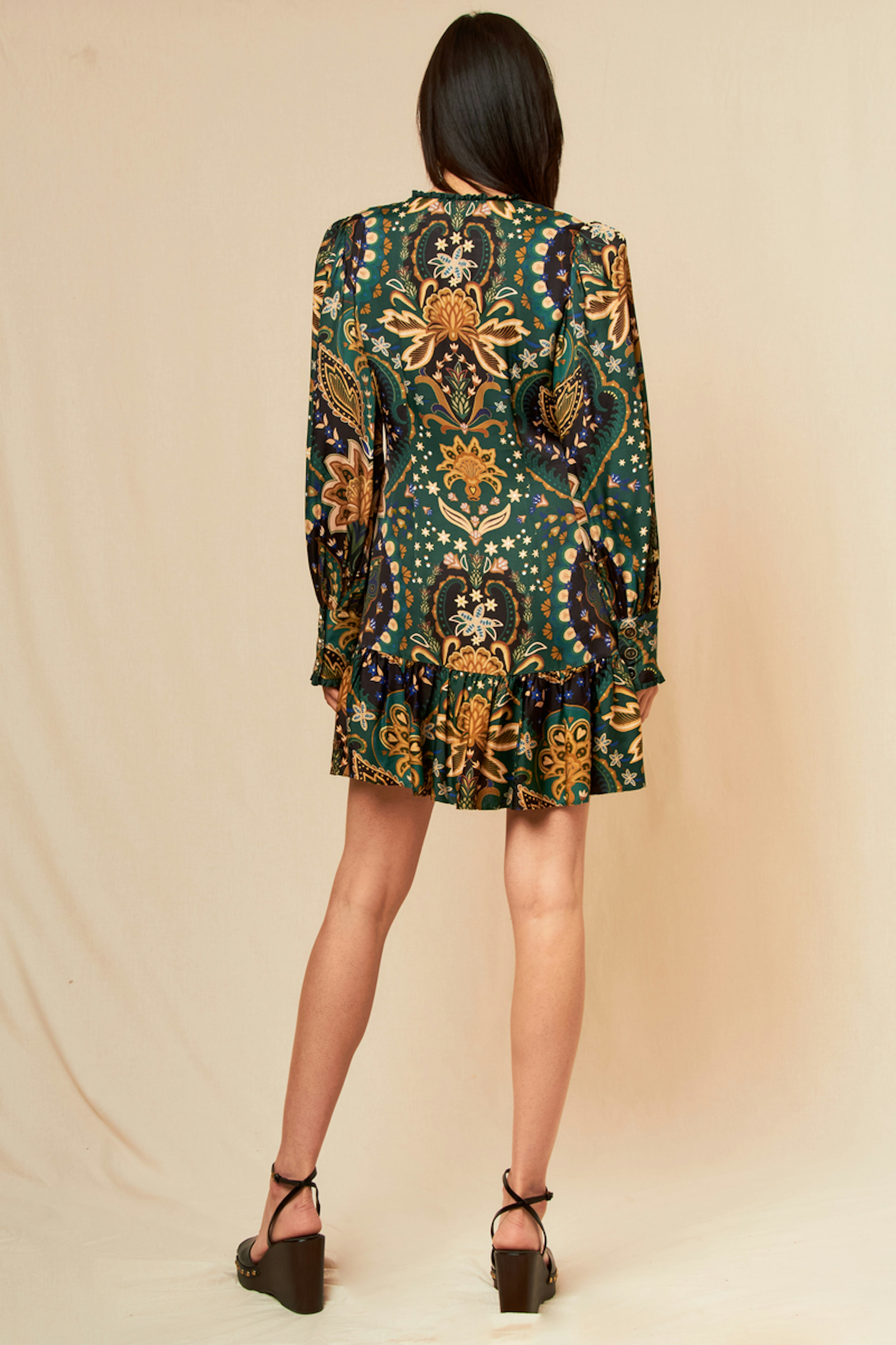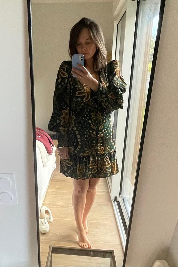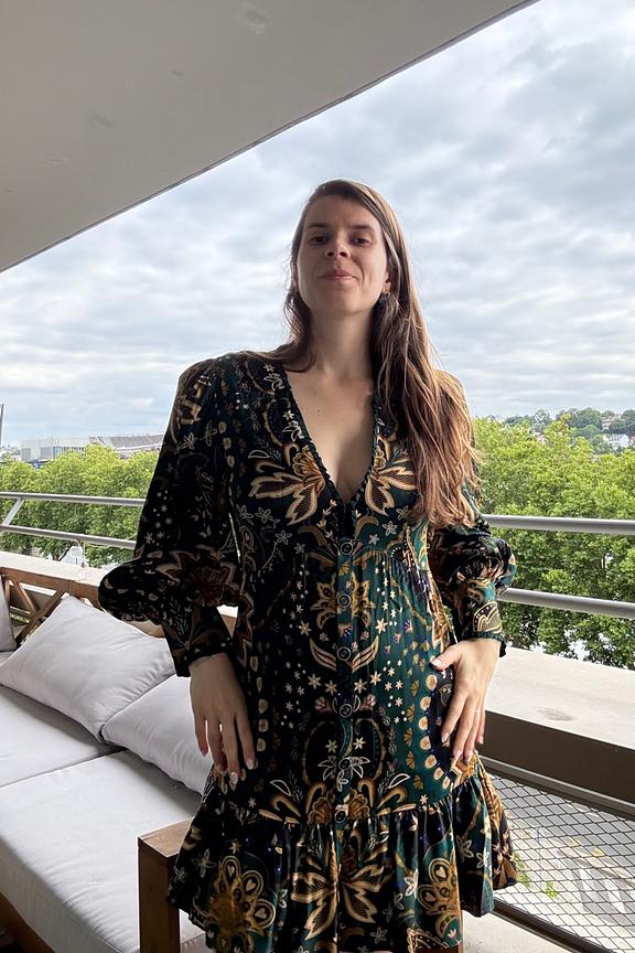 Ajoutez une touche bohème à votre allure avec des sandales à lanières et des boucles d’oreilles dorées. Parfait en toute saison. • Robe courte fluide • Manches longues bouffantes • Boutonnage central • Imprimé floral • Col en V