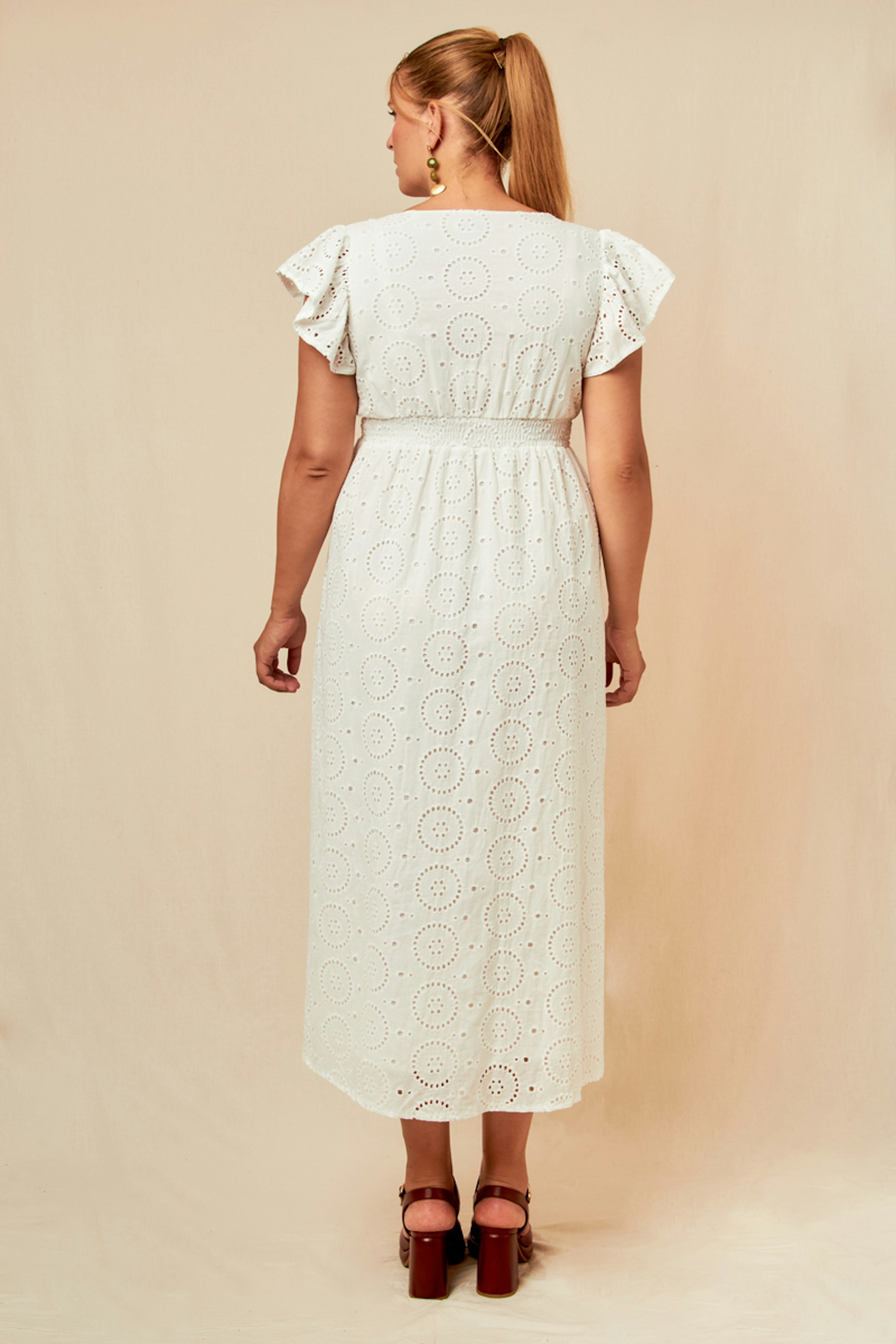 Associez cette robe avec des sandales en bois et des créoles dorées pour un look estival et sophistiqué. • Robe midi • Encolure en V • Manches courtes à volants • Taille empire • Motif broderie anglaise