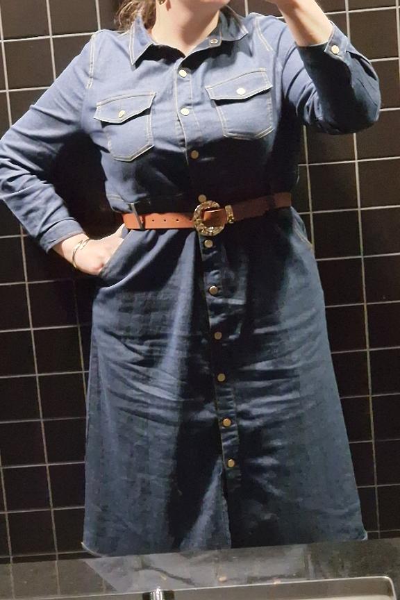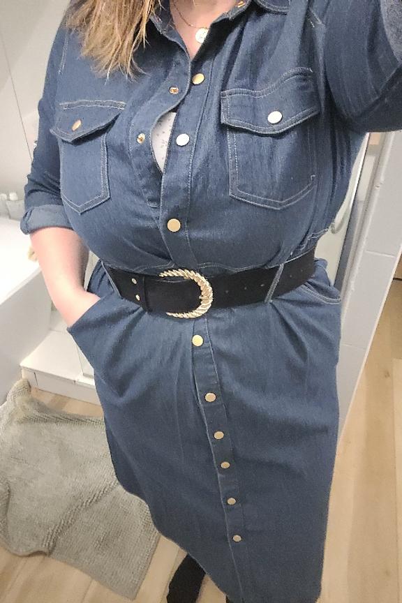 Flânez avec élégance en toutes saisons dans cette robe Amy & Clo, parfaite avec un ceinturon animalier et des escarpins noirs. • Robe chemisier en denim • Coupe cintrée • Boutons contrastants dorés • Poches latérales